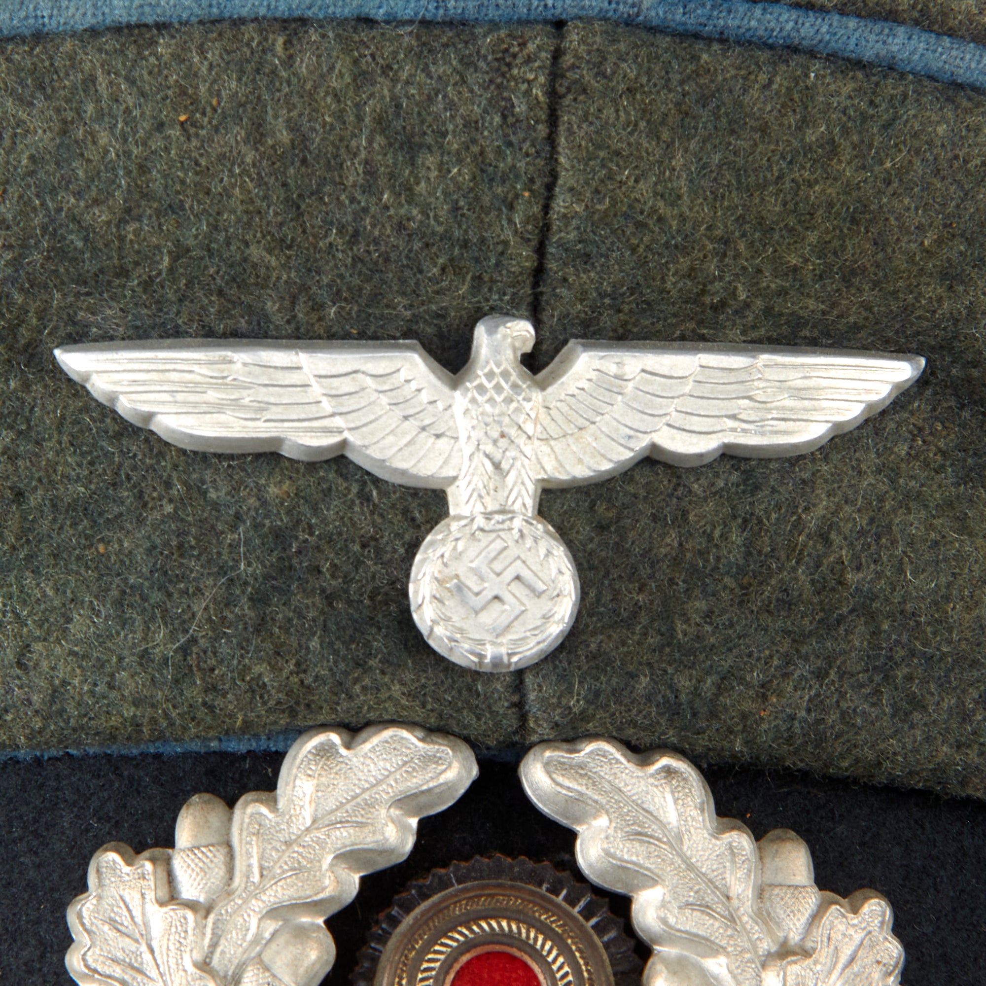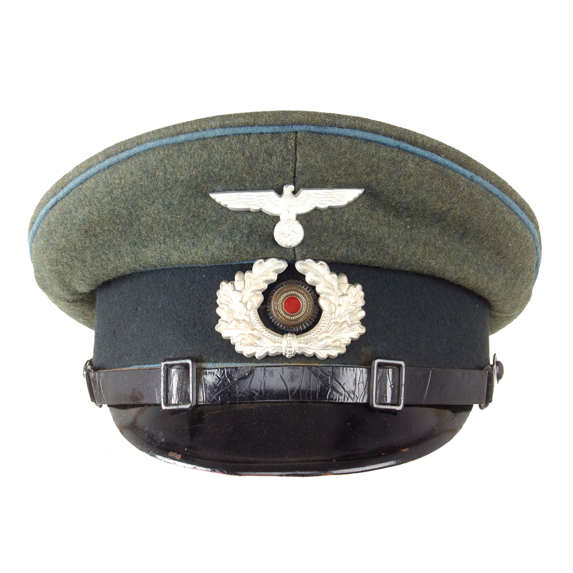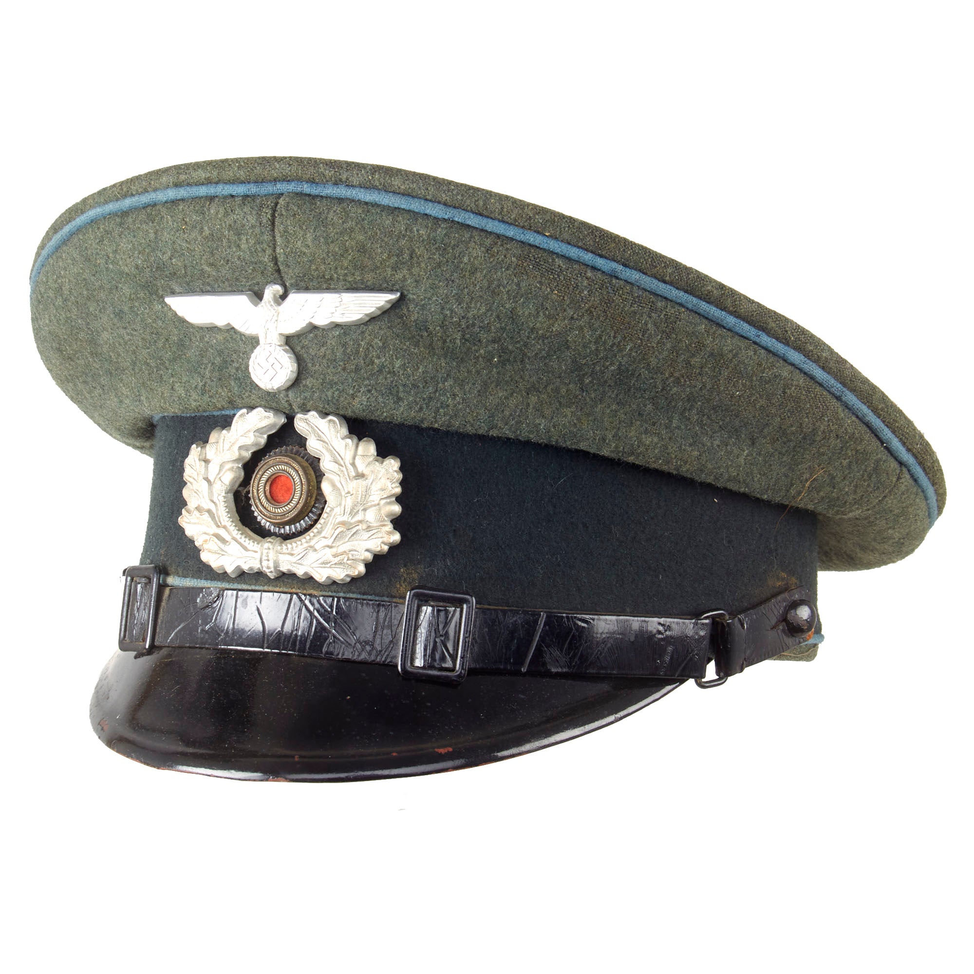 The visor cap (Schirmmütze) was an important part of the headgear worn by German uniformed military, civil, paramilitary and political organizations during the Third Reich. This was the standard cloth headgear worn as a part of the service uniform. Visor caps were worn outdoors as well as indoors, and were often required to be worn by all personnel on duty. Visor caps were made in versions specific to each organization and were often further differentiated through the use of insignia, colored piping, or style of chin cord, to indicate rank, role or branch. The insignia used on these caps ranged from simple stamped metal emblems, to elaborate hand embroidery. Visor caps were issued to enlisted soldiers and NCOs in the military and in some other organizations. Officers had to purchase their own hats, and lower ranks could choose to purchase caps that were of a higher quality than the rather basic, issue examples. The private purchase caps were generally made in very high quality, with fine materials. A wide variety of fabrics were used, from Trikot and doeskin, to heavy wool, or even lightweight white fabric for summer wear. In the military, issue of these caps was generally suspended shortly after the outbreak of the war, but they continued to be worn by some troops until the end of the war.