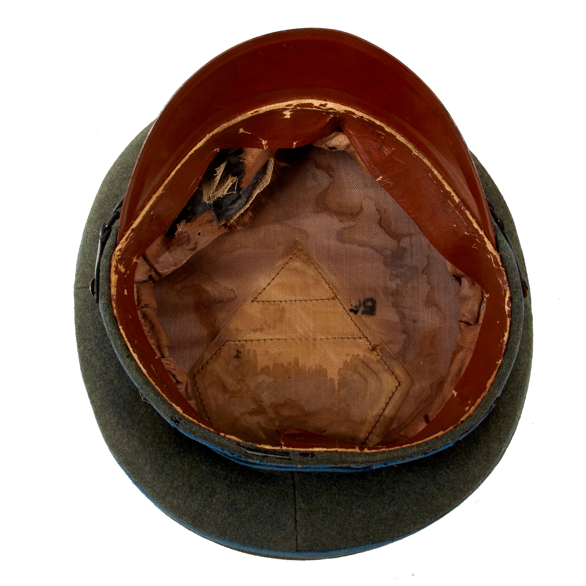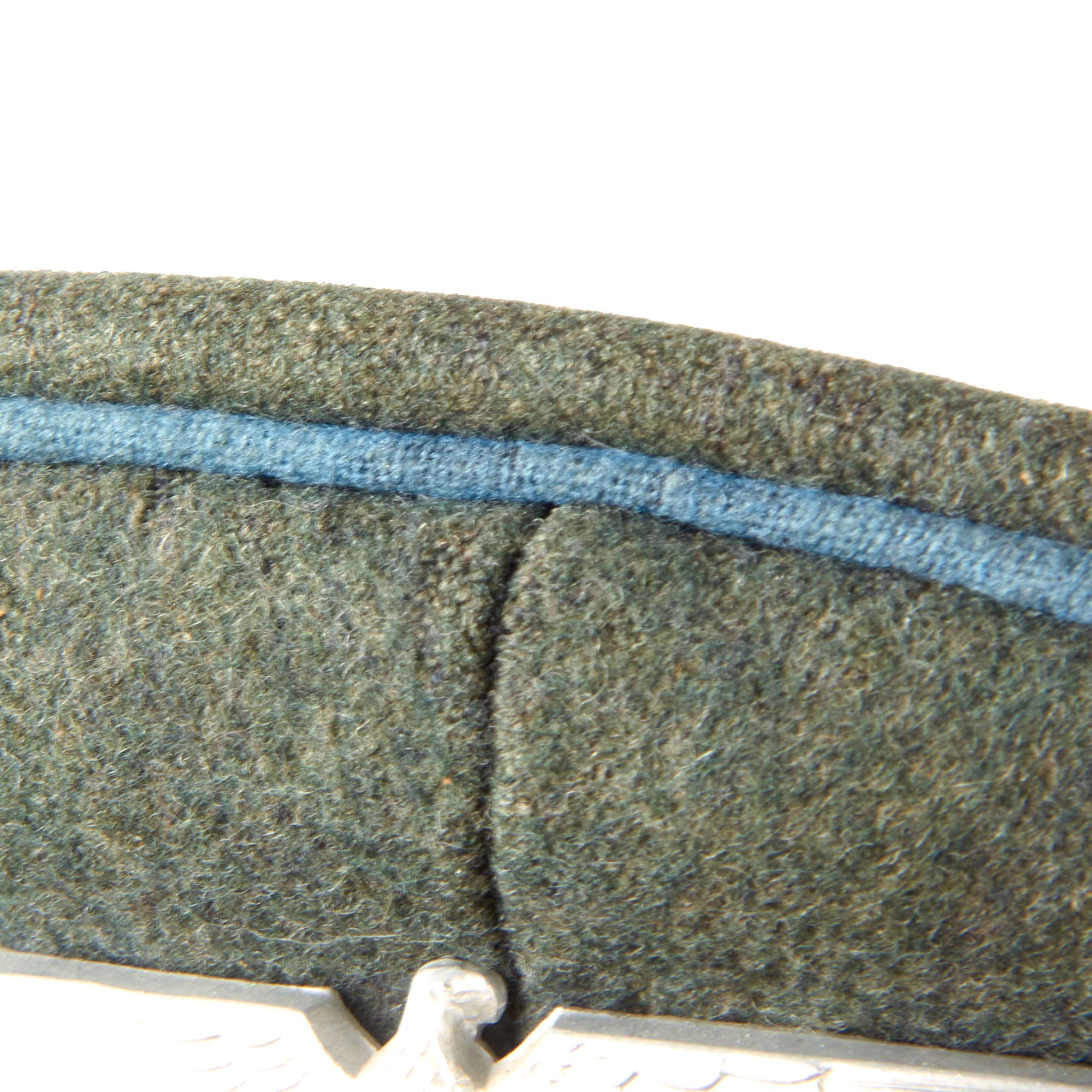 Original Item: Only One Available. This cap is a very nice example of a German WWII Wehrmacht Heer Army Transport and Supply Troop EM/NCO Schirmmütze (visor cap), and it really looks the business. It still has the original crown stiffener installed, so the sides have not sunken down over the years, giving it a lovely gently swept back shape. It features the typical feldgrau (field gray) "doeskin" weave wool construction with a flaschengrün (dark bottle-green) "badge cloth" band and a traditional high forward crown. It also has matching Hellblau (Light blue) ;piping along the top edge and flanking either side of the band. This is the Waffenfarbe (Corps Color) for the Transportation troops (Fahrtruppen) until 1942 and Supply troops (Nachschubtruppen) from 1942 onwards.