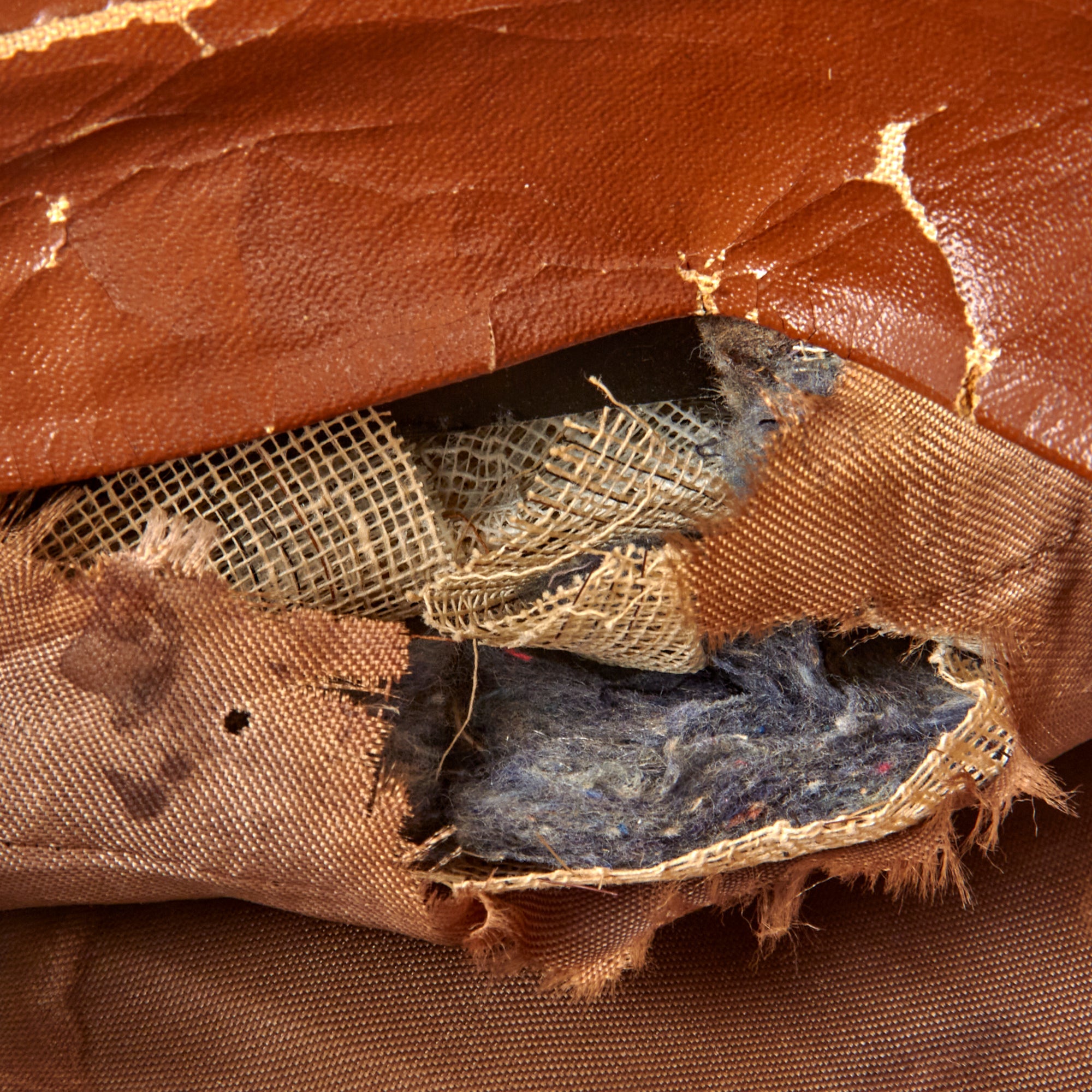 We have not been able to find much about this maker, and they are most likely one of many smaller brands that produced caps during the war. There is also a faint 55 size stamp on the inside of the crown, and we have used a hat sizer to confirm this. The sweatband of the cap is brown finished oilcloth, and shows wear and cracking around the bottom edge, with some tears at the top.