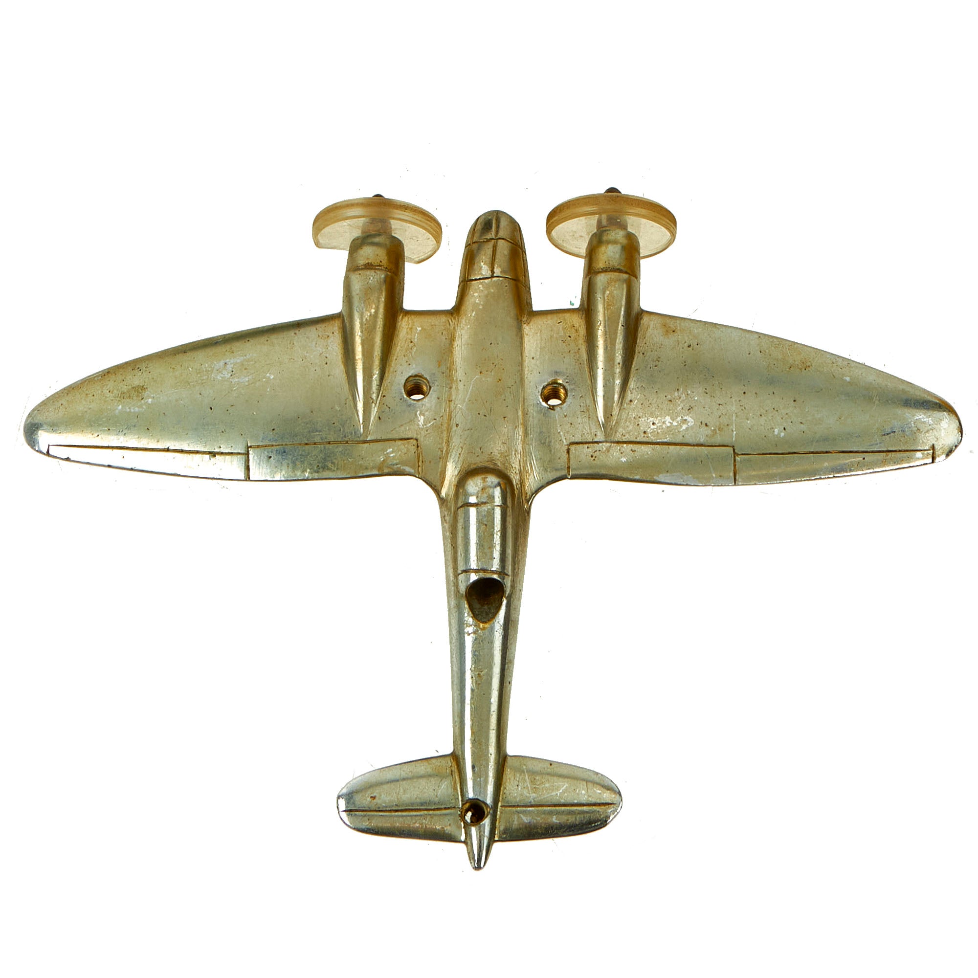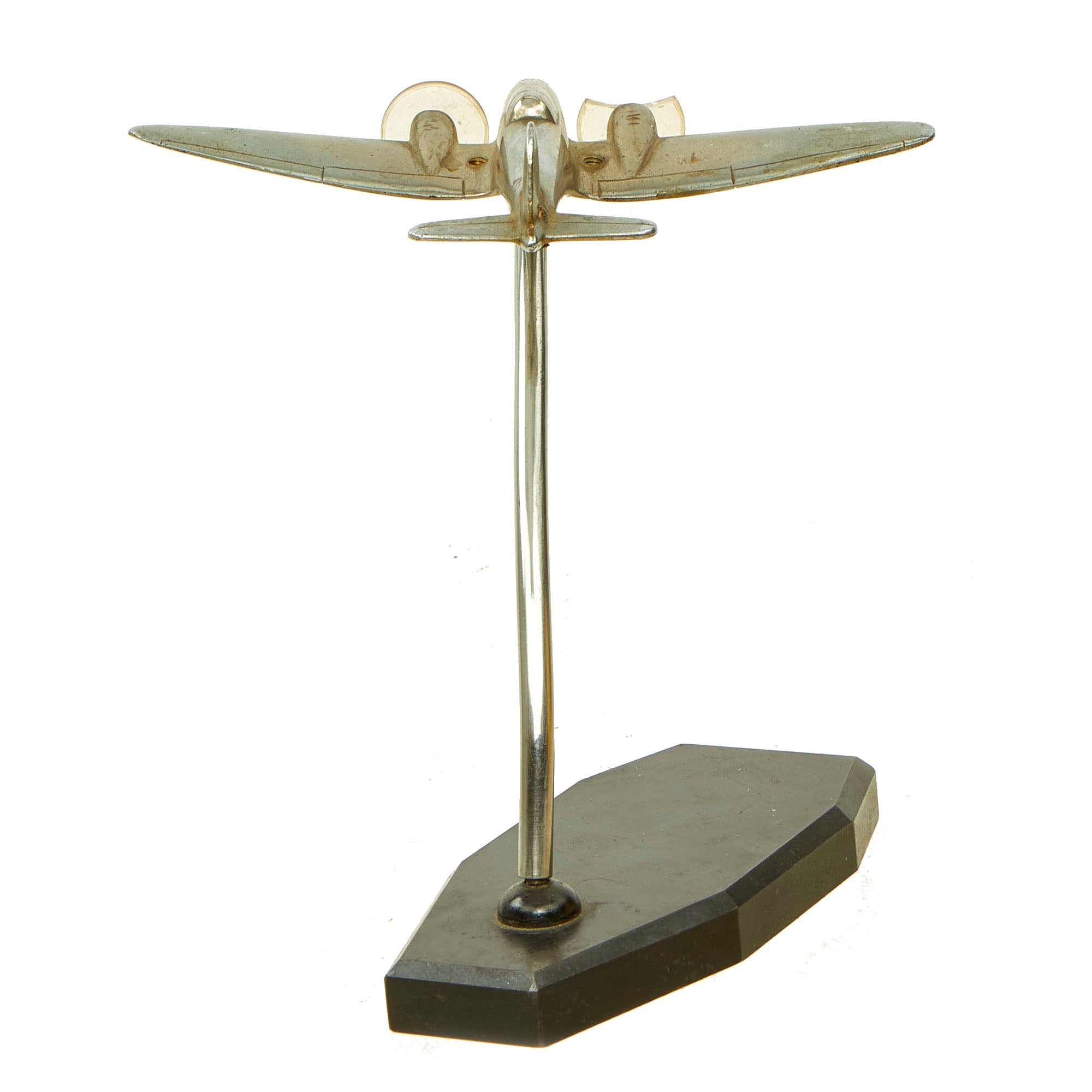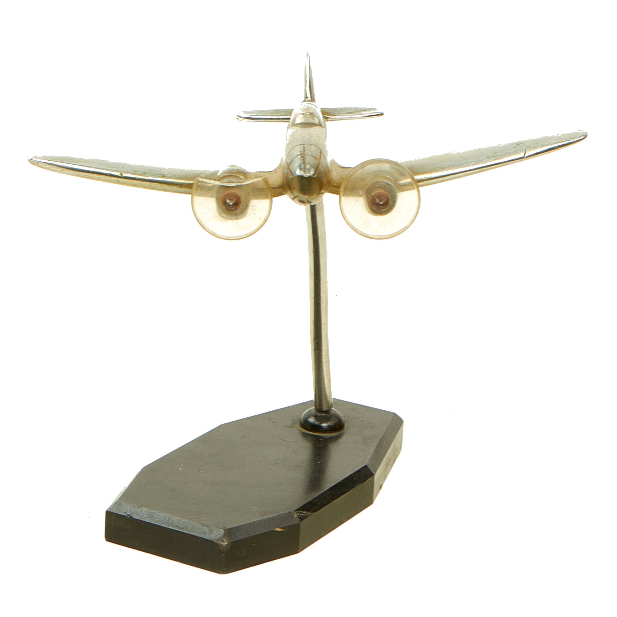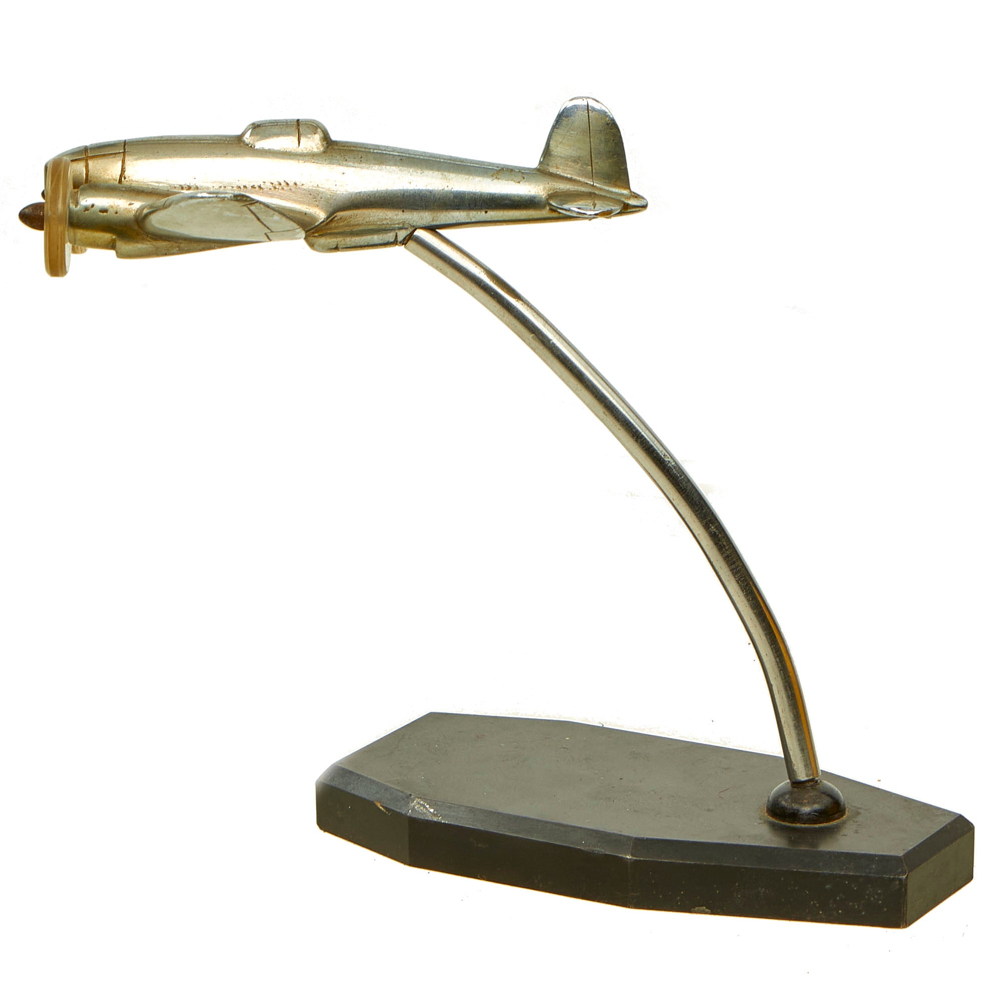 Condition is very good, though one of the plastic "propellers" on the front of the plane has had the top 1/3 crack off. There is also some light denting and damage to the plane body itself, which also has had three threaded holes added to it. It possible that it was some type of training piece, later converted for use on a desk.