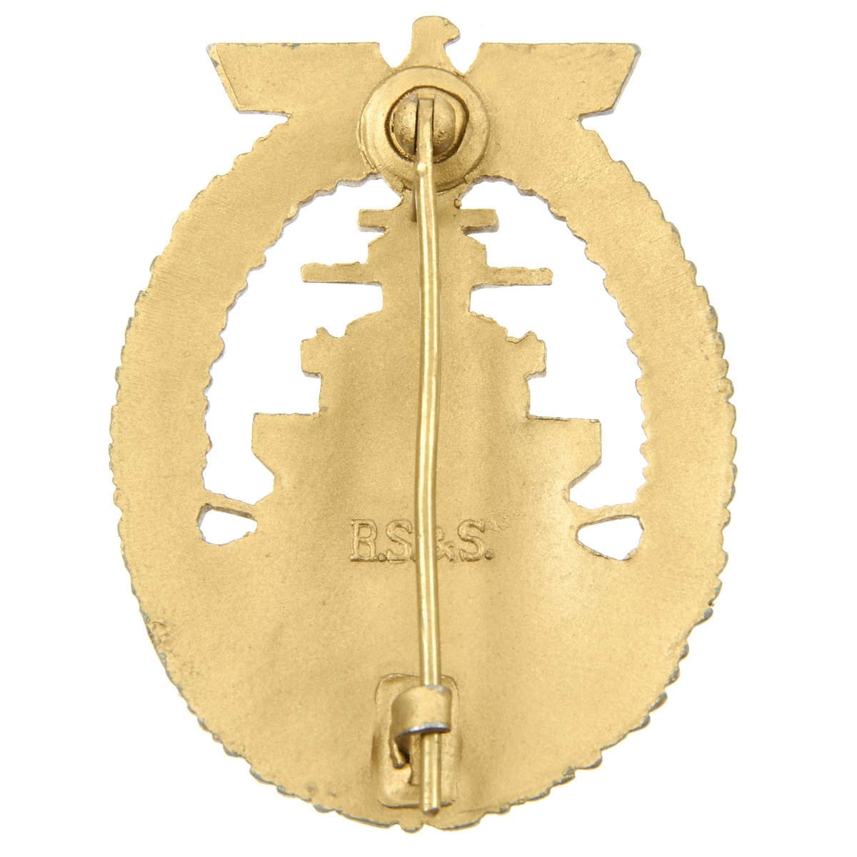 Original Items: Only One Available. This is a wonderful condition Flottenkriegsabzeichen der Kriegsmarine - High Seas Fleet Badge by Richard Sieper und Söhne (and sons). Features correct ball hinge, known fakes omit this feature. Extremely fine quality badge in Kriegsmetall. Maker marked RS & S. Near mint condition with some nice light patina.