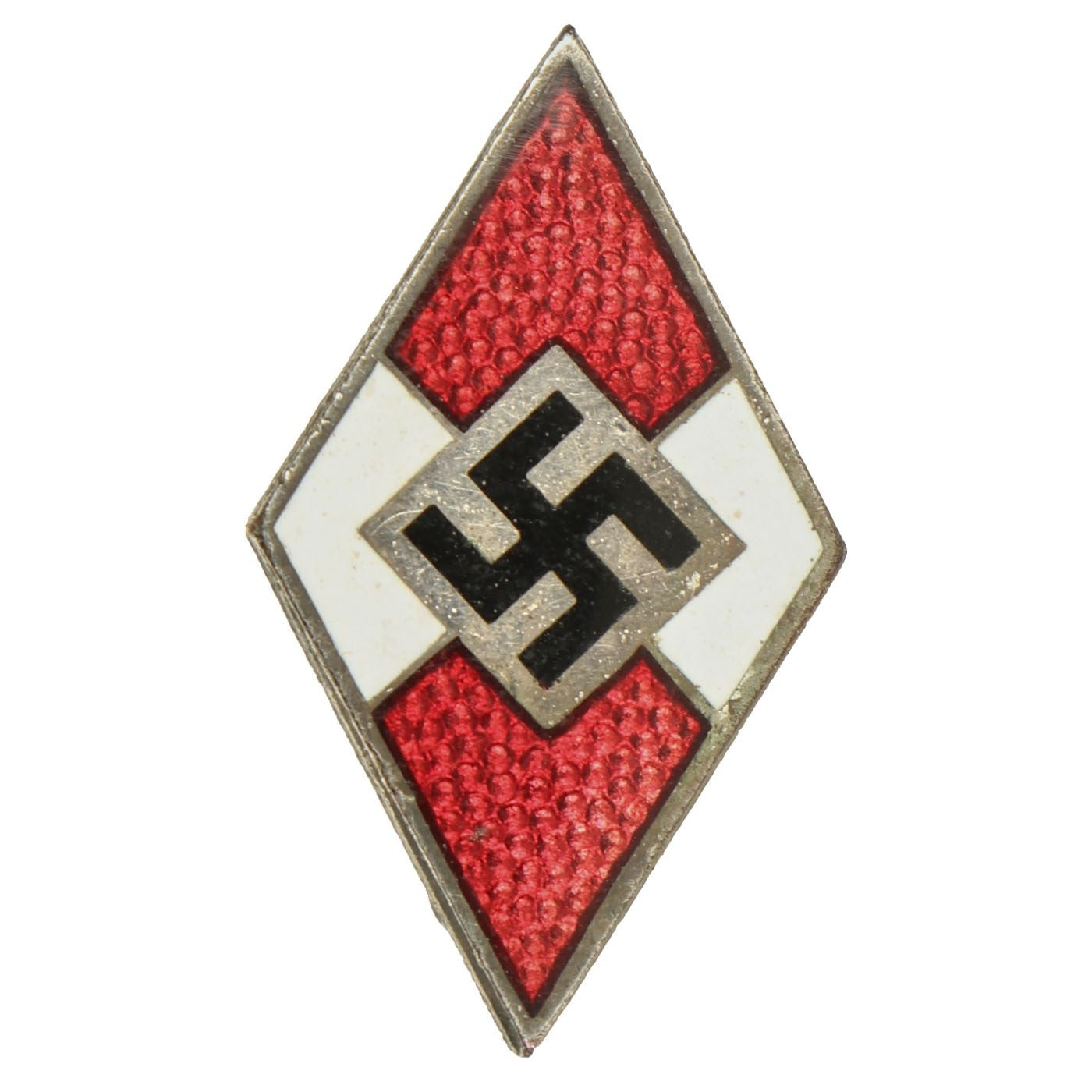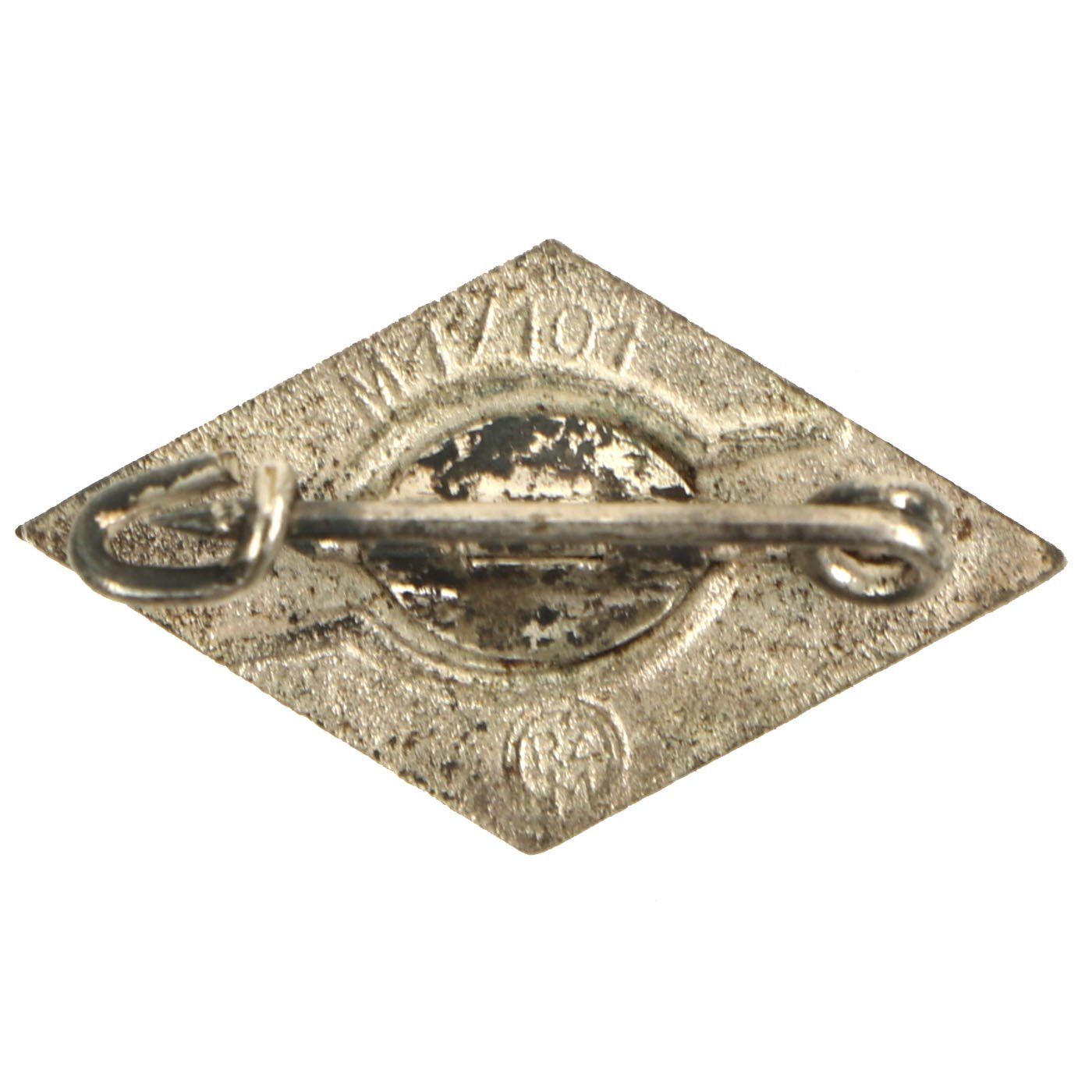 Original Items: Only One Available. This is a very nice German WWII HJ Mützenabzeichen (HJ Cap Badge), marked RZM M1/101 for manufacture by Gustav Brehmer of Markneukirchen in Saxony, Germany. It is constructed out of a die stamped ;nickel alloy base that has been silver washed and contains white, black, and translucent red enamel work. The rhomboid diamond shaped obverse depicts the AH Youth emblem, which consists of a black mobile swas (hook cross) above a silvered square diamond which is surrounded by alternating white and red translucent pebbled quadrants and is all surrounded by a small silvered border. The full back reverse has a horizontally soldered on pin assembly and is maker marked M1/101 on the top and ((RZM)) on the bottom. The pin measures approximately 25mm tall by a 13mm wide.