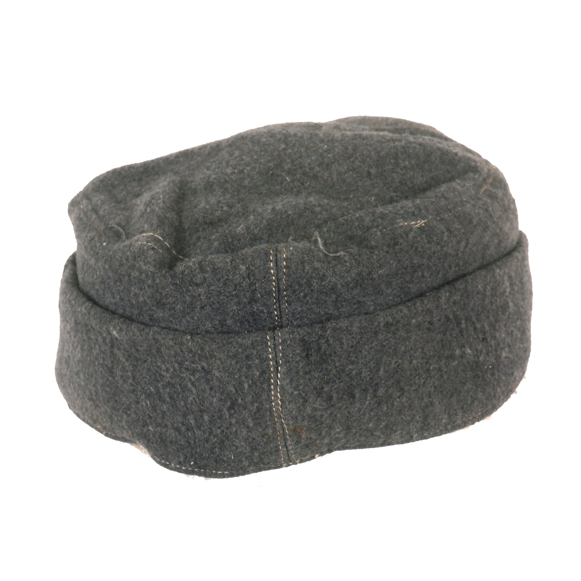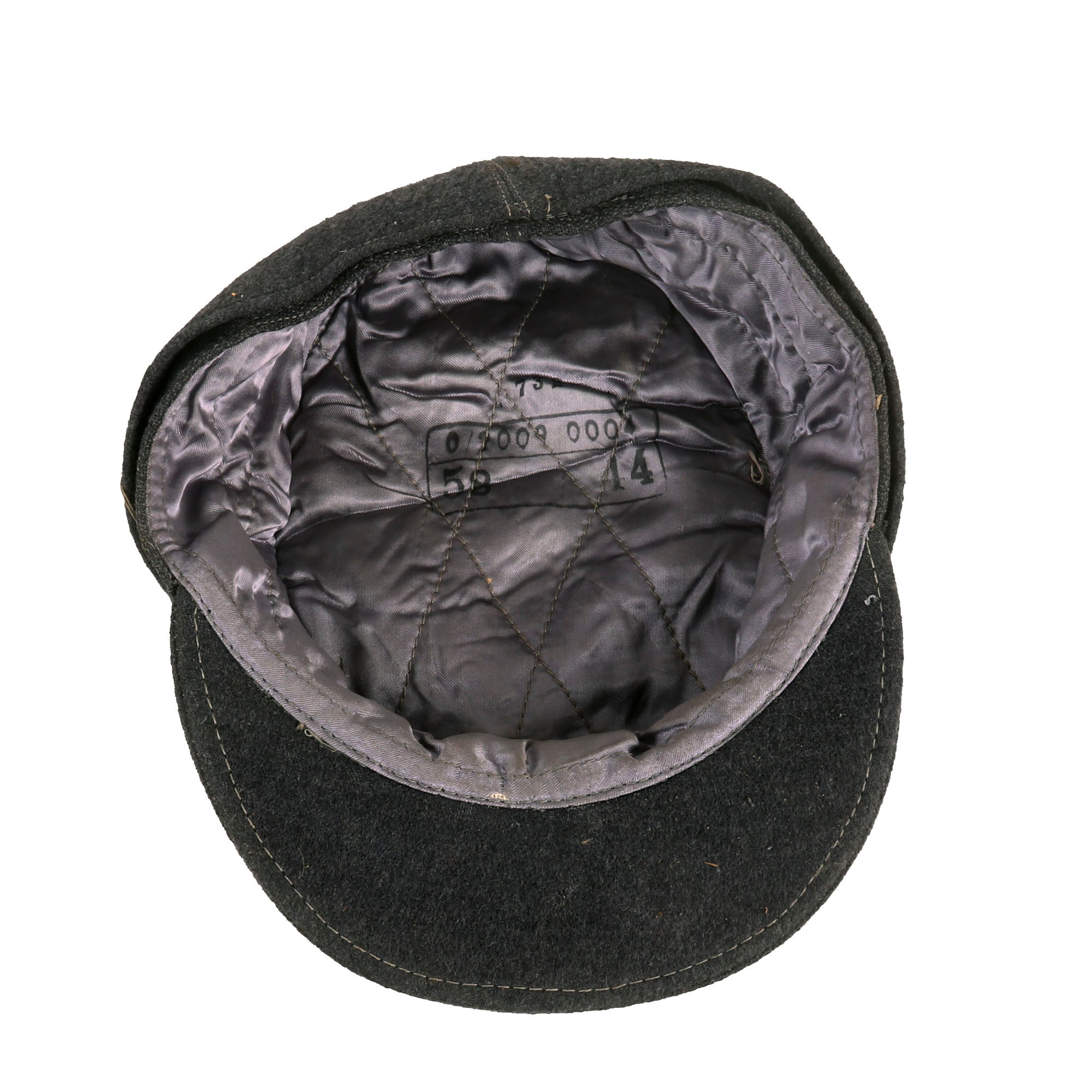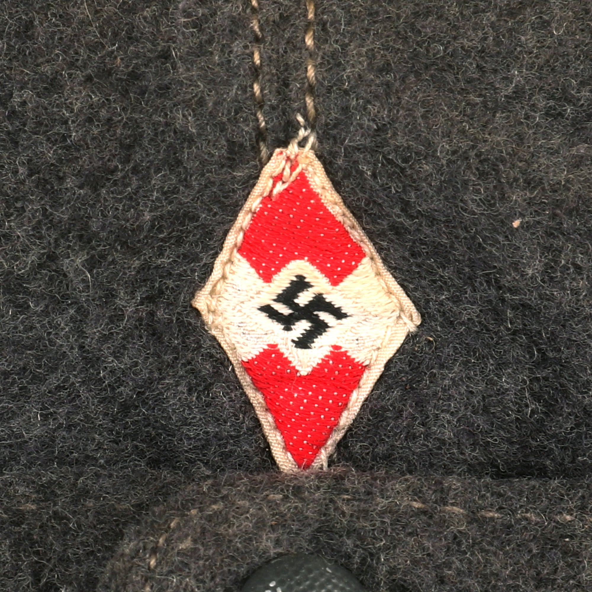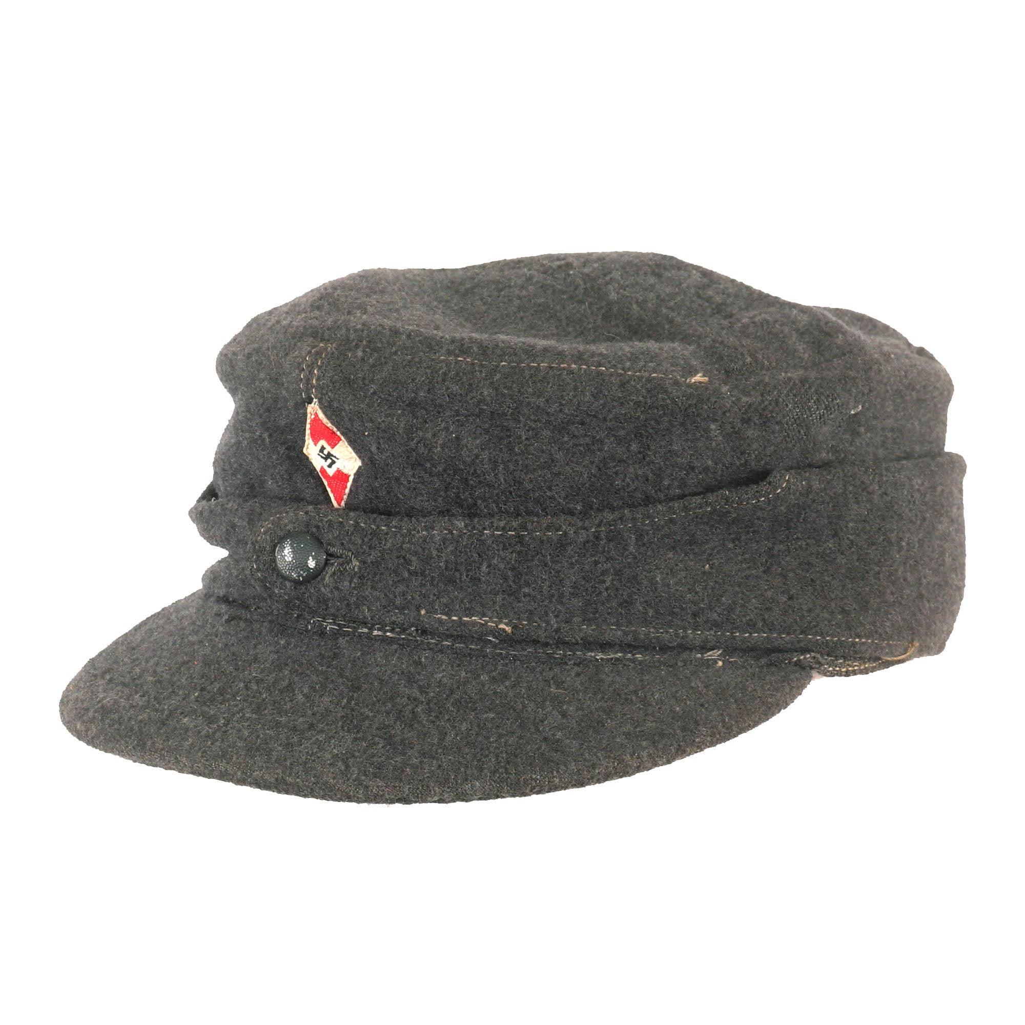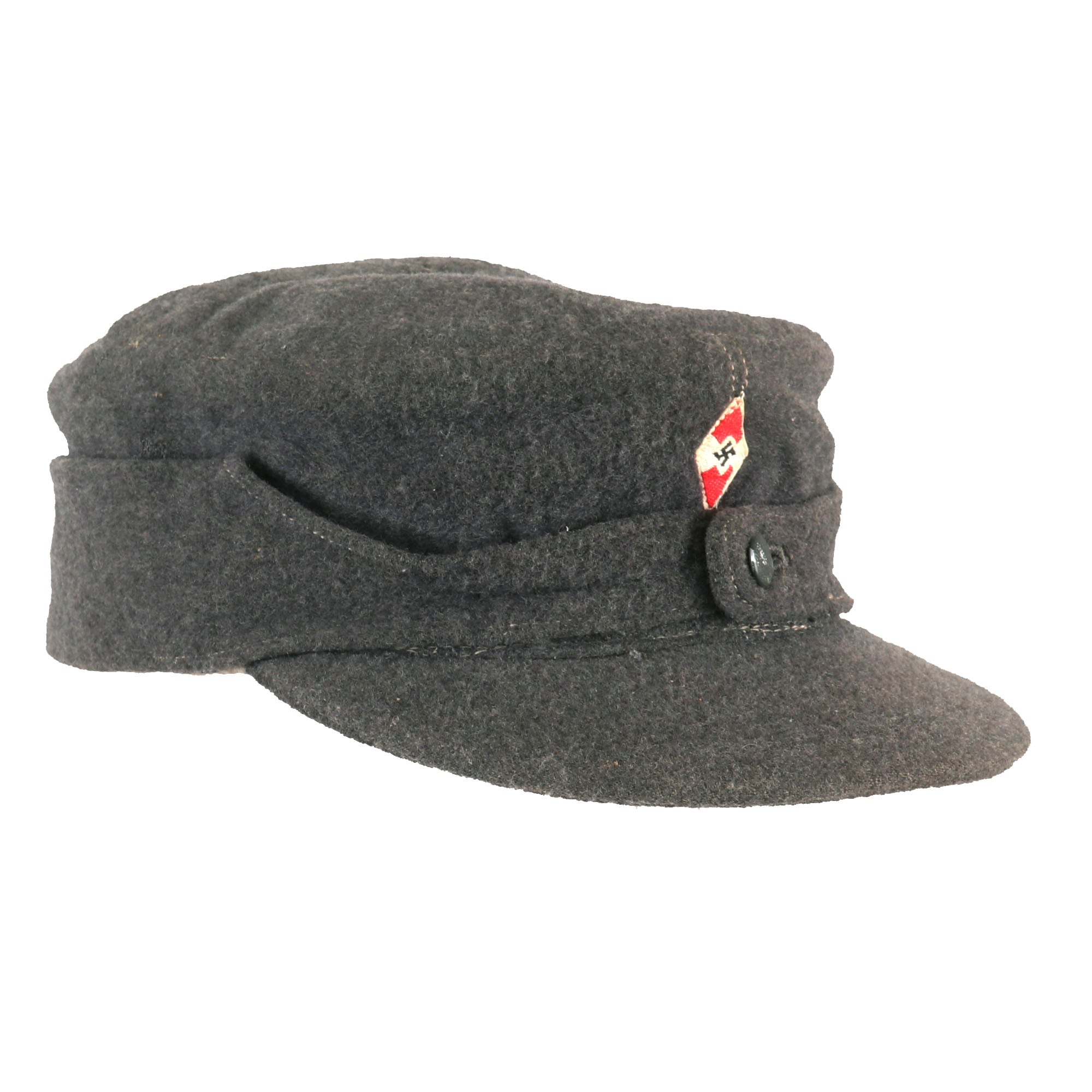 Original Item: Only One Available. This is a great looking German WWII H J National Youth Organization M43 Feldmütze (Field Cap), marked with Size 58 and dated 1944. These were the standard headgear for H J members who were attached to the Luftwaffe as auxiliaries, and who manned anti-aircraft Flak cannons in the defense of the Third Reich as the war drew to a close. It is constructed of Luftwaffe bluish gray worsted wool gabardine cloth, with fold-down panels with rounded scallops to the front and forward sides, covering the entire neck on the sides and rear when in use. When not in use, the panels are raised with their ends resting upon the visor, being joined together by a single pebbled aluminum button, which is painted Luftwaffe blue. The visor is reinforced with cardboard, and covered in matching gabardine cloth.