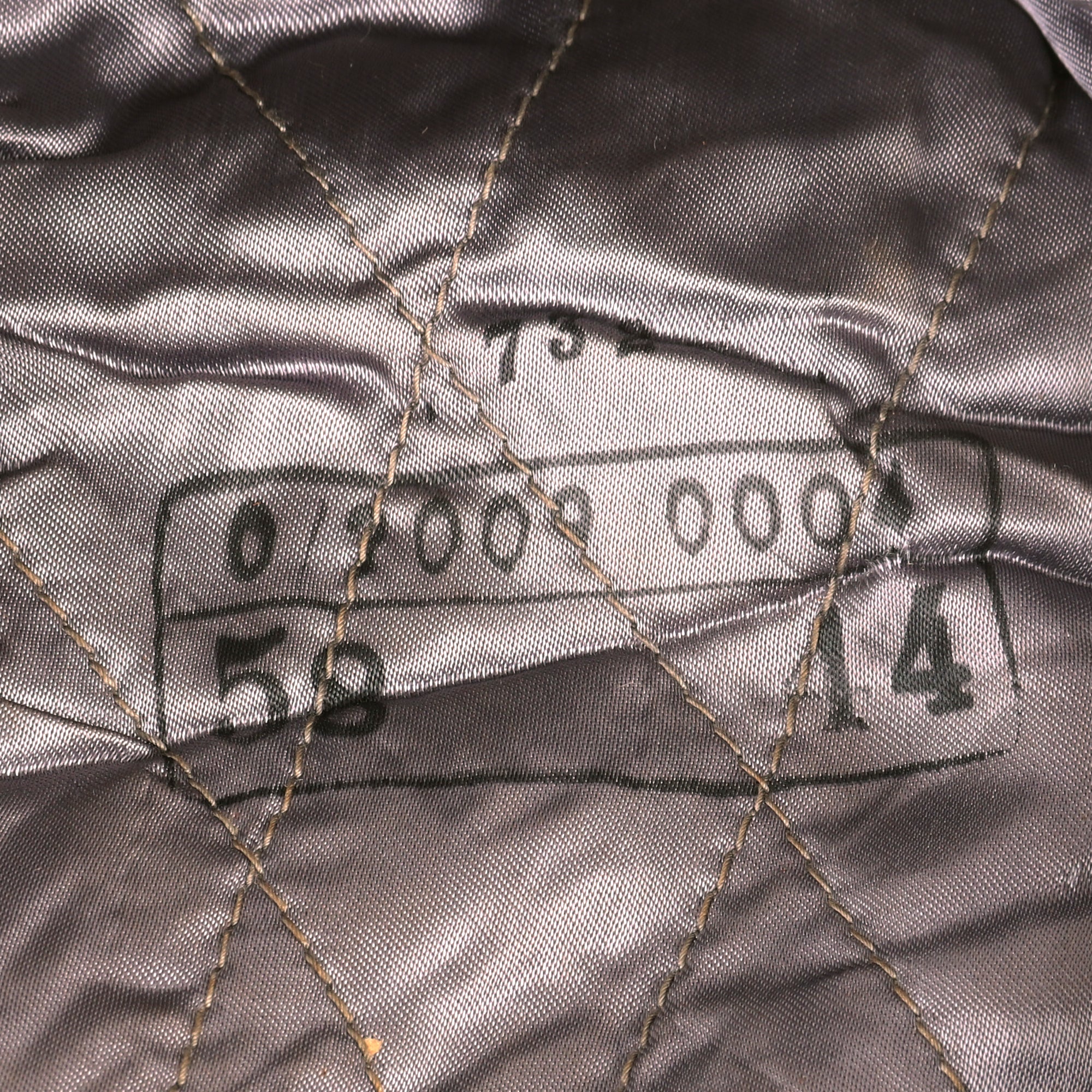 The interior of the cap is lined with gray blue rayon, which has very minor sweat staining around the contact areas but is in very good condition overall. There is a solid RBNr. stamp on the crown, which looks to read 0 / 2009 / 0004, and below this is 58, and to the right a faint 44. These are inside a rectangle, the usual way markings are on these caps, and there is the number 732 above. The visor is still quite well shaped, with just a bit of bending to the stiffener, and no real cracks.