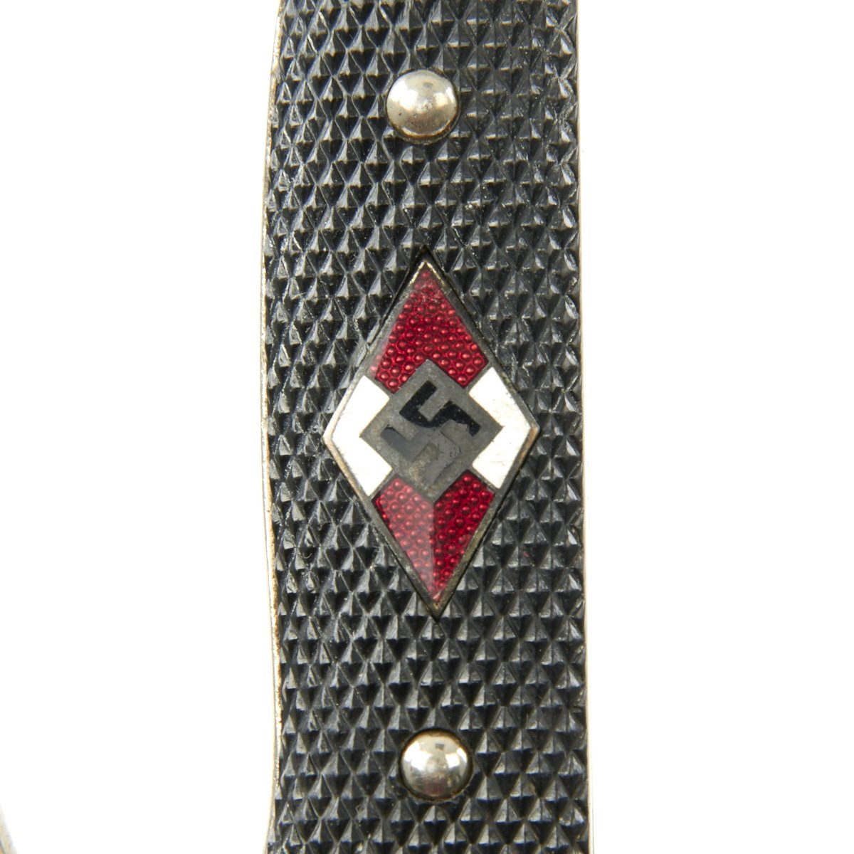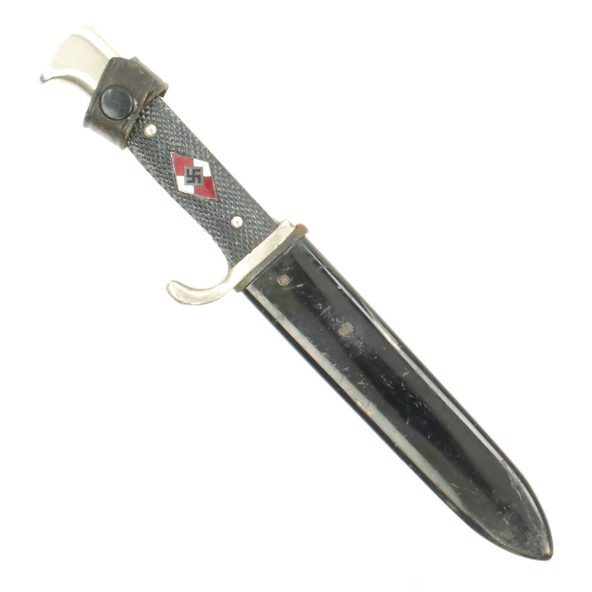 Original Item: Only One Available. This is a very nice example of the classic later pattern HJ Knife, produced by the well-known Solingen based firm of F.W. Höller. These given to boys who were educated in the paramilitary organization, which they often continued to carry into their military service.. Unlike the early pattern knives, these have a thicker blade with a raised ricasso, which significantly strengthened the blade. They also do not have the HJ motto etched on the blade, and often are marked not with a maker, but a German RZM Code. This example however is both maker mark, as well as the code.