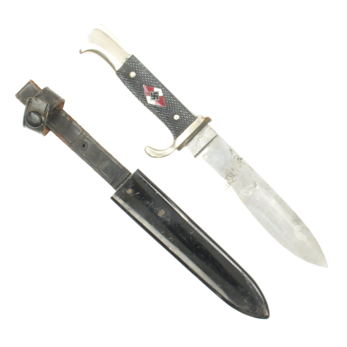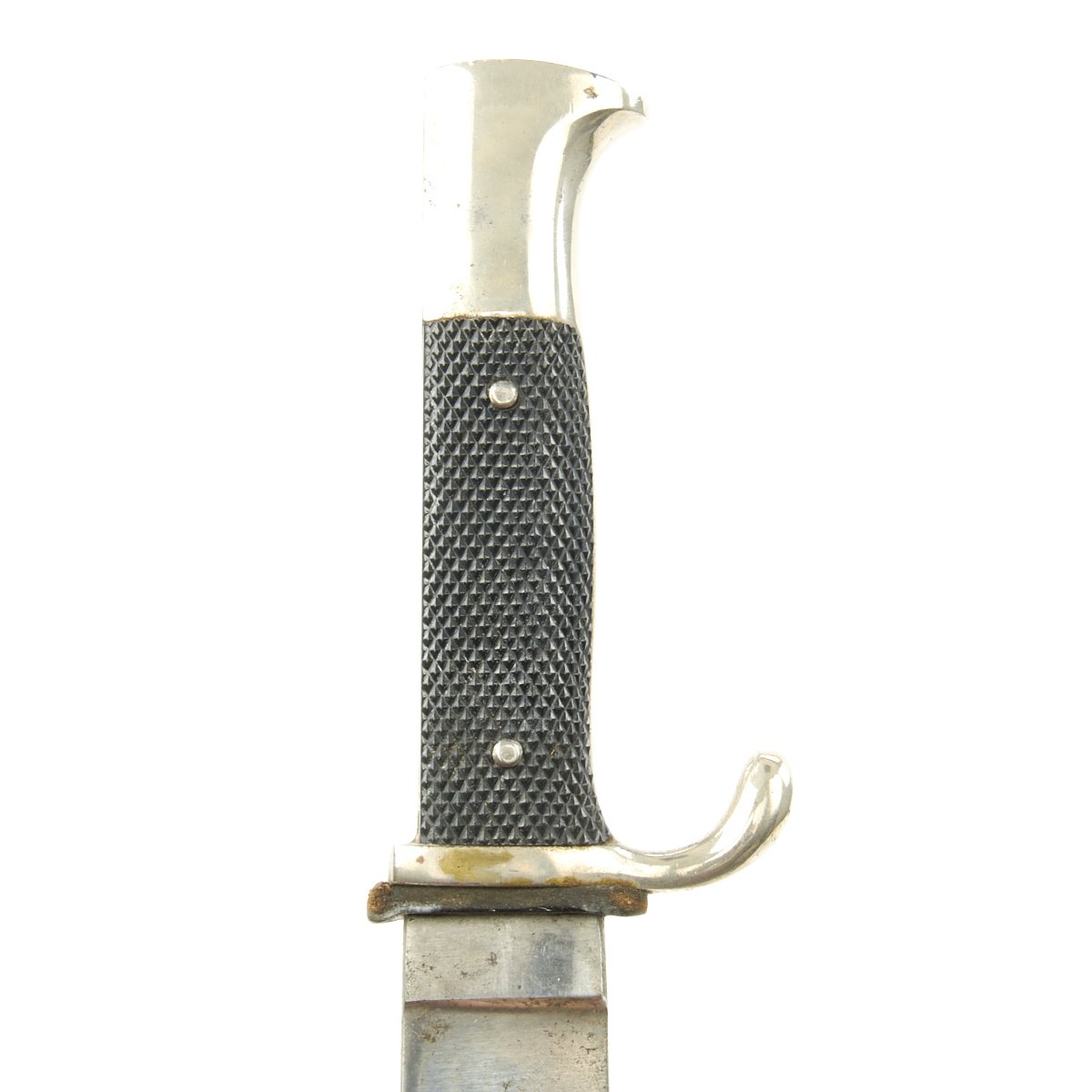 AH believed German youth to be the future of his 3rd Reich. The HJ (AH Jugend) was formed officially in 1935, and with the exception of NSDAP ideology indoctrination was very similar to the Boy Scouts. Beginning at about the age of ten years, both boys (AH Jugend) and girls (Bund Deutscher Mädel) were enlisted in the Party-run organization. The boys only were given HJ Knives after having passed minor exams. The knives had nickeled hilts with black checkered grip plates. The obverse plate was fitted with an enameled HJ swas insignia. Through 1937, these knives were etched with the motto of the organization, Blut und Ehre! (Blood and Honor!). Examples produced after this date were made with plain blades usually bearing an RZM marking.