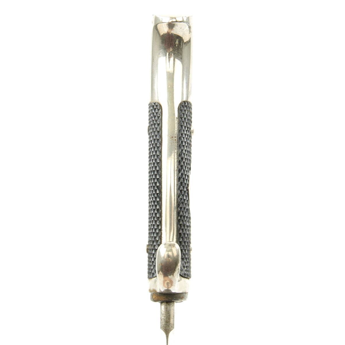 The hilt has almost all of the nickel plating remaining, with a few specks missing and a bit of staining. The grip plates are the black checkered variety and are in excellent condition. They are retained by steel rivets with dressed obverse heads. The enamel grip insignia retains very bright colors and has a clean surface, with completely intact enamel. The plating has worn off the brass portions though, so they are now a dull oxidized green color.