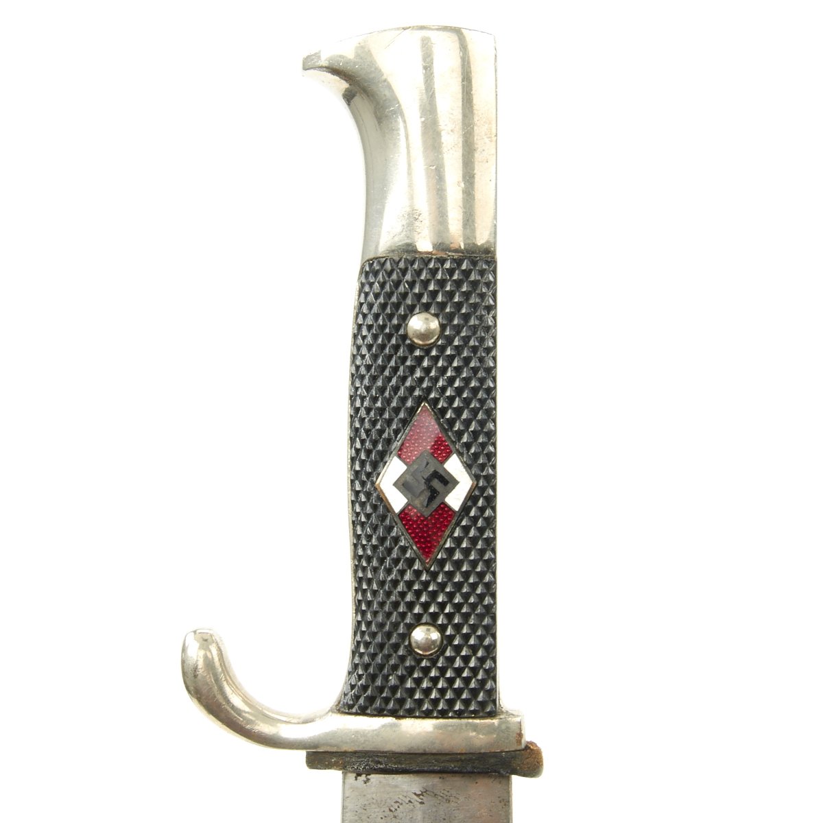 The HJ Leaders were professionals in charge of the training and NSDAP education of the German Youth. They wore a special dagger consisting of silvered hilt fittings with blue-black leather-covered scabbard. The grip was composed of tightly wrapped silver wire, over a wood base. The pommel cap featured an HJ diamond on top, complete with swas. The upper scabbard fitting portrayed an open-winged HJ eagle with swas cut into the bird's chest. The blade was etched with the HJ motto, Blut und Ehre!
