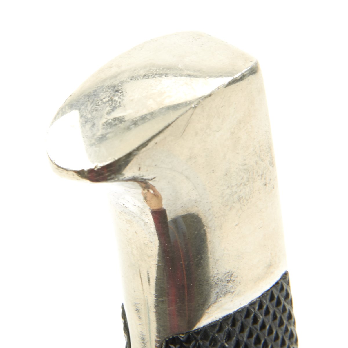 The blade has the original crossgrain throughout both sides, a hallmark of German WWII era blades, though there is also a bit of light oxidation in places, and the usual light runner wear. It does not appear to have been sharpened, and still has the original factory edge, which is somewhat dull. The original leather blade buffer is in place. The reverse of the blade bears the maker name of F. W. HÖLLER / SOLINGEN, surrounding the trademark Höller "Thermometer" emblem. This is a well-known maker from Solingen, the famous "City of Blades" in Western Germany, which produced many fine edged weapons.