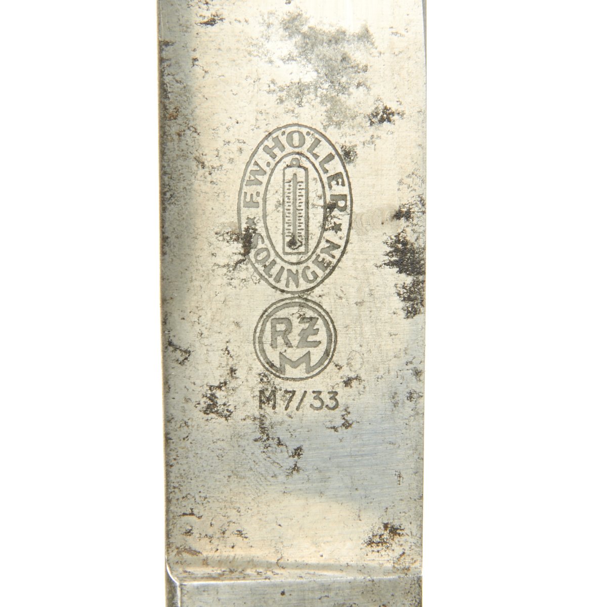The reverse ricasso is also stamped with an RZM circle, with the code M7/33. The Reichszeugmeisterei, or RZM, was was based at the Brown house in Munich and NSDAP party headquarters in Berlin. The RZM ensured that the manufacturers of military items were consistent in design, quality of materials and other characteristics of the items. It also defined standards of design, manufacturing and quality and published an authoritative color chart for textiles. The M7 in the code stands for knives/daggers, with F.W. Höller being contractor number 33.