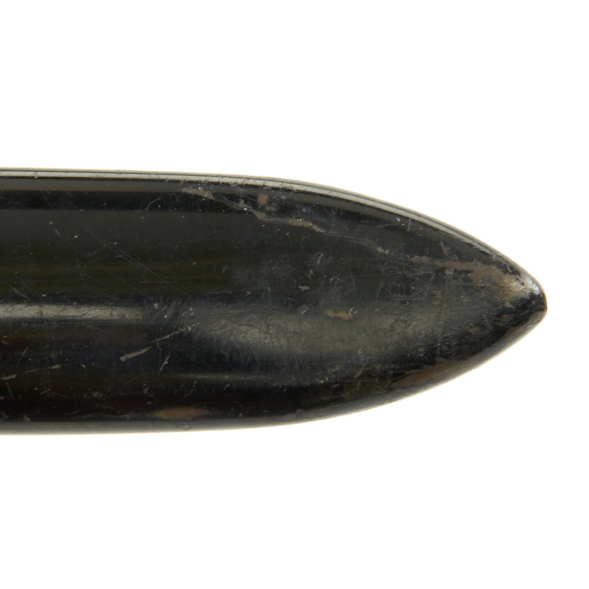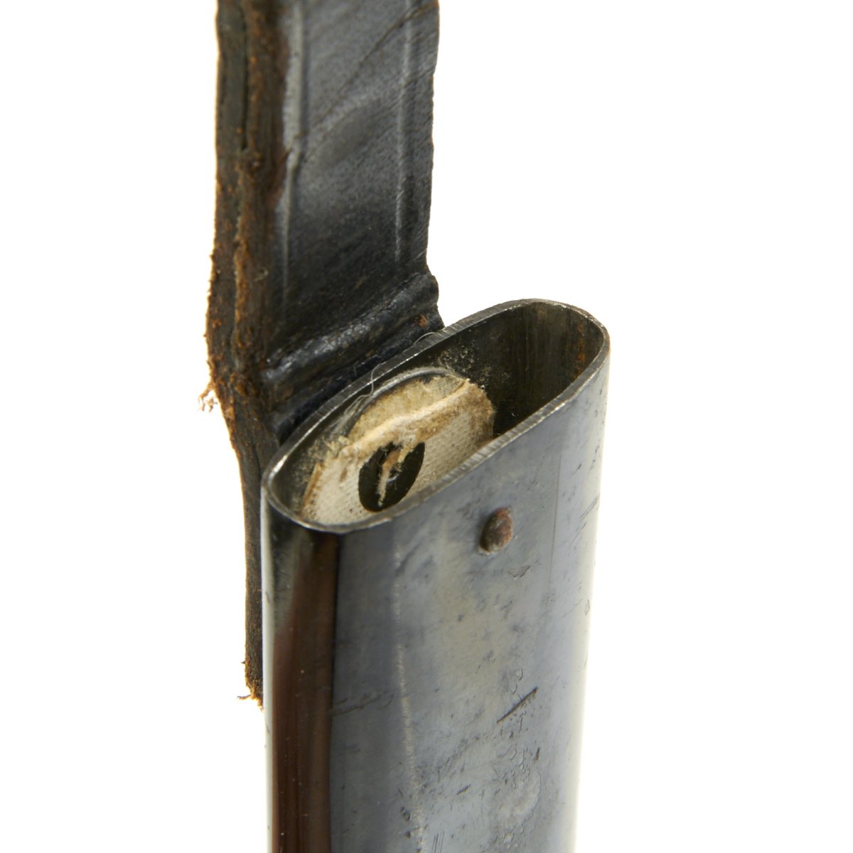 The scabbard is completely straight throughout with more than 90% of the original enamel finish present. It is worn through to the steel in several places, with a few scratches and chips, however there is minimal age "crazing" in the finish. The belt loop is black finished leather, and is intact with the expected wear of age. The securing strap is intact, with a functional snap.