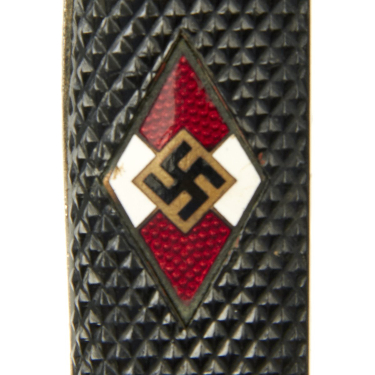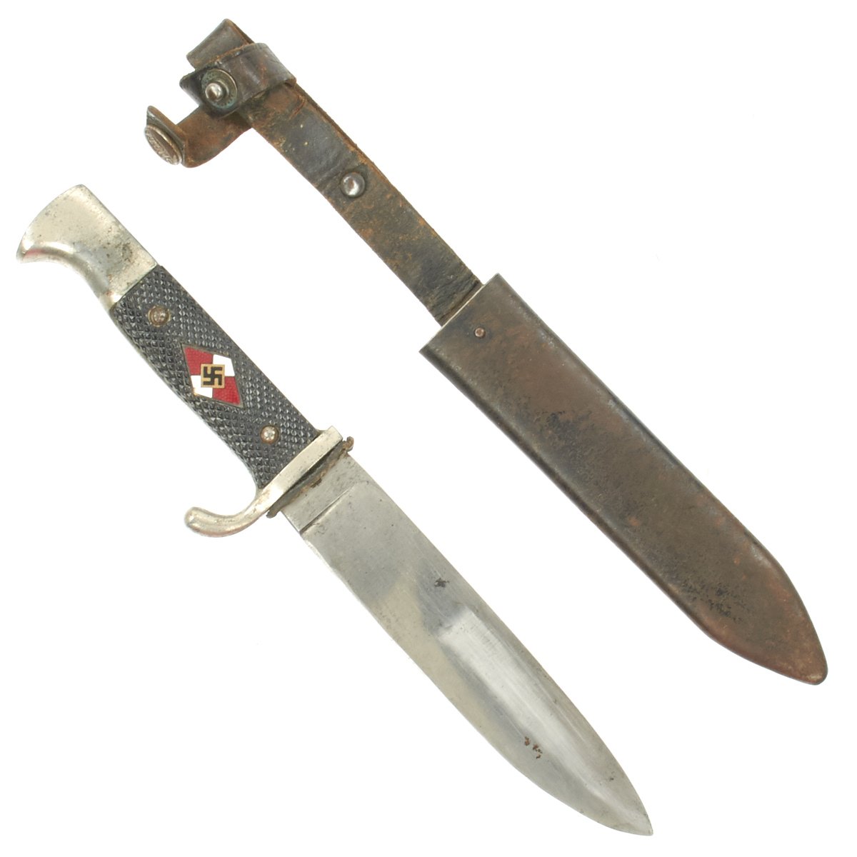 AH believed German youth to be the future of his 3rd Reich. The HJ (AH Jugend) was formed officially in 1935, and with the exception of NSDAP ideology indoctrination was very similar to the Boy Scouts. Beginning at about the age of ten years, both boys (AH Jugend) and girls (Bund Deutscher Mädel) were enlisted in the Party-run organization. The boys only were given HJ Knives after having passed minor exams. The knives had nickeled hilts with black checkered grip plates. The obverse plate was fitted with an enameled HJ swas insignia. Through 1937, these knives were etched with the motto of the organization, Blut und Ehre! (Blood and Honor!). Examples produced after this date were made with plain blades usually bearing an RZM marking.