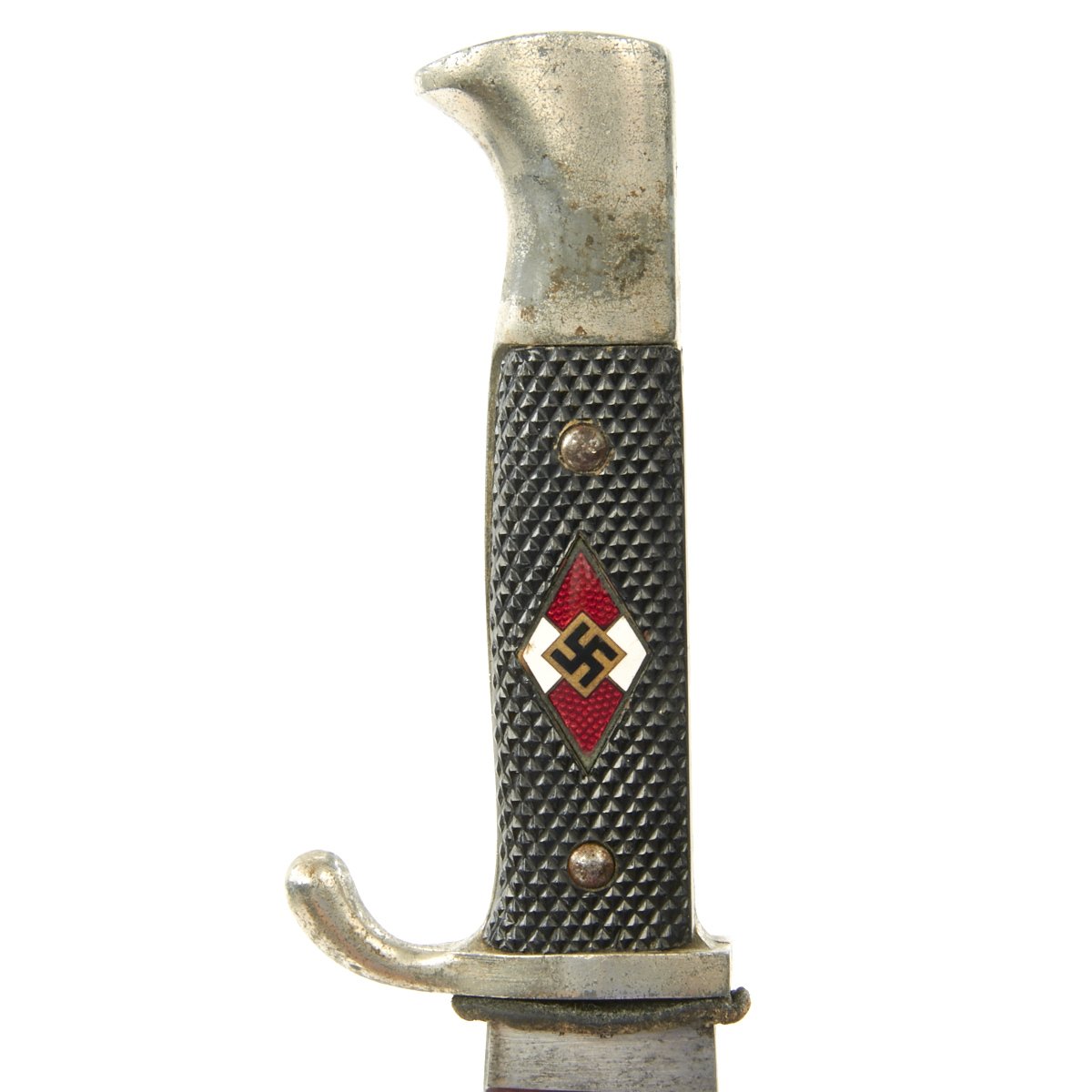 The HJ Leaders were professionals in charge of the training and NSDAP education of the German Youth. They wore a special dagger consisting of silvered hilt fittings with blue-black leather-covered scabbard. The grip was composed of tightly wrapped silver wire, over a wood base. The pommel cap featured an HJ diamond on top, complete with swas. The upper scabbard fitting portrayed an open-winged HJ eagle with swas cut into the bird's chest. The blade was etched with the HJ motto, Blut und Ehre!