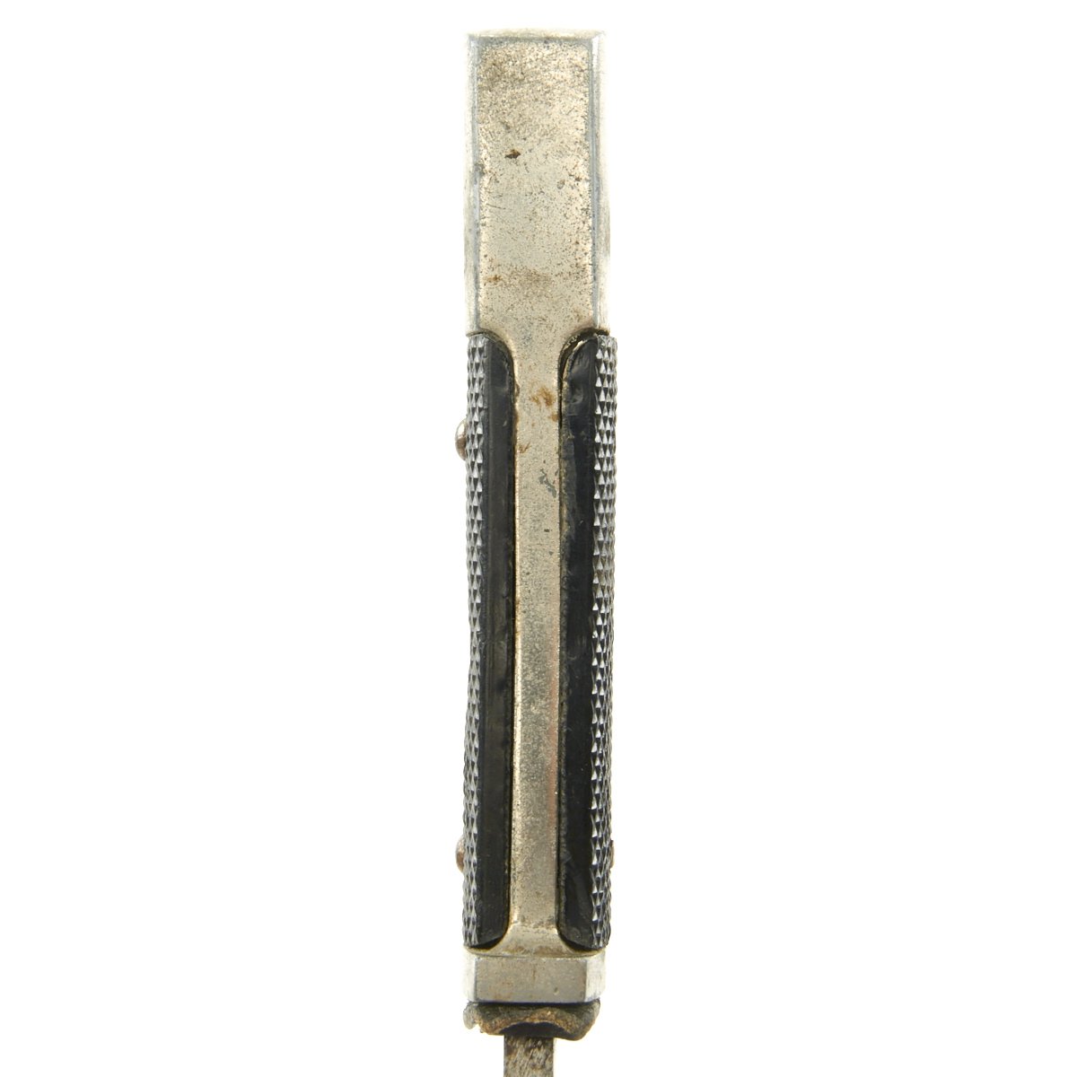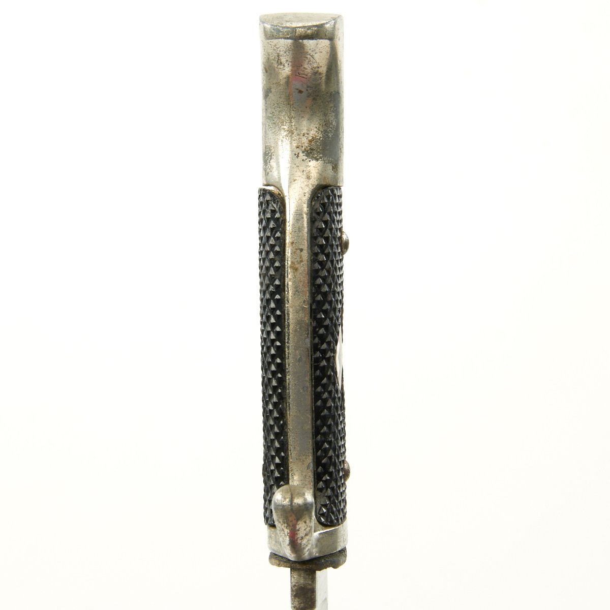 The hilt has about 60% of the original nickel plating remaining, with some areas where the base metal is exposed, with some light oxidation. The grip plates are the black checkered variety and are in very good condition, with just a bit of wear. They are retained by steel rivets with dressed obverse heads, which have lost their plating. The enamel grip insignia retains very bright colors and has a clean surface, with almost completely intact enamel. The plating has worn some of the brass portions though, so they are now a dull oxidized green color.