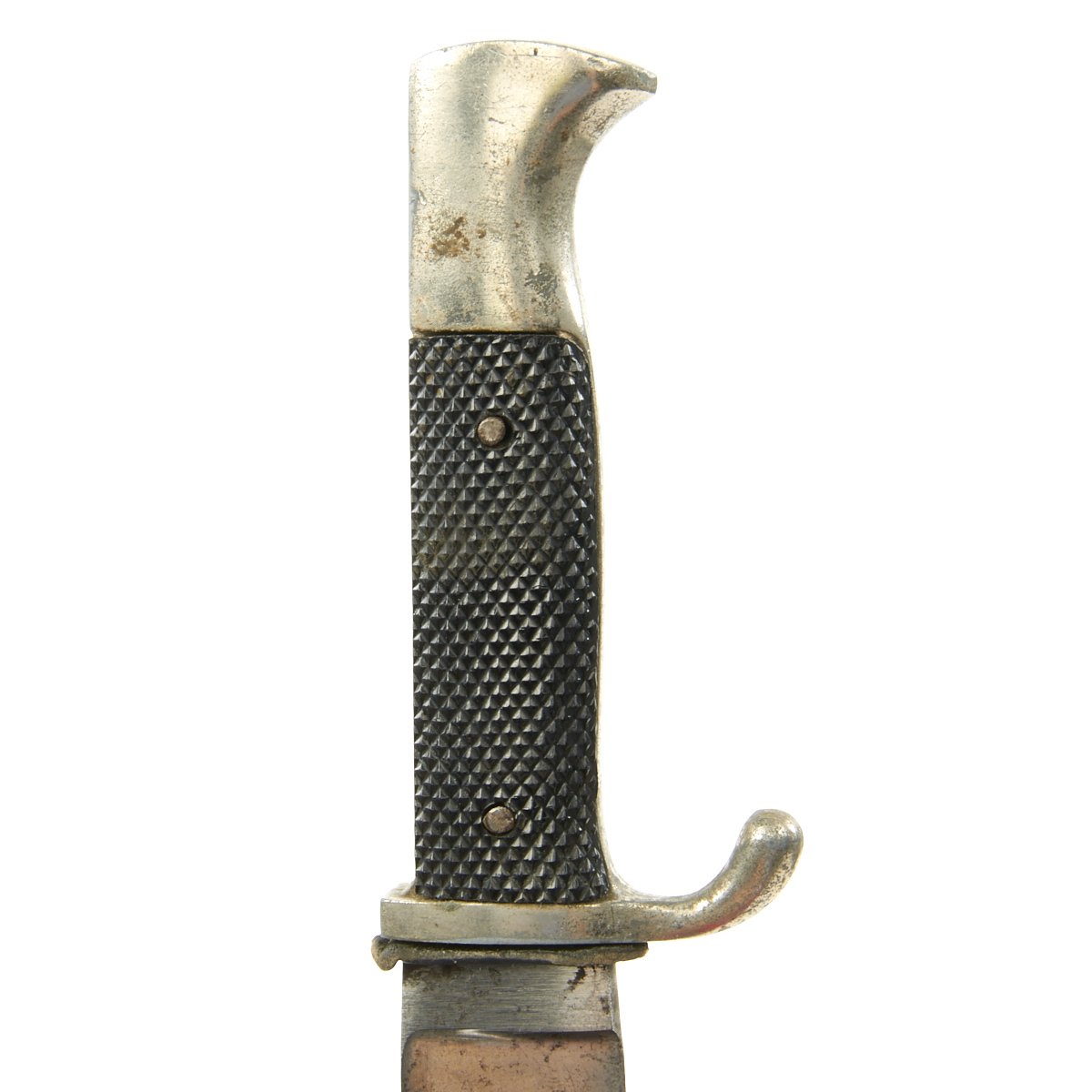 Original Item: Only One Available. This is a nice example of the classic later pattern HJ Knife, produced by the firm of Karl Robert Kaldenbach, based in the Gräfrath borough of Solingen. This city is known as the "City of Blades", and was and still the center of edged-weapon production in Germany. These were given to boys who were educated in the paramilitary organization, which they often continued to carry into their military service. Unlike the early pattern knives, these have a thicker blade with a raised ricasso, which significantly strengthened the blade. They also do not have the HJ motto etched on the blade, and often are marked not with a maker, but a German RZM Code.