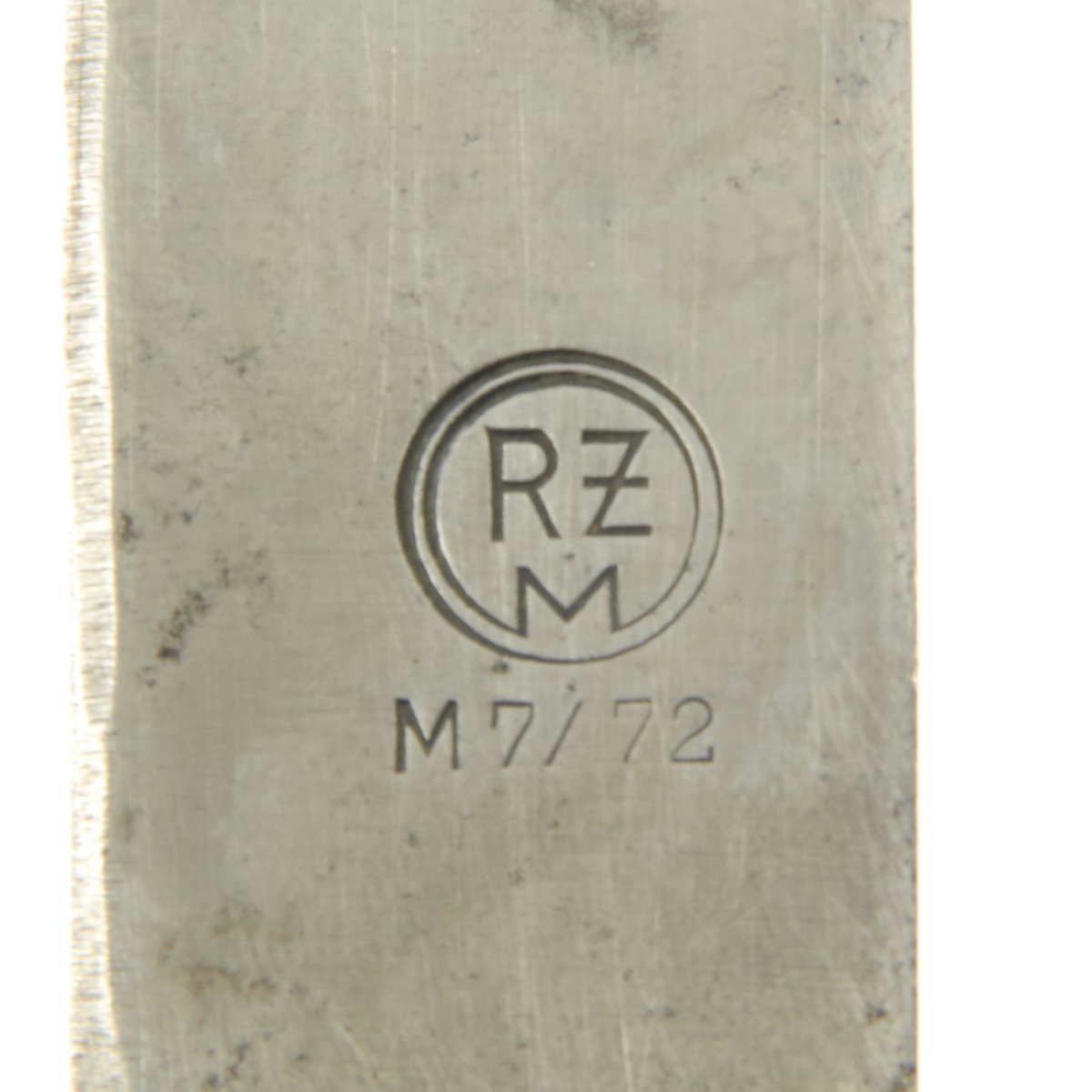 The blade is in good shape, but definitely saw use. It has been sharpened several times, and has a bit of staining in areas. However, the original factory crossgrain can be seen in many locations. The original leather blade buffer is in place, but is definitely worn. The reverse ricasso is stamped with an RZM circle, with the code M7 / 72. The Reichszeugmeisterei, or RZM, was was based at the Brown house in Munich and NSDAP party headquarters in Berlin. The RZM ensured that the manufacturers of military items were consistent in design, quality of materials and other characteristics of the items. It also defined standards of design, manufacturing and quality and published an authoritative color chart for textiles. The M7 in the code stands for knives/daggers, with Karl Robert Kaldenbach of Solingen-Gräfrath being contractor number 72.