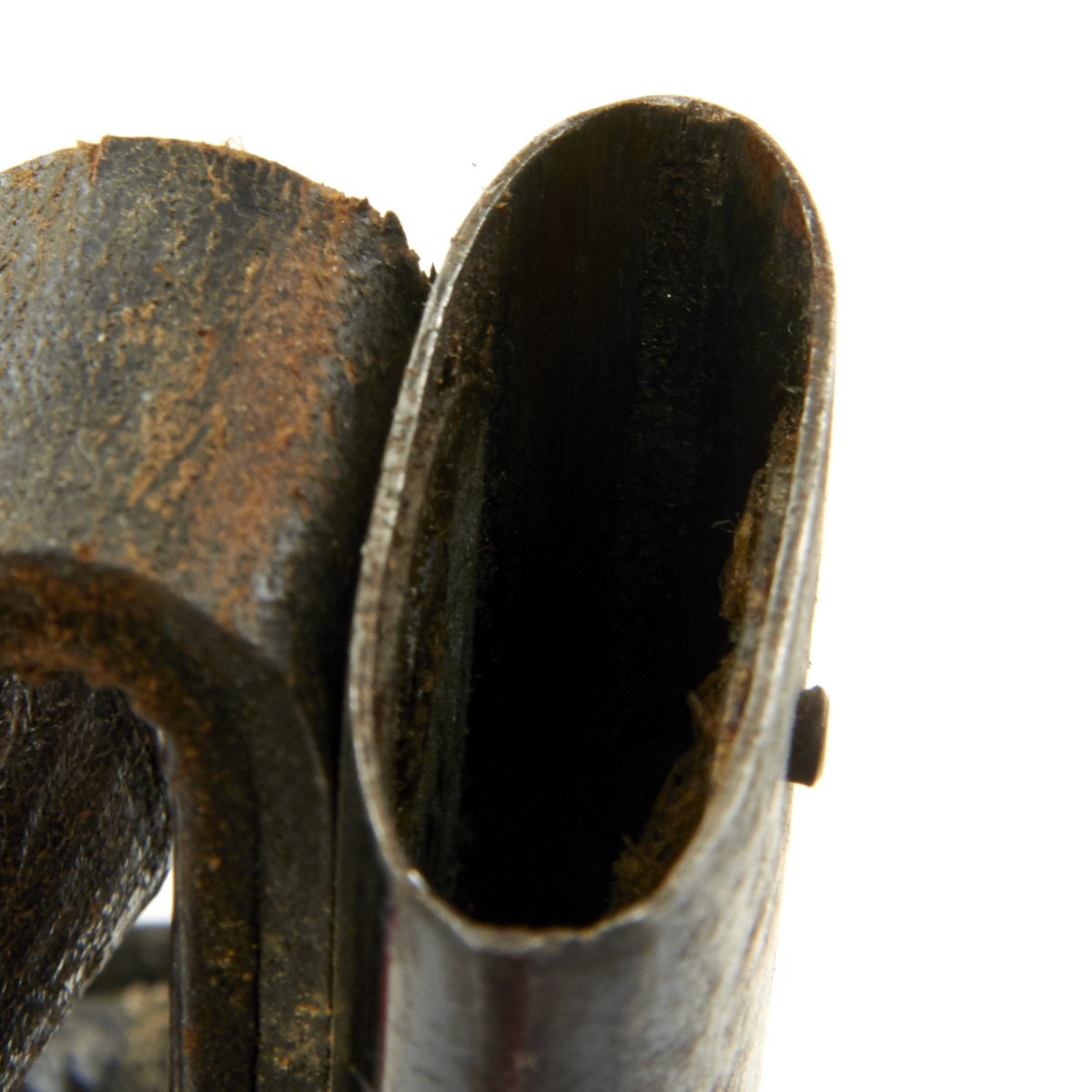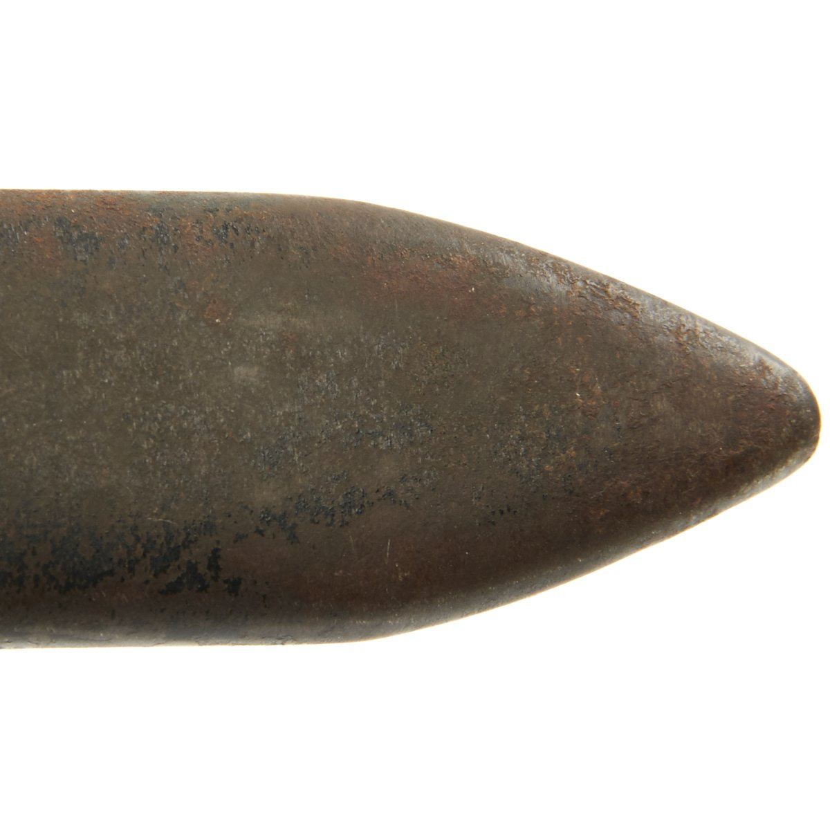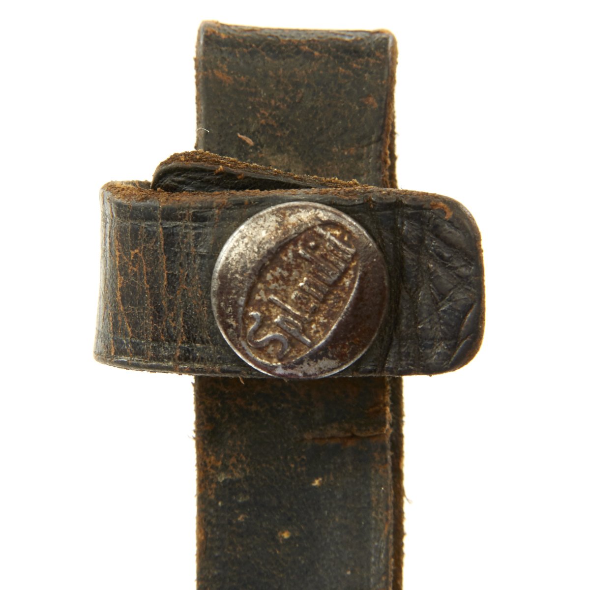 The scabbard is completely straight throughout with no dents, however the original enamel finish is mostly gone, having flaked off long ago. What remains shows the usual crazing and checking from age. As with most, the reverse of the scabbard fared better. The belt loop is black finished leather, with wear from use, but is overall solid. The securing strap is intact, with a functional snap.