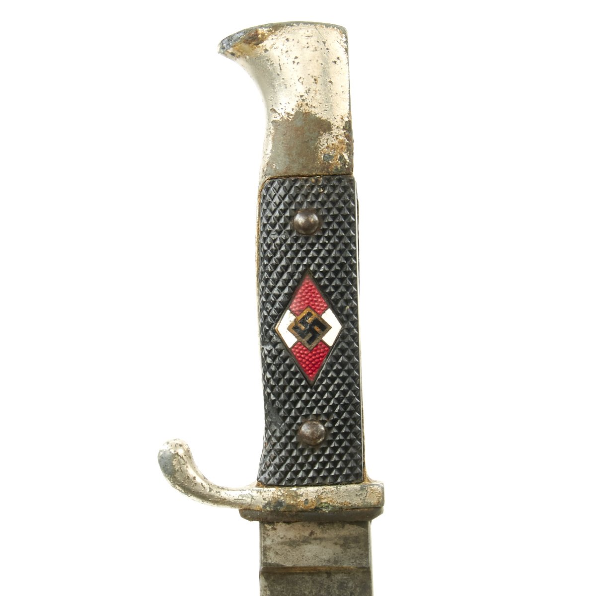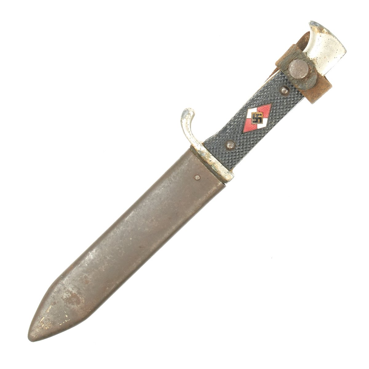 The HJ Leaders were professionals in charge of the training and NSDAP education of the German Youth. They wore a special dagger consisting of silvered hilt fittings with blue-black leather-covered scabbard. The grip was composed of tightly wrapped silver wire, over a wood base. The pommel cap featured an HJ diamond on top, complete with swas. The upper scabbard fitting portrayed an open-winged HJ eagle with swas cut into the bird's chest. The blade was etched with the HJ motto, Blut und Ehre!