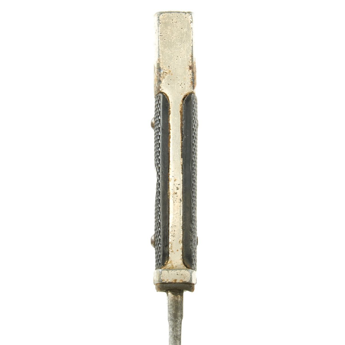 The blade has is in good shape, but definitely saw significant use. It has been sharpened multiple times, and has staining and light pitting in areas. The tip also has been altered in shape by sharpening. The original leather blade buffer is in place, but is definitely worn. The reverse ricasso is stamped with an RZM circle, with the code M7/68. The Reichszeugmeisterei, or RZM, was was based at the Brown house in Munich and NSDAP party headquarters in Berlin. The RZM ensured that the manufacturers of military items were consistent in design, quality of materials and other characteristics of the items. It also defined standards of design, manufacturing and quality and published an authoritative color chart for textiles. The M7 in the code stands for knives/daggers, with Tigerwerk Lauterjung & Co. of Solingen being contractor number 68.
