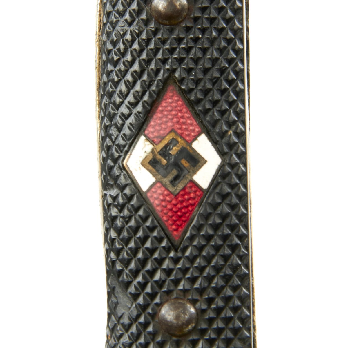 Original Item: Only One Available. This is a nice example of the classic later pattern HJ Knife, produced by the Solingen-based firm of Tigerwerk Lauterjung & Co.. These were given to boys who were educated in the paramilitary organization, which they often continued to carry into their military service. Unlike the early pattern knives, these have a thicker blade with a raised ricasso, which significantly strengthened the blade. They also do not have the HJ motto etched on the blade, and often are marked not with a maker, but a German RZM Code.