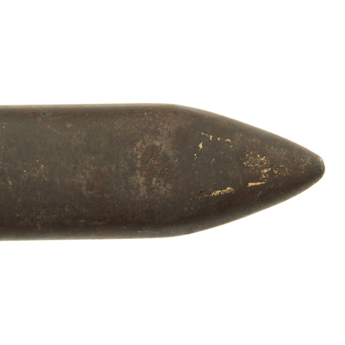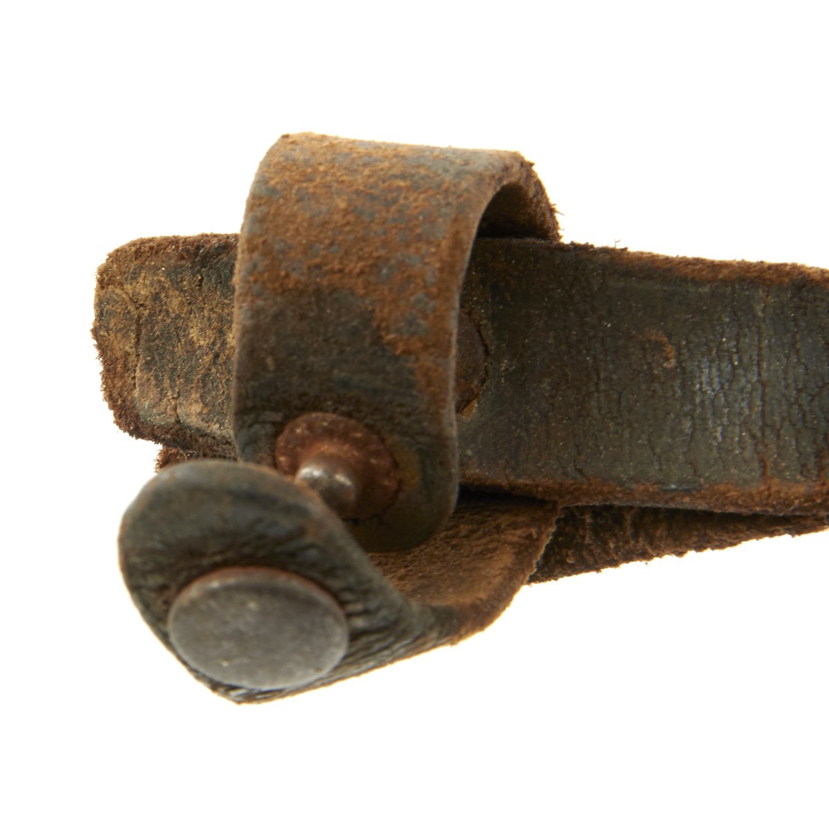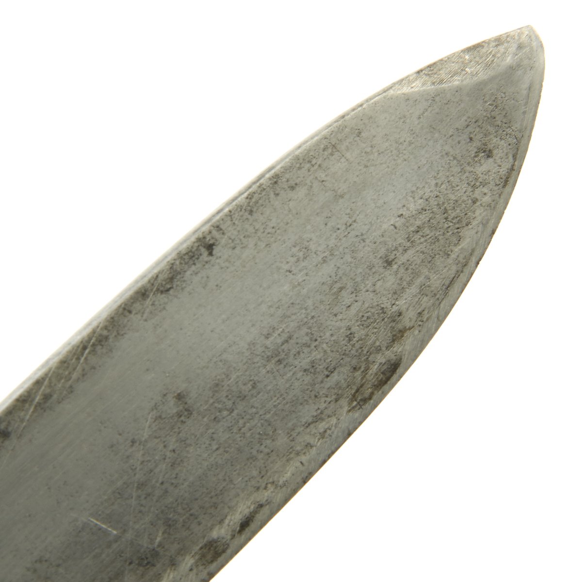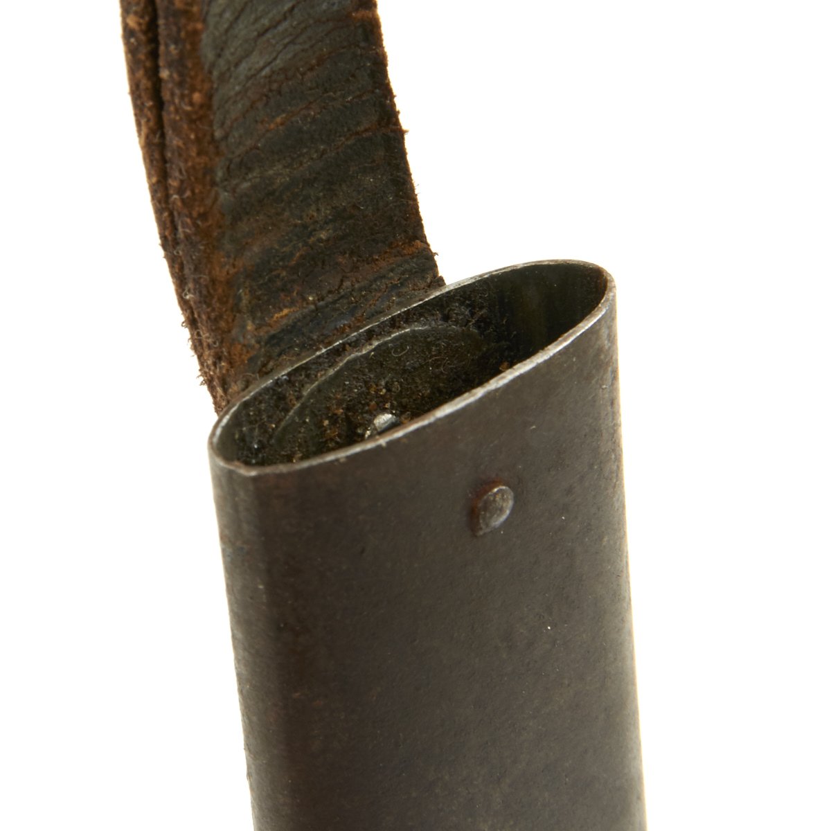 The scabbard is completely straight throughout with no dents, however the original enamel finish is completely gone, replaced by an aged steel patina. There is a bit of light pitting in areas. The belt loop is black finished leather, however most of the finish is missing, and the top of the belt loop is split open. The securing strap is intact, with a functional snap.