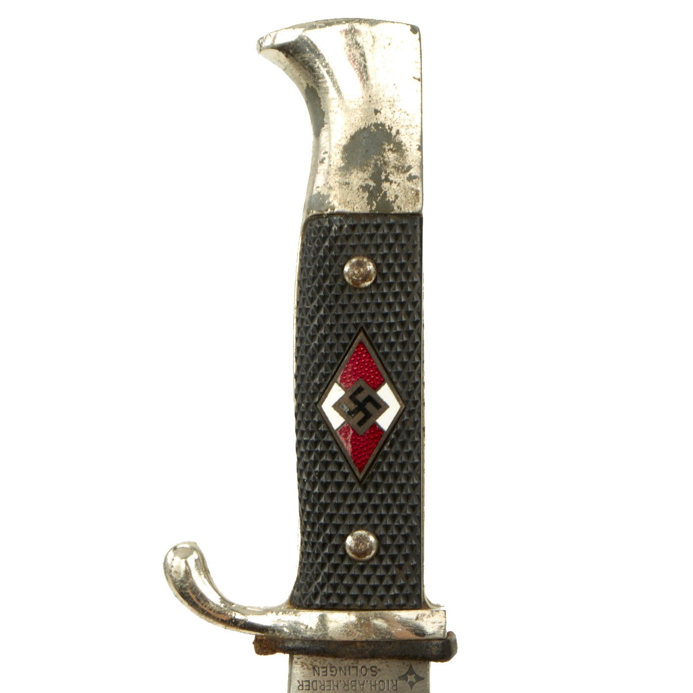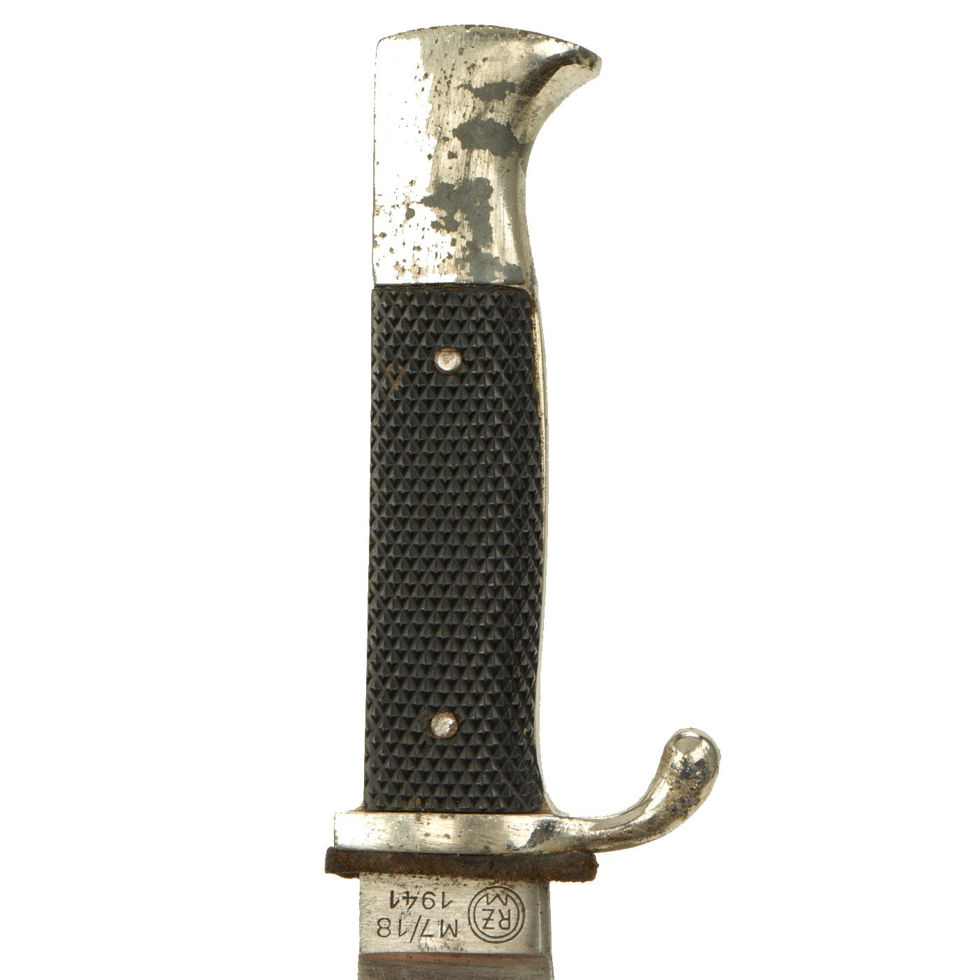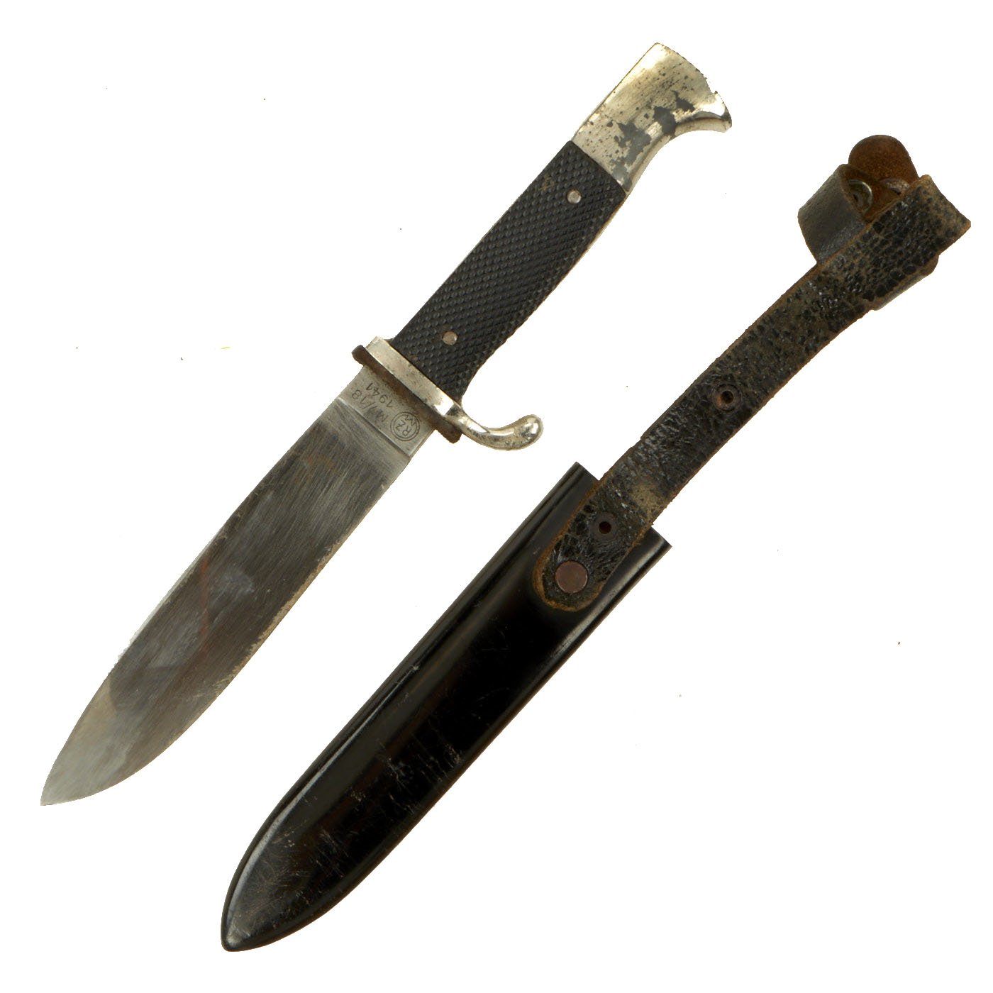 These knives were given to boys who were educated in the paramilitary organization, which they often continued to carry into their military service. Unlike the early pattern knives, these have a thicker blade with a raised ricasso, which significantly strengthened the blade. They also do not have the HJ motto etched on the blade, and often are marked not with a maker, but a German RZM Code.