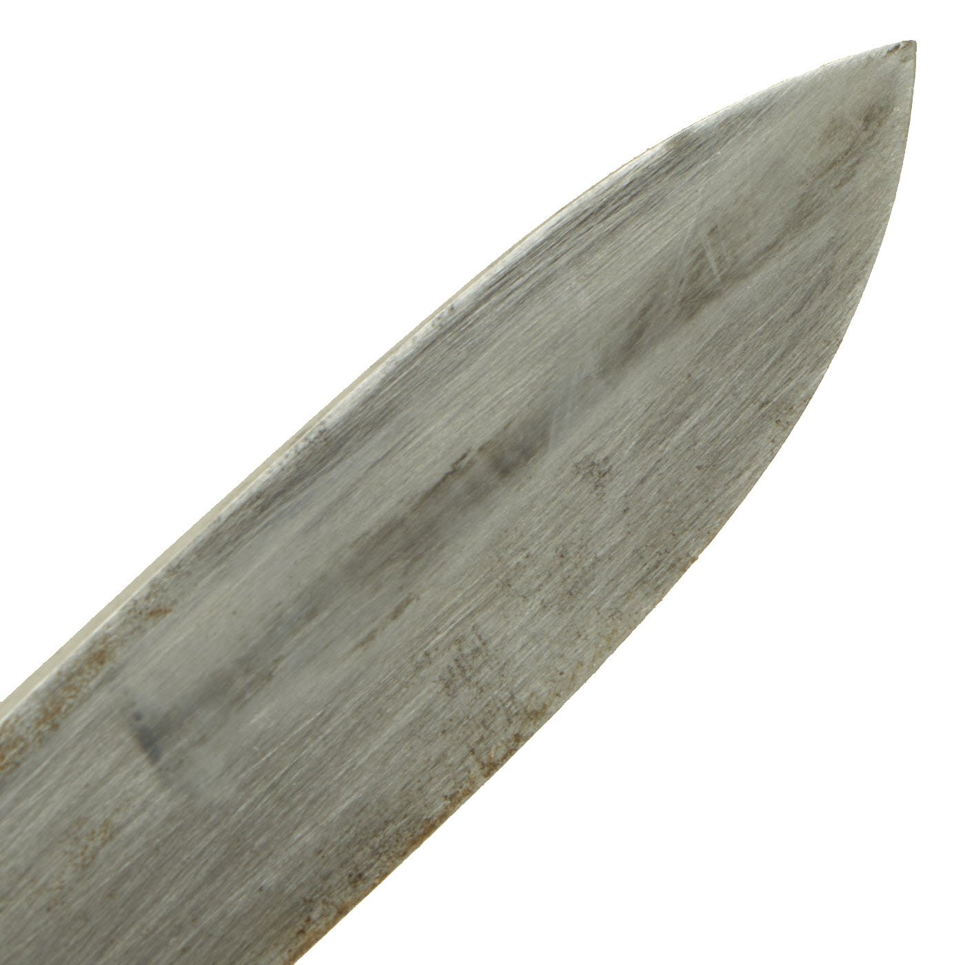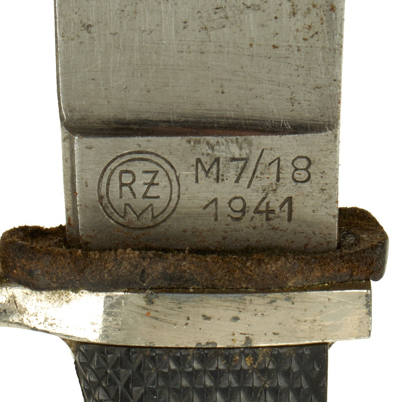 The blade of this example is in very good condition, showing moderate use, and no major rust or other damage. There is just a bit of light staining, as well as some marks from the runner and cleaning. It does not look to have been sharpened much at all during service, and the leather blade buffer is still present and in good shape. This example is however a bit interesting, in that while it is the later pattern, it is marked with both an RZM marking as well as the maker's trademark marking. The reverse ricasso of the blade is stamped with the ((RZM)) marking, with M7 / 18 over 1941 to the right. The other ricasso is marked as follows: