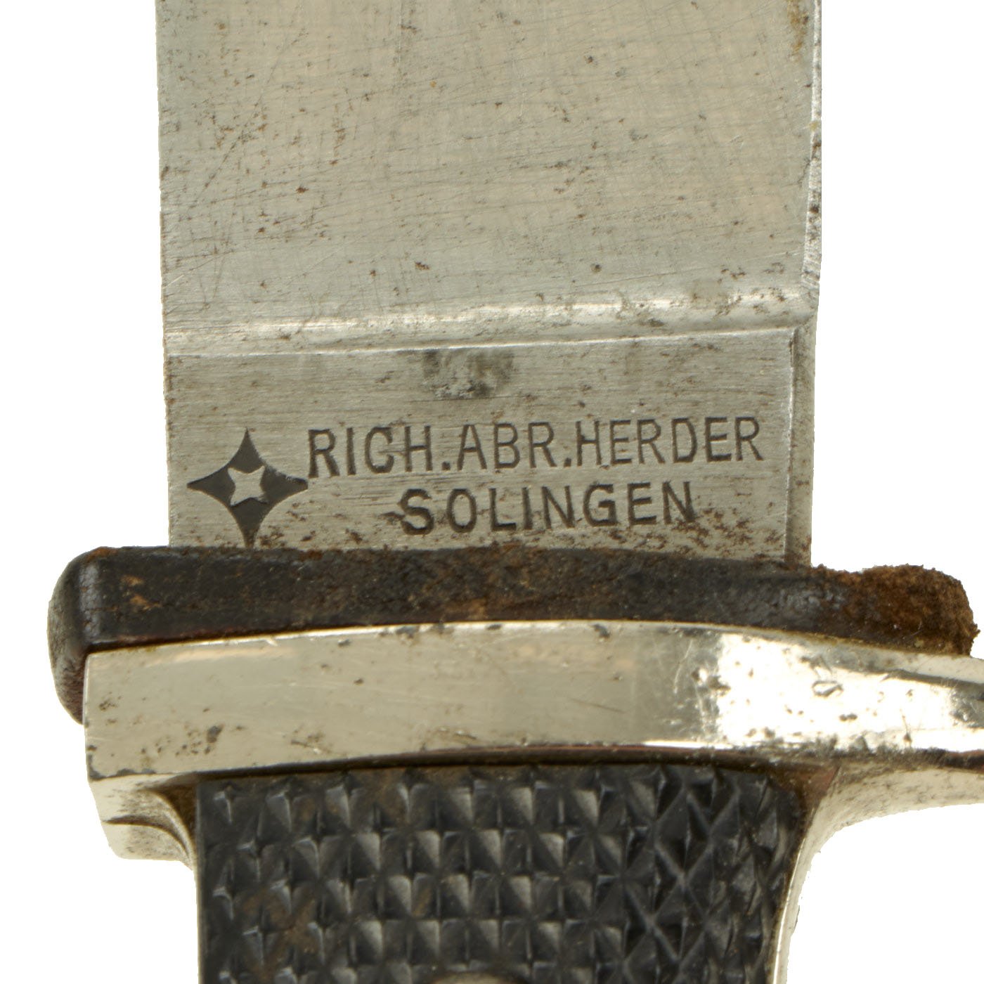 Original Item: Only One Available. This is a very good 1941 dated example of the classic later pattern HJ fahrtenmesser (trip knife), complete with its original scabbard. It was produced by the desirable maker Richard Abr. Herder, Stahlwarenfabrik (Steelware Factory), based in Solingen, the legendary "City of Blades" in Western Germany.