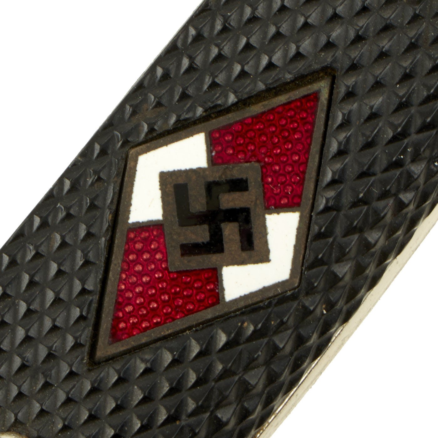 HJ believed German youth to be the future of his 3rd Reich. The HJ (jugend) was formed officially in 1935, and with the exception of NSDAP ideology indoctrination was very similar to the Boy Scouts. Beginning at about the age of ten years, both boys (jugend) and girls (Bund Deutscher Mädel) were enlisted in the Party-run organization. The boys only were given HJ Knives after having passed minor exams. The knives had nickeled hilts with black checkered grip plates. The obverse plate was fitted with an enameled HJ swas insignia. Through 1937, these knives were etched with the motto of the organization, Blut und Ehre! (Blood and Honor!). Examples produced after this date were made with plain blades usually bearing an RZM marking.