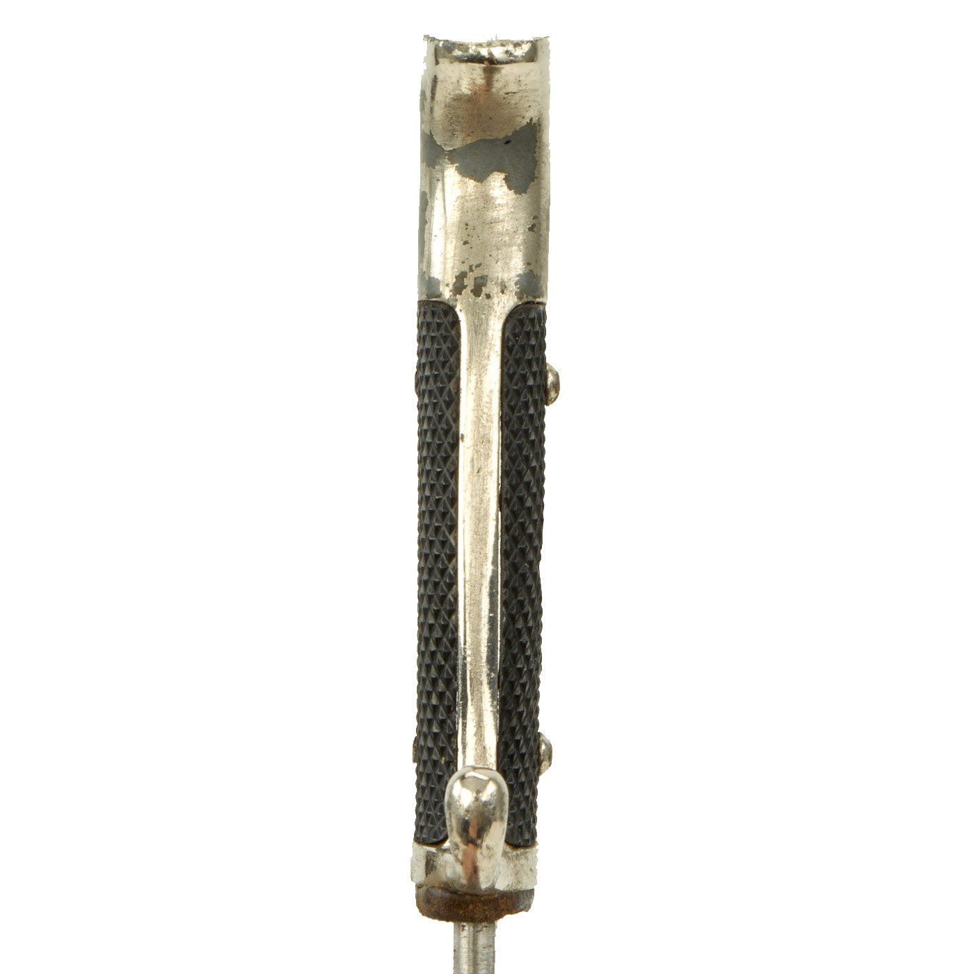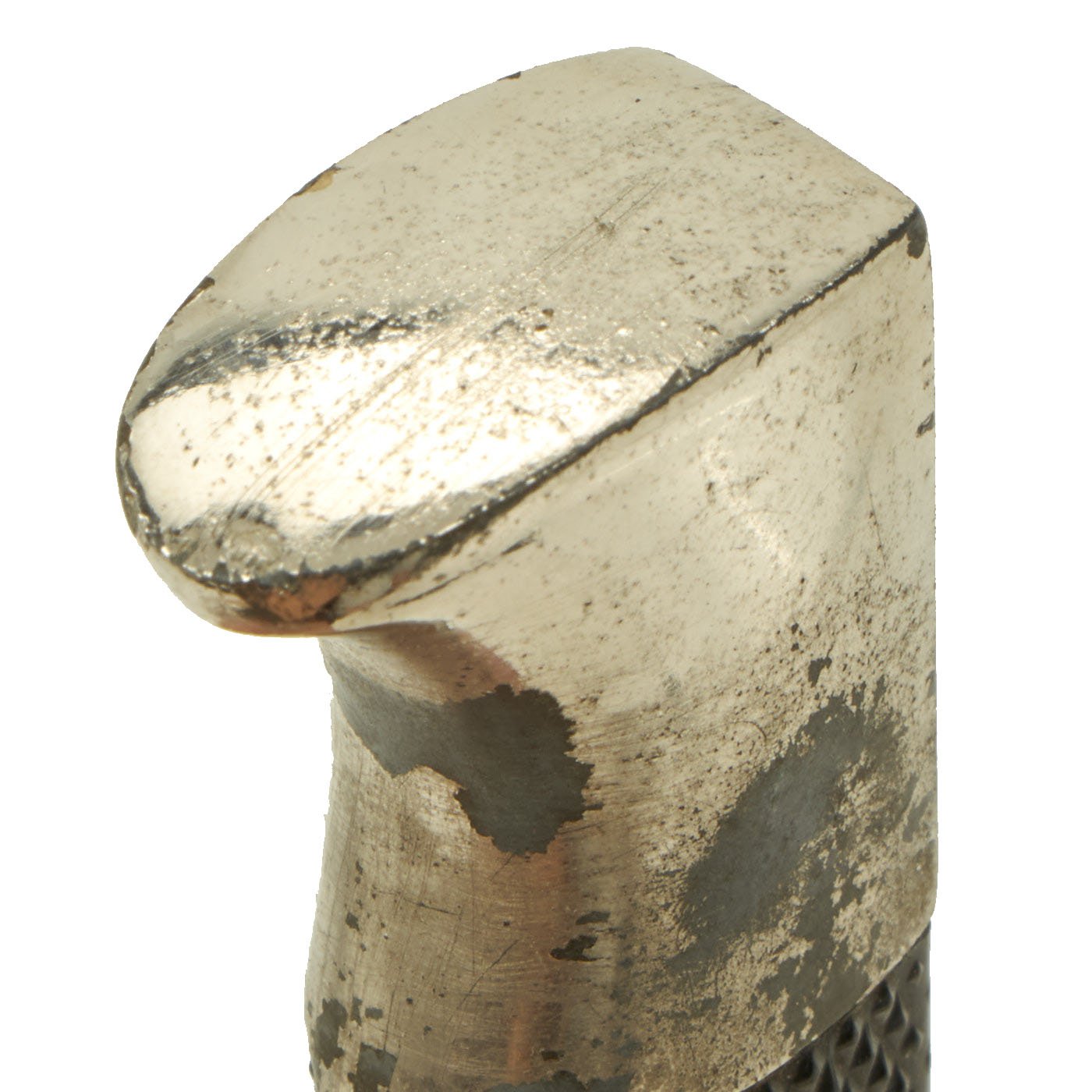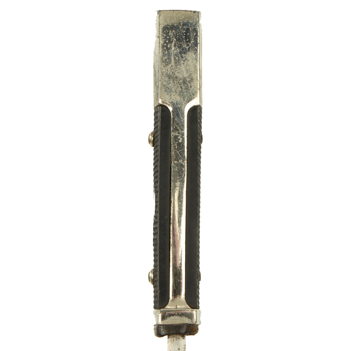 The hilt of this example is plated zinc alloy, and the plating is retained at about 75%, with wear and areas of flaking and loss overall. The grip plates are the black checkered bakelite variety and are in very good condition, with light wear, and definitely no cracking. They are retained by plated steel rivets with dressed obverse heads, which show light oxidation. The HJ grip insignia has full enamel with only light wear, though the brass borders are quite dark. It is loose in the grips, caused by the bakelite shrinking over the years, which also confirms authenticity.