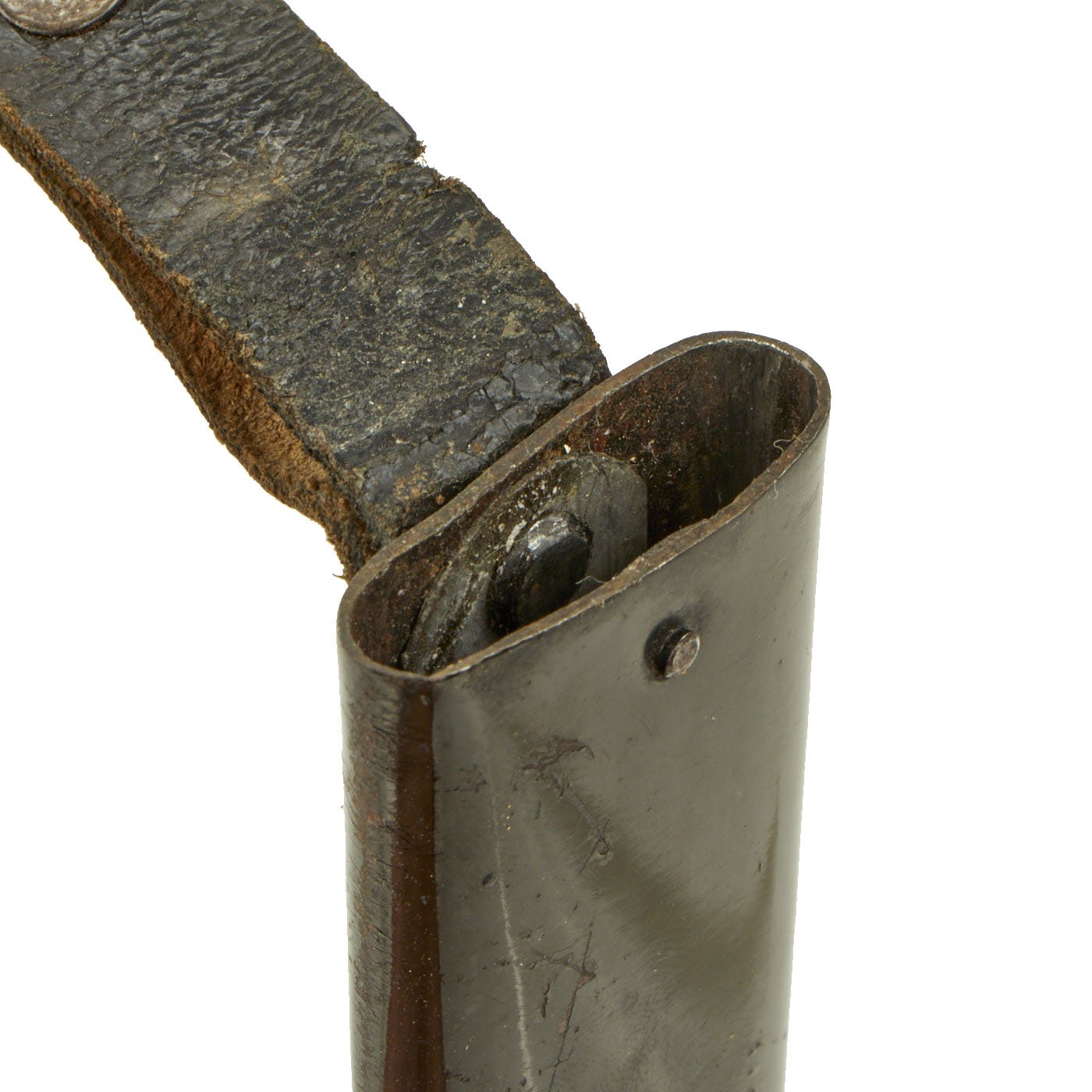 The scabbard on this example is in great shape, with almost all of the finish retained, and no dents we can see. There is some crazing and checking on the rear, but only a small amount. The original leather belt loop is intact, as is the securing loop, and the black finish is well retained.