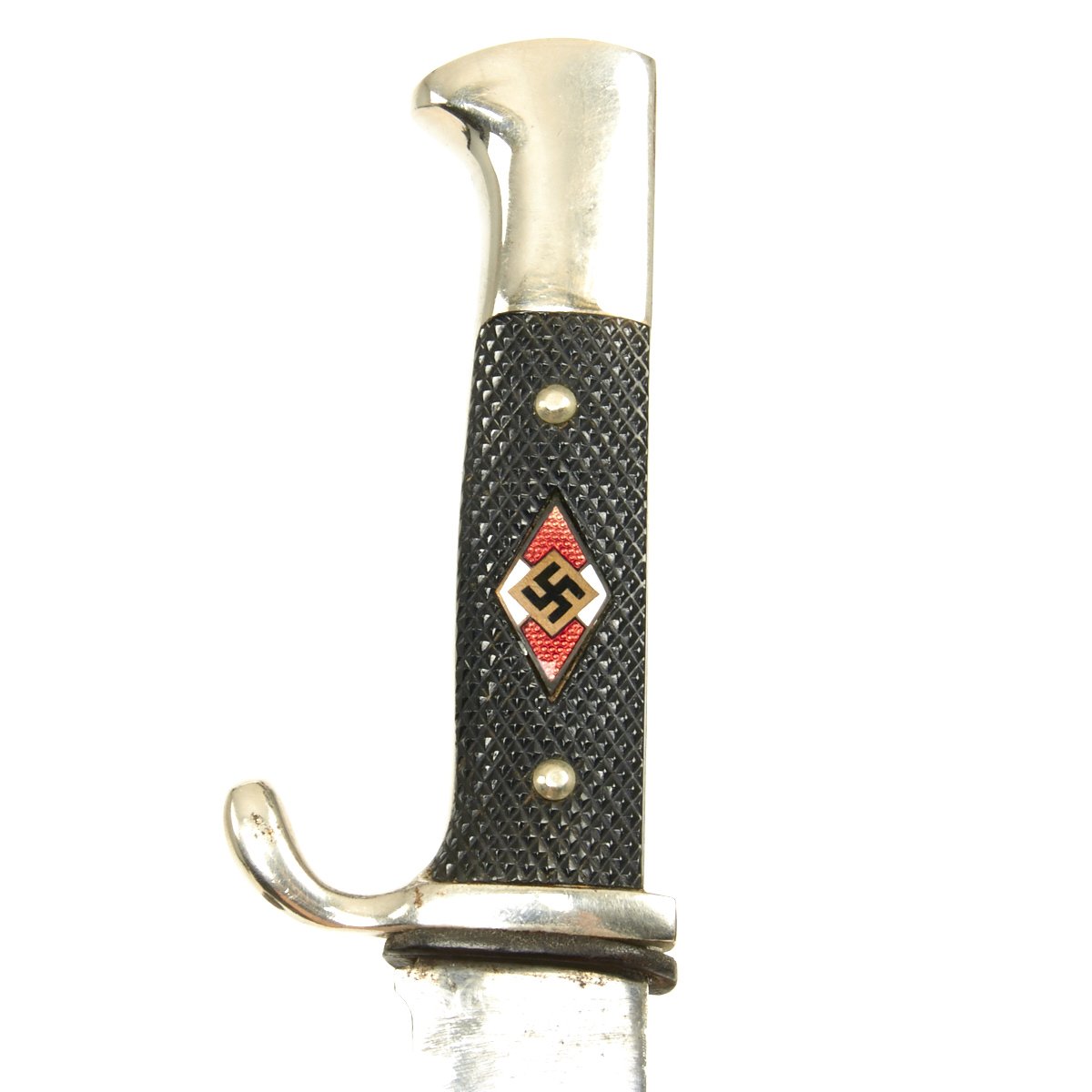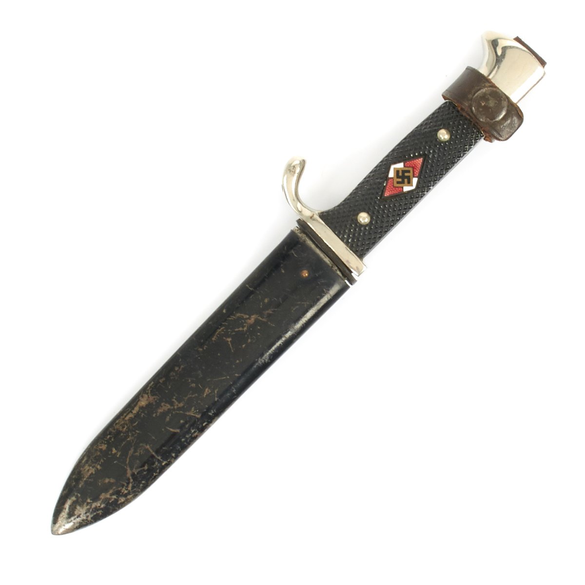 The HJ Leaders were professionals in charge of the training and NSDAP education of the German Youth. They wore a special dagger consisting of silvered hilt fittings with blue-black leather-covered scabbard. The grip was composed of tightly wrapped silver wire, over a wood base. The pommel cap featured an HJ diamond on top, complete with swas. The upper scabbard fitting portrayed an open-winged HJ eagle with swas cut into the bird's chest. The blade was etched with the HJ motto, Blut und Ehre!