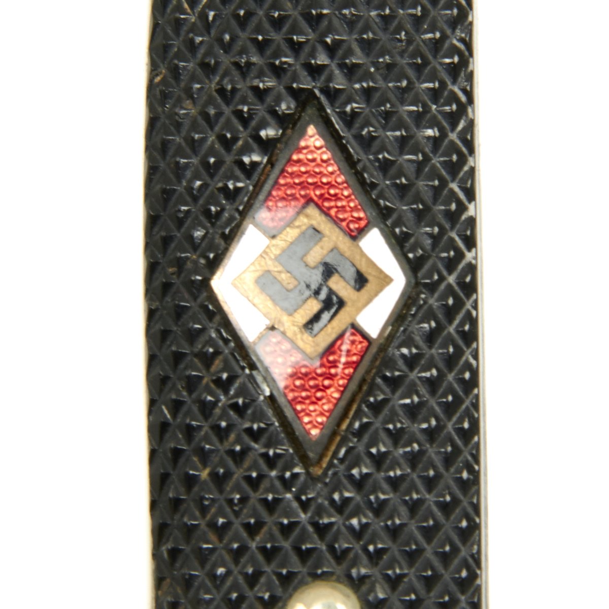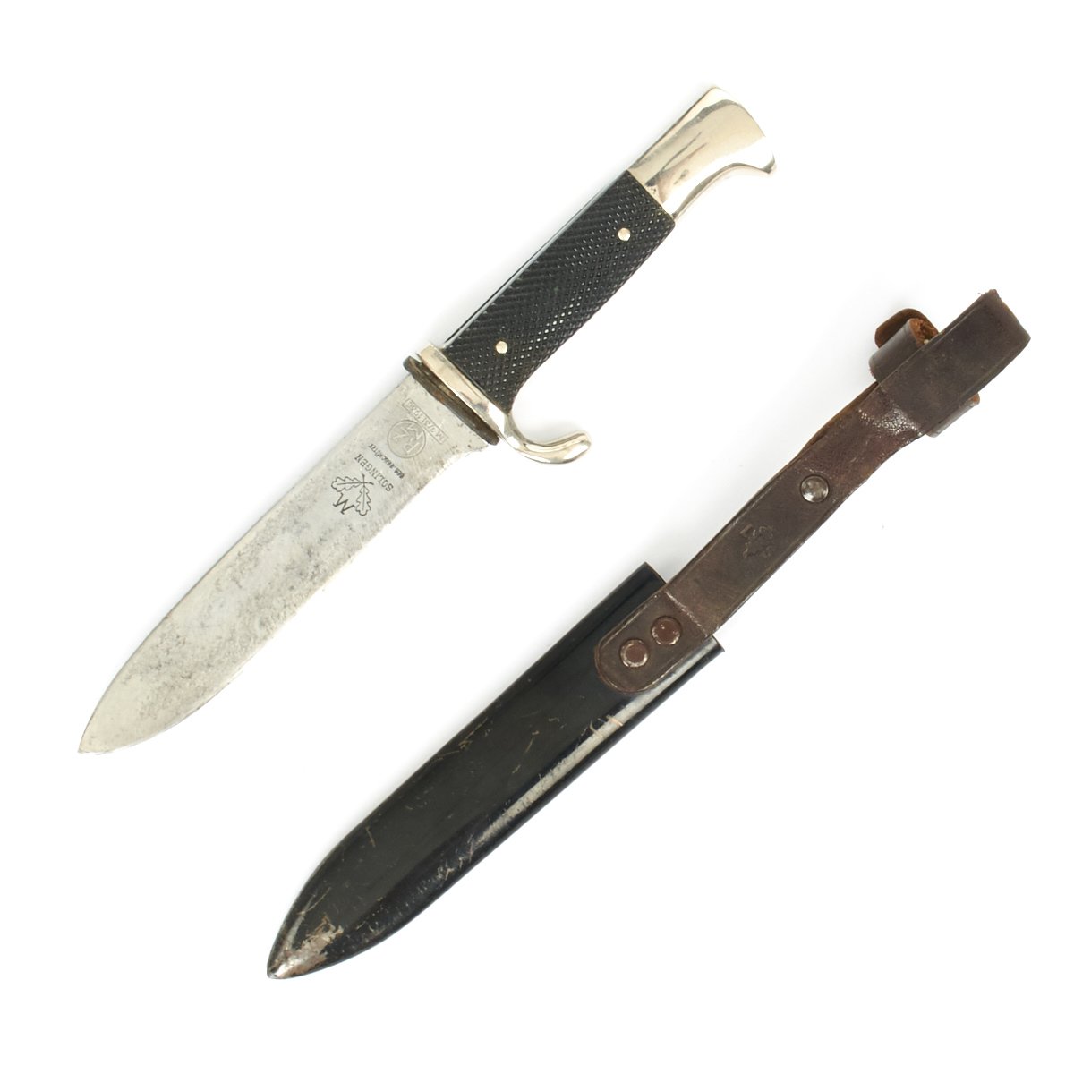 AH believed German youth to be the future of his 3rd Reich. The HJ (AH Jugend) was formed officially in 1935, and with the exception of NSDAP ideology indoctrination was very similar to the Boy Scouts. Beginning at about the age of ten years, both boys (AH Jugend) and girls (Bund Deutscher Mädel) were enlisted in the Party-run organization. The boys only were given HJ Knives after having passed minor exams. The knives had nickeled hilts with black checkered grip plates. The obverse plate was fitted with an enameled HJ swas insignia. Through 1937, these knives were etched with the motto of the organization, Blut und Ehre! (Blood and Honor!). Examples produced after this date were made with plain blades usually bearing an RZM marking.