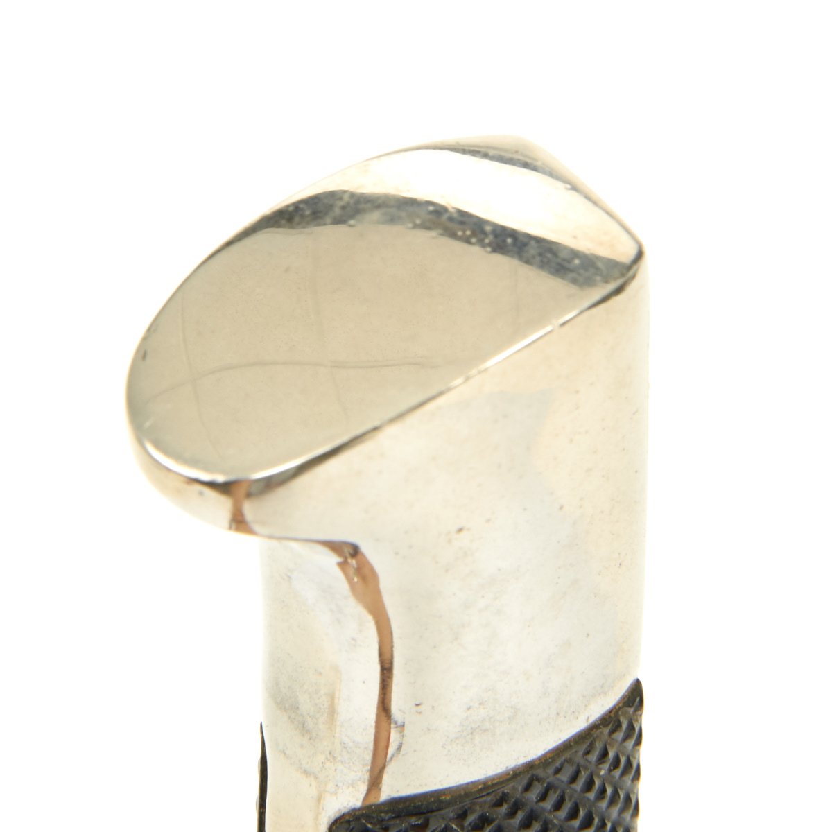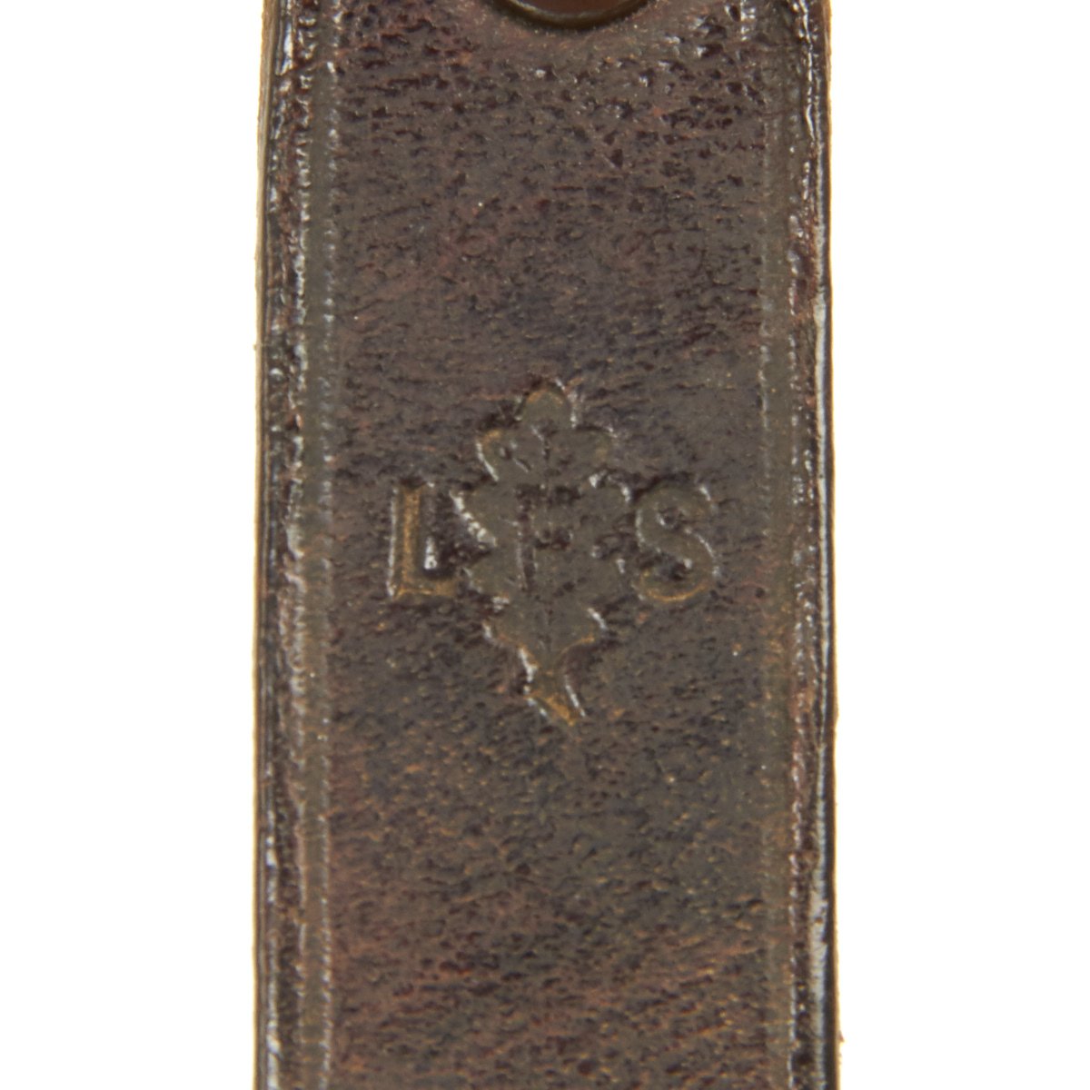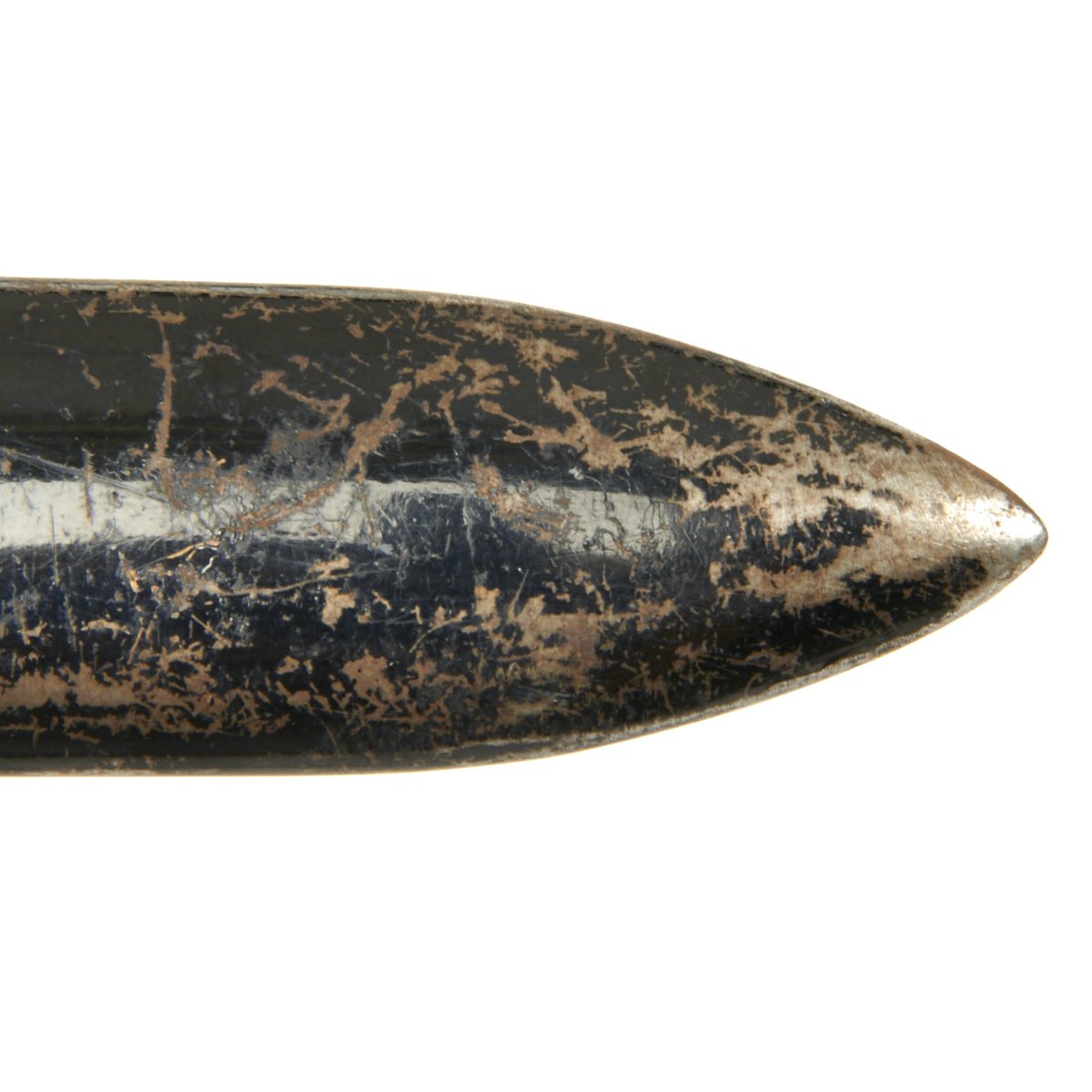 The scabbard shell the typical tapered example with original paint. The paint is still bright and rates at above 80%. There is a bit of checking in the lacquer, with chipping on the outer side. The leather hanger and belt loop are still in good supple condition, though the finish is somewhat worn. The retainer loop is intact and has a good working snap, though it has some light cracking from age, and unfortunately the belt loop is broken.