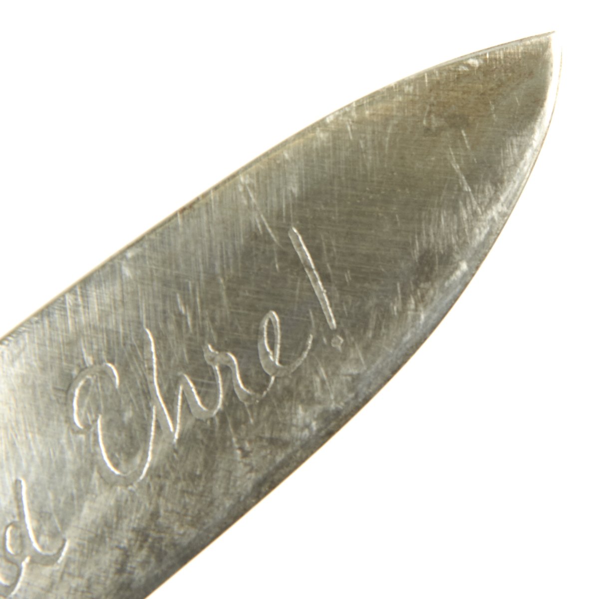 Original Item: Only One Available: A very nice early HJ Knife (HJ knife) marked on the blade with the RZM code for maker August Merten of Solingen. This early HJ Knife is a solid example of the type, with a handle that is nickel-plated over a steel base. The plating still remains in nice condition, with over 95% still intact and shiny. The acid-etched motto Blut und Ehre! (Blood and Honor!) is present and legible but the original dark etched finish has been polished off by use and sharpening.