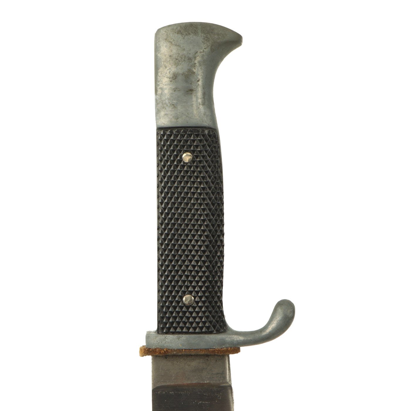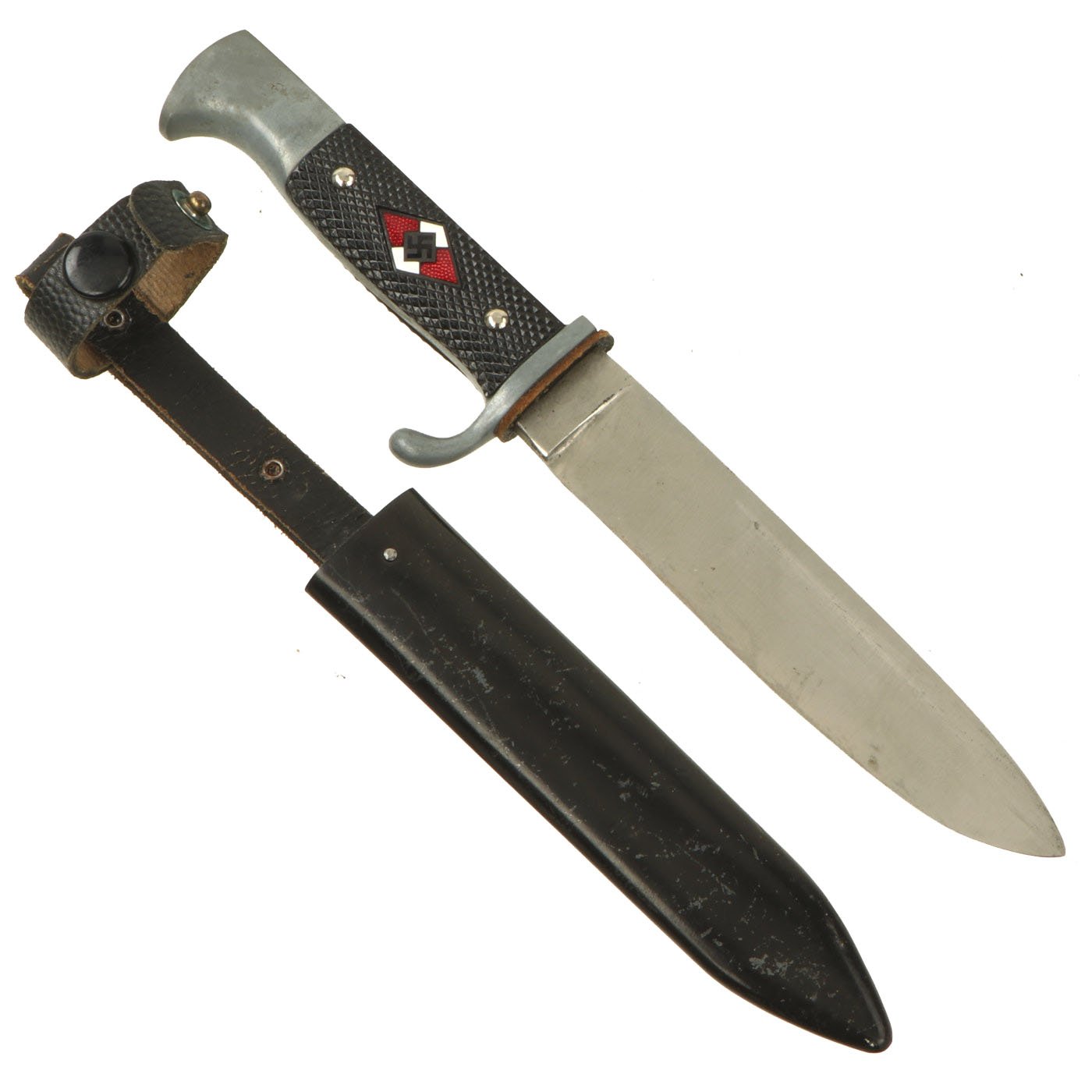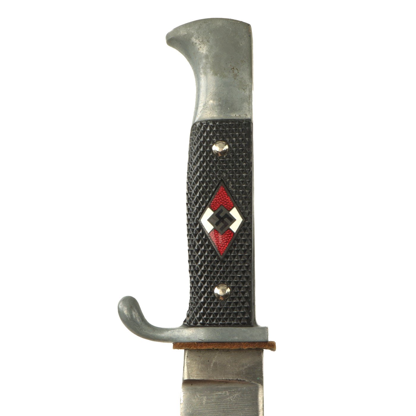 These knives were given to boys who were educated in the paramilitary organization, which they often continued to carry into their military service. Unlike the early pattern knives, these have a thicker blade with a raised ricasso, which significantly strengthened the blade. They also do not have the HJ motto etched on the blade, and often are marked not with a maker, but a German RZM Code.
