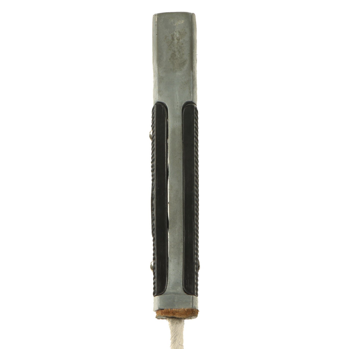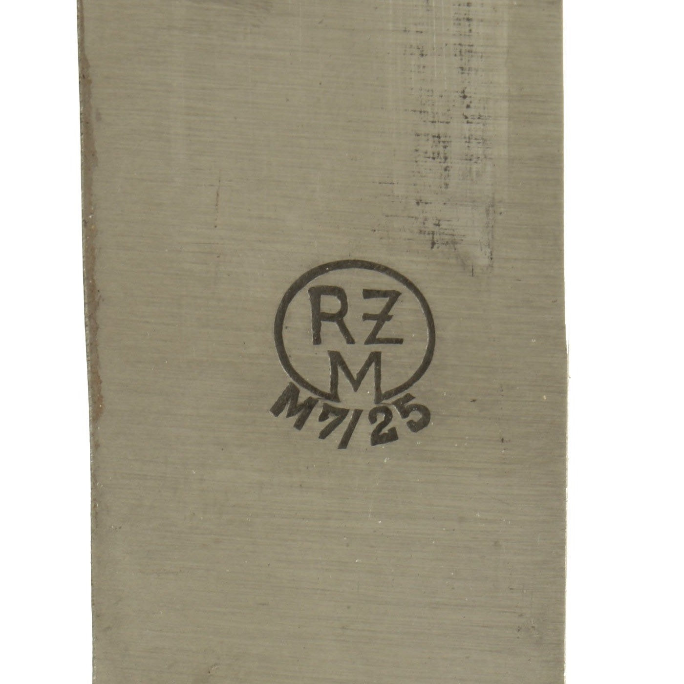 The blade of this example is in excellent condition, and does not show much sign of being used or cleaned during the war. It still has full factory cross grain, with no sharpening or the other usual signs of use. Pretty much the only wear present is from the runners of the scabbard, so this example looks nearly unissued. The reverse side of the blade is somewhat faintly stamped with an ((RZM)) circle, over code M7/25.