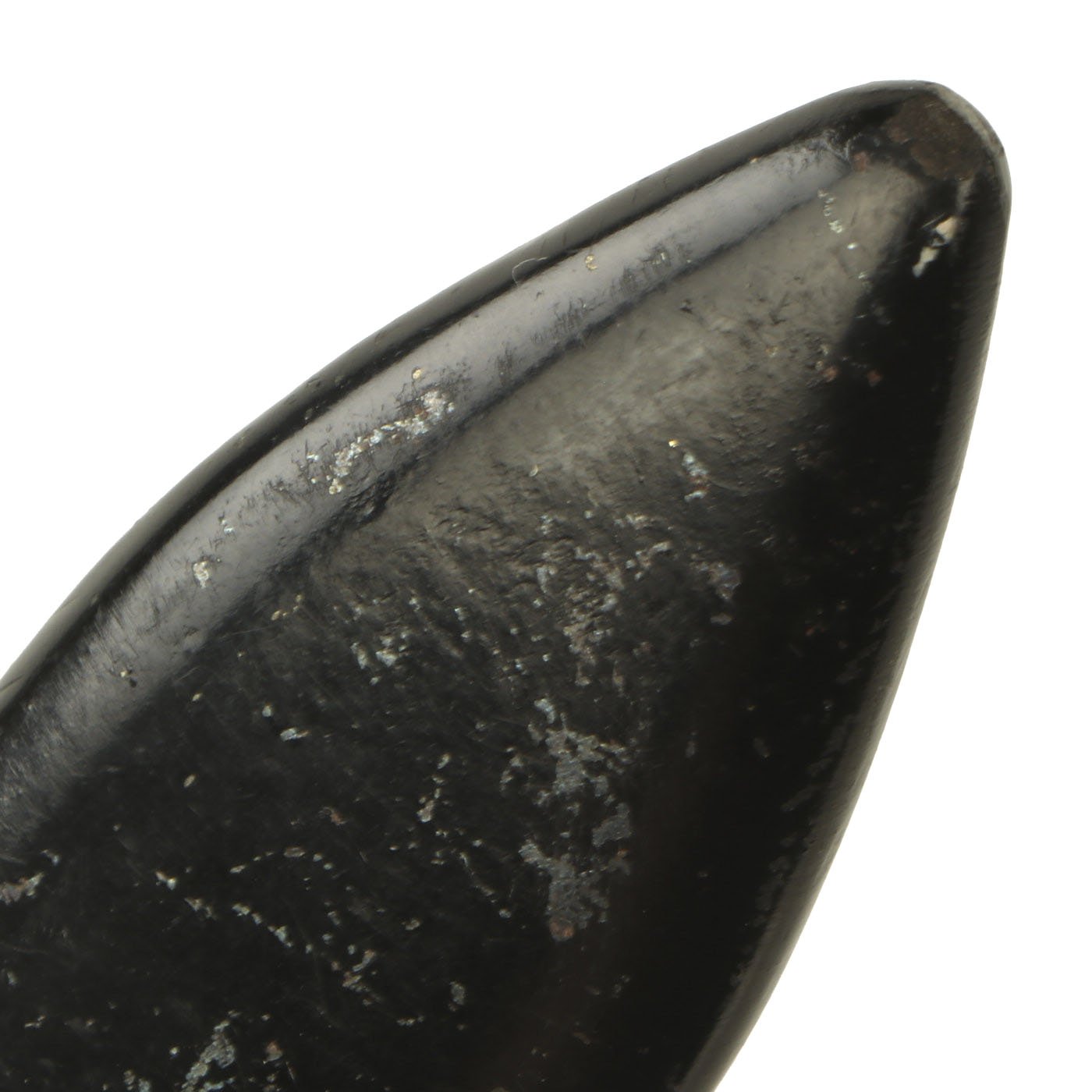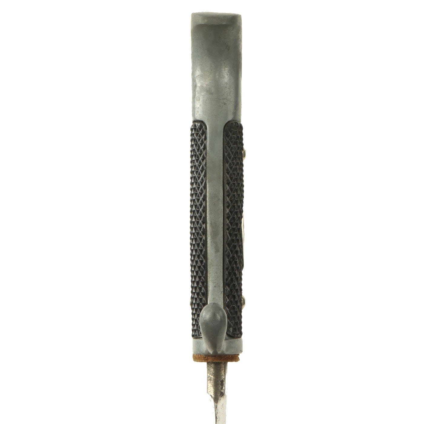 The hilt of this example look to have been originally bare zinc alloy, as we can see no indication that they ever had any type of nickel plating, and they now have a lovely satin gray patina. The grip plates are the black checkered bakelite variety and are in excellent condition, with almost no wear, and definitely no cracking. They are retained by steel nickel plated rivets with dressed obverse heads, which have most of their plating. The enamel grip insignia has full enamel, though the brass borders between the panels are now an oxidized dark patina. It is loose in the grips, caused by the bakelite shrinking over the years, which also confirms authenticity.