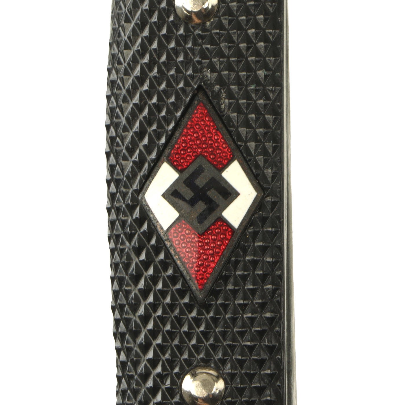 HJ believed German youth to be the future of his 3rd Reich. The HJ (jugend) was formed officially in 1935, and with the exception of NSDAP ideology indoctrination was very similar to the Boy Scouts. Beginning at about the age of ten years, both boys (jugend) and girls (Bund Deutscher Mädel) were enlisted in the Party-run organization. The boys only were given HJ Knives after having passed minor exams. The knives had nickeled hilts with black checkered grip plates. The obverse plate was fitted with an enameled HJ swas insignia. Through 1937, these knives were etched with the motto of the organization, Blut und Ehre! (Blood and Honor!). Examples produced after this date were made with plain blades usually bearing an RZM marking.
