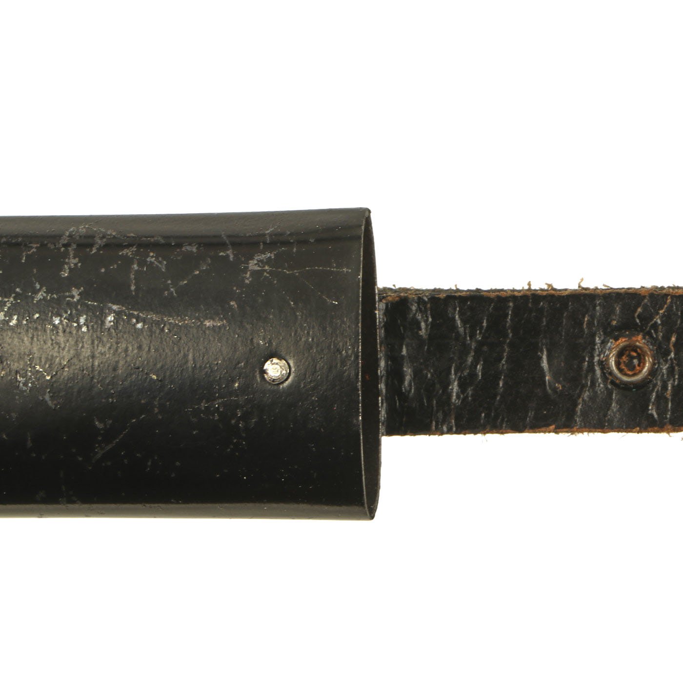 The scabbard is completely straight throughout with no dents, and retains about 95% or more of the original black enamel finish. It has only light wear, though it does have a bit of crazing and checking that occurs over the decades. The belt loop is black finished leather, with most of the original finish present. It is smooth black finished leather, while the securing strap is pebbled leather. The rivets and snaps are all intact and fully functional.