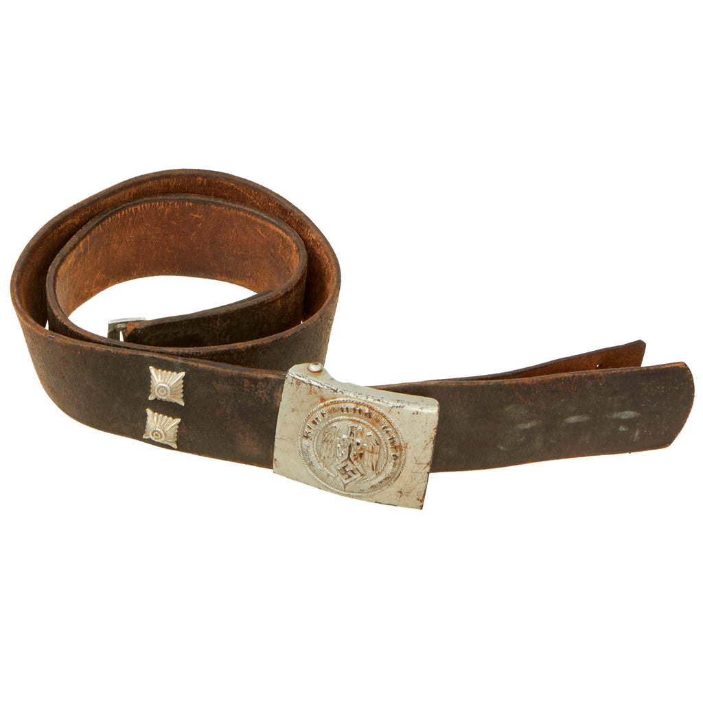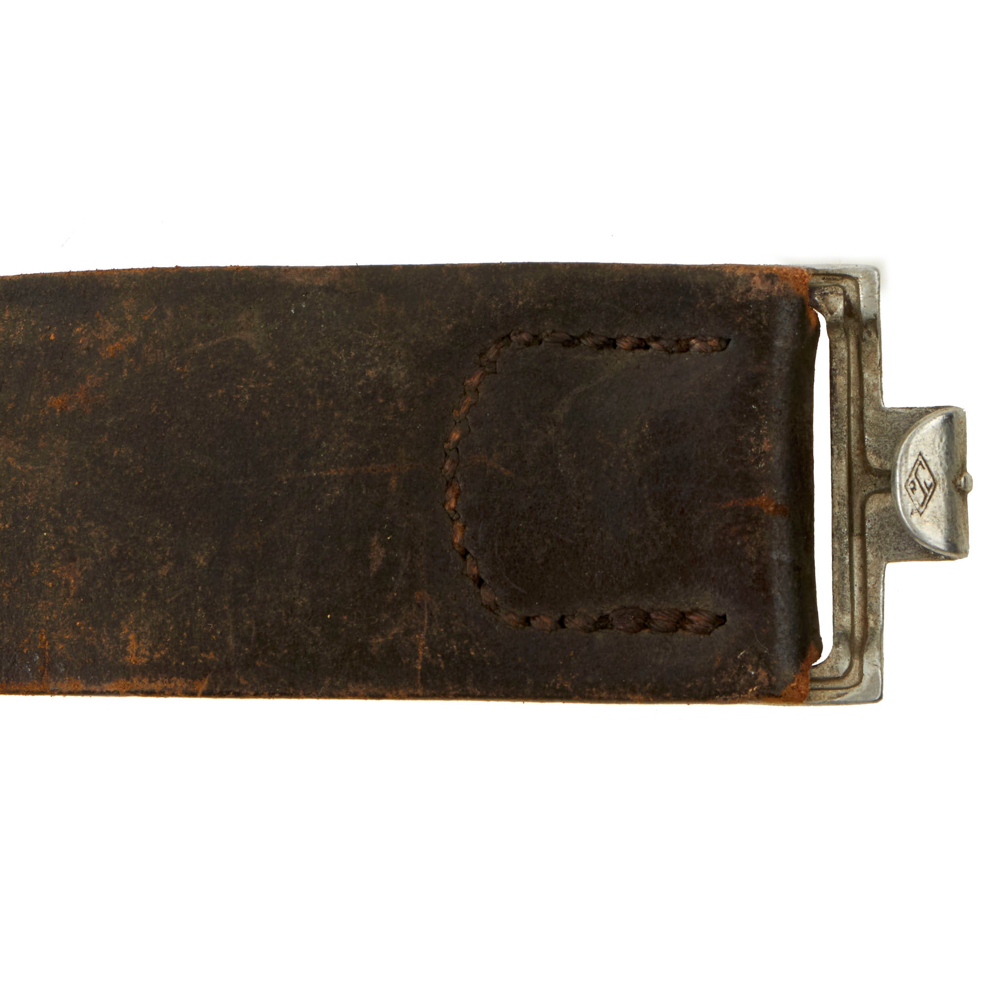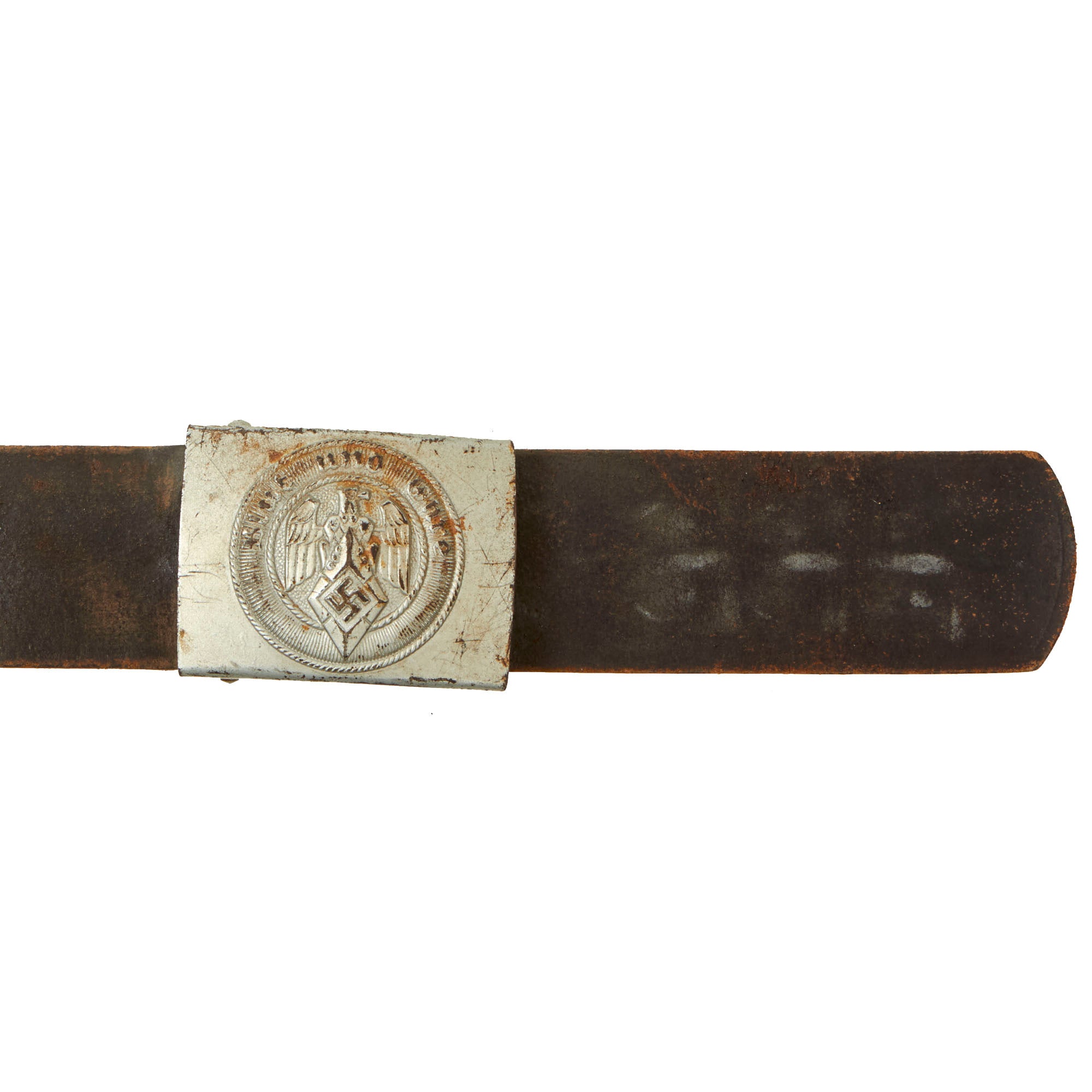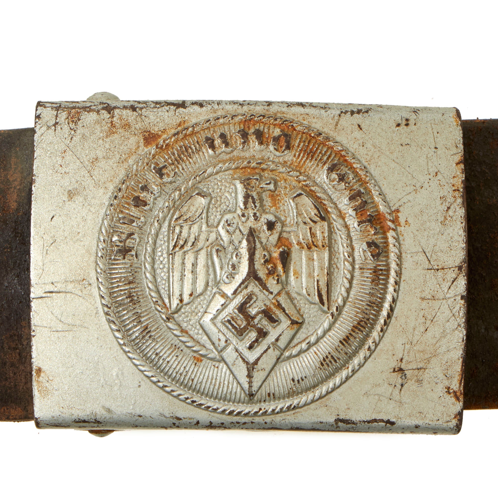Original Item: Only One Available. This is a very nice WWII German HJ steel Belt Buckle (Koppelschloß), complete with the correct leather belt. It is embossed with the HJ motto Blut und Ehre (Blood and Honor) around the HJ Emblem surmounted by an Eagle. The buckle is in good shape for its age but is rather tarnished. It is marked on the back with ((RZM)) and maker code M4 / 22, for Christian Theodore Dicke of Lüdenscheid, a German city known for its clothing accessories industry. This maker is particularly well known, and had other factories as well.