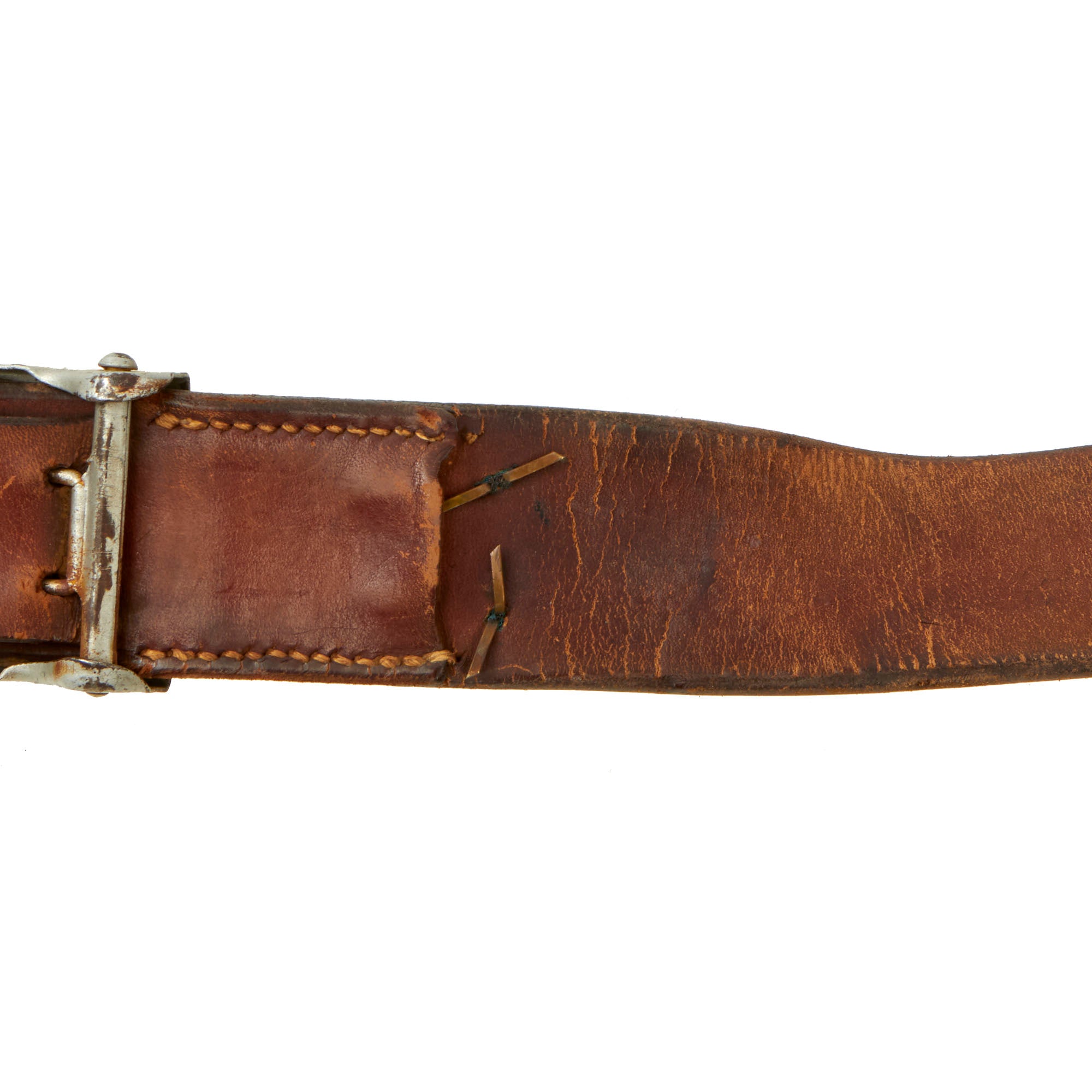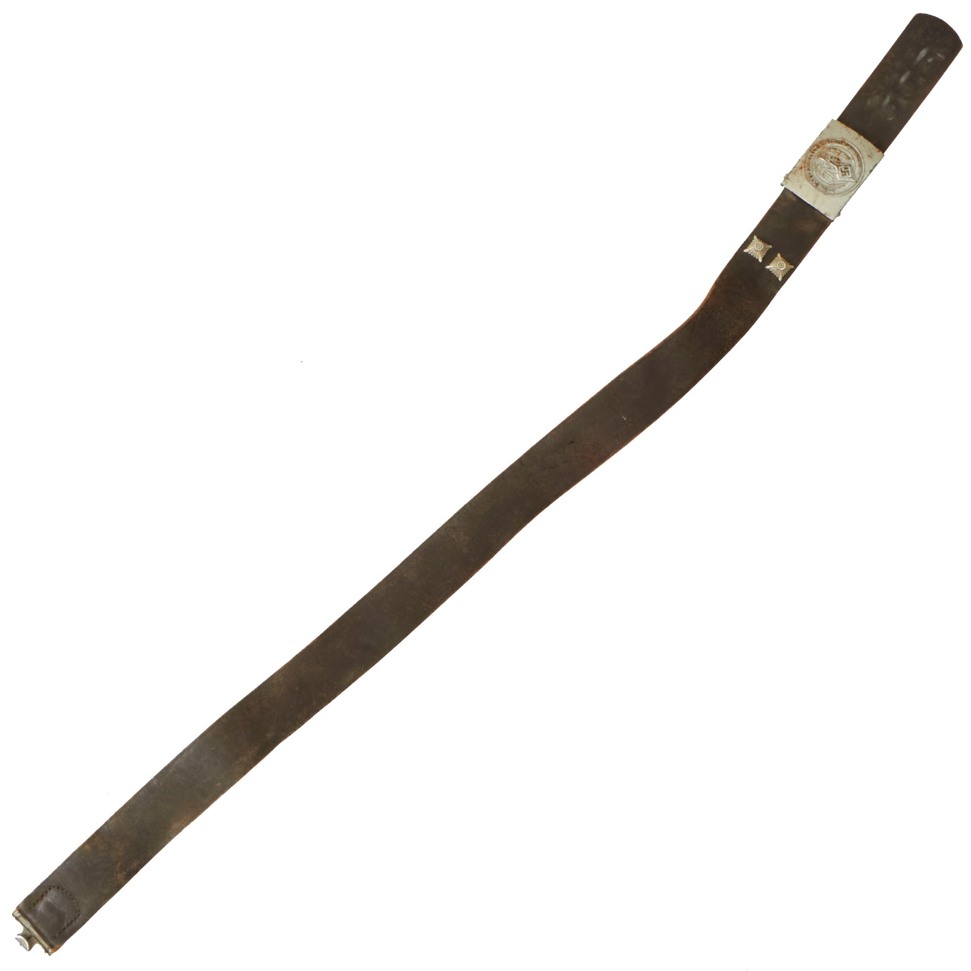 The belt shows heavy wear so it was likely worn for a long period. There are two small rank pips attached to the belt, the meaning of which is unknown. The other end metal piece is also marked with a maker’s mark.