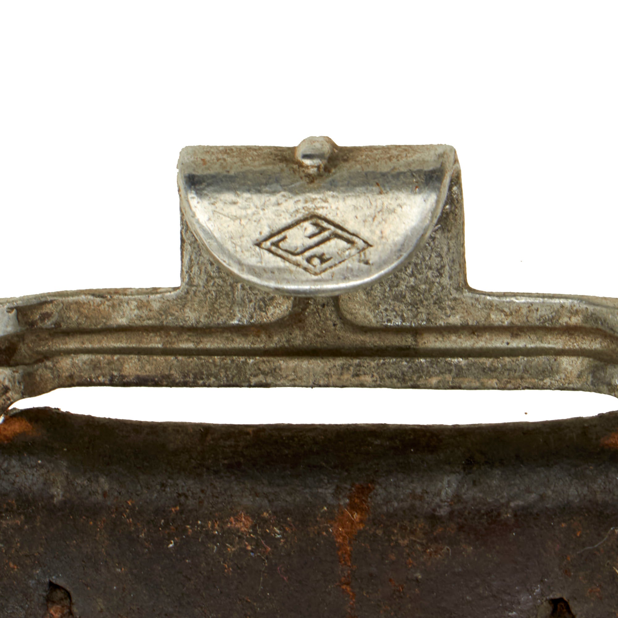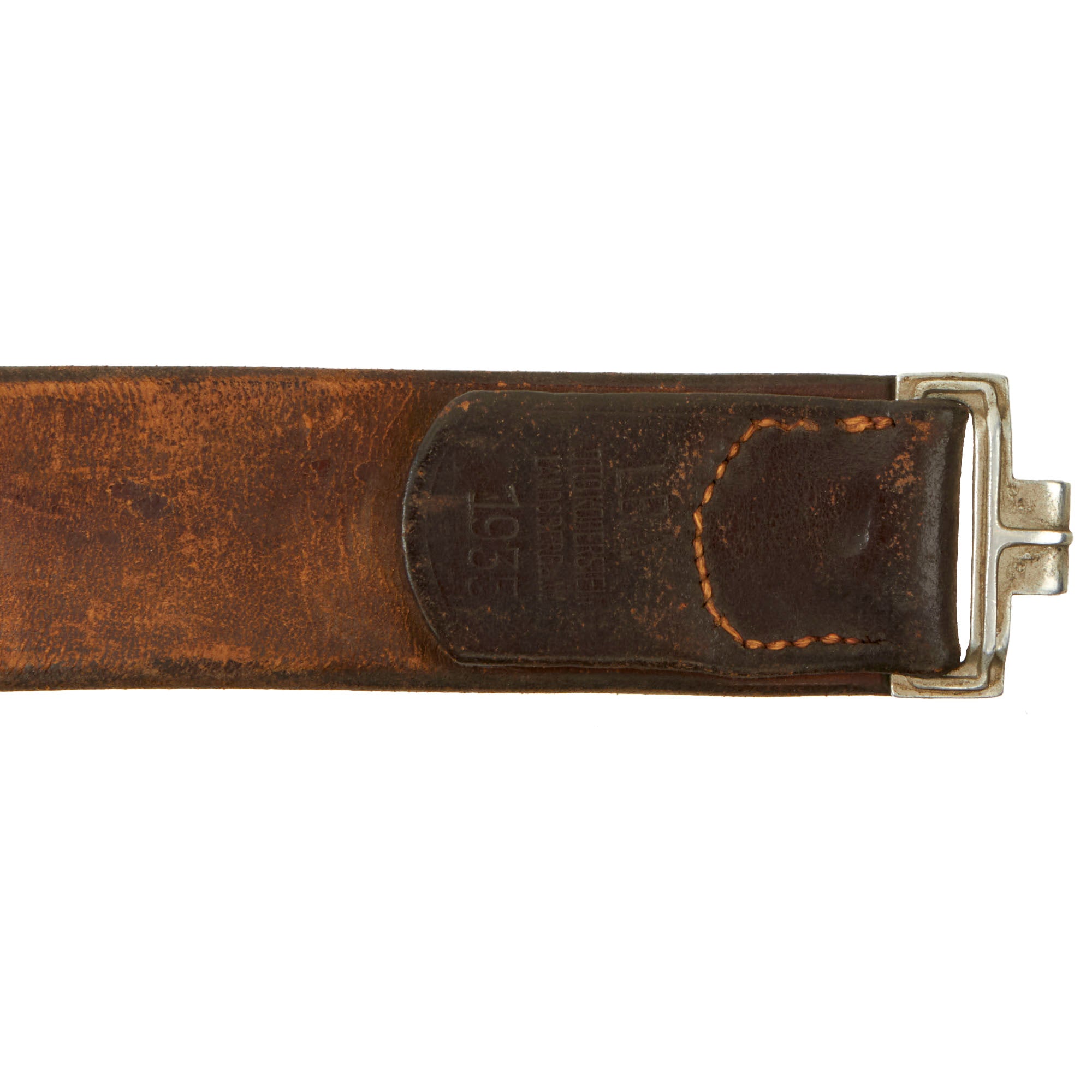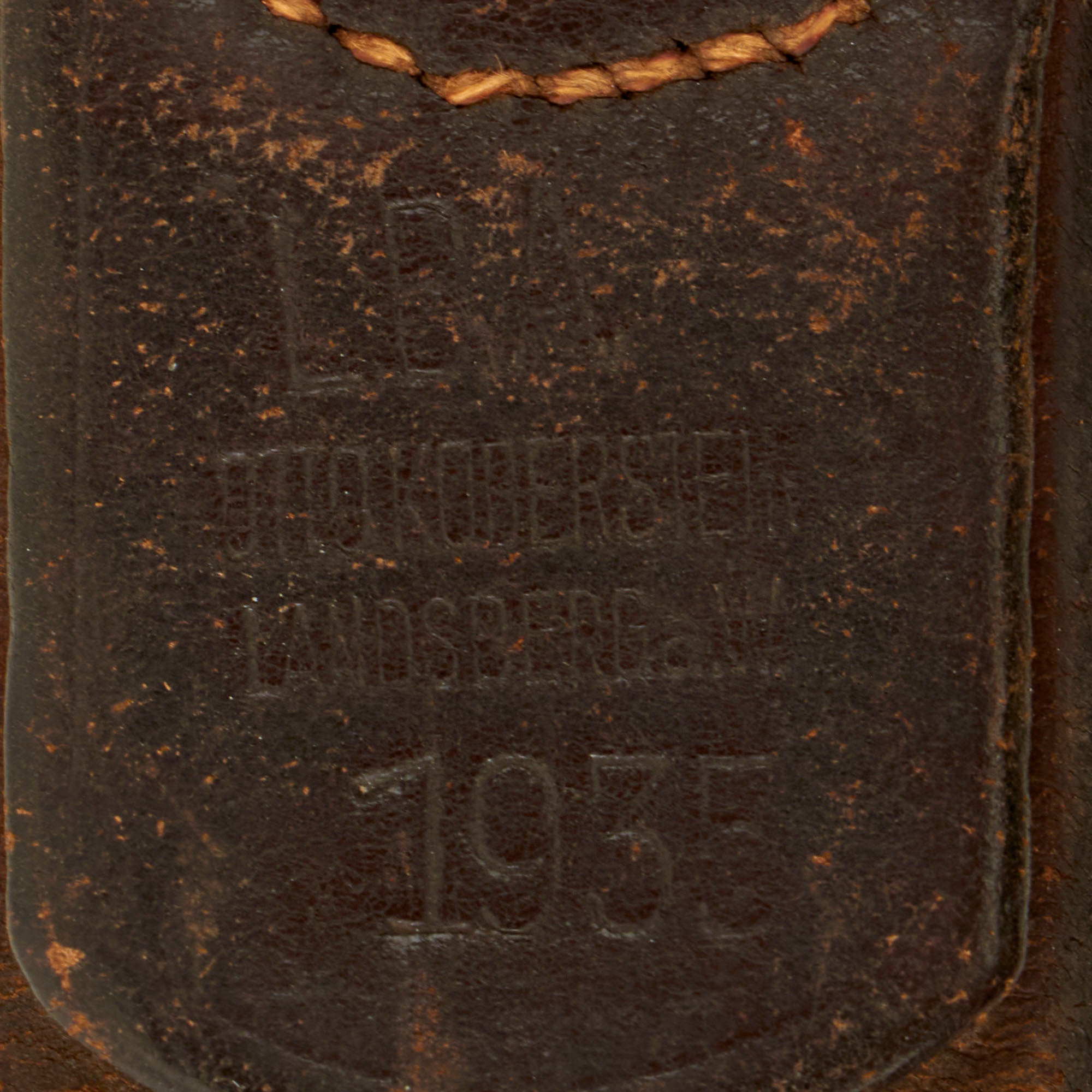 The thick leather belt is in good condition, but much of the black finish has worn off, and it measures about 38” when fully extended. It is marked size 85 on one end. The other end has a maker’s stamp for Otto Koberstein Landsberg.a.W. and a date of 1935. Above this is an L.B.A. stamp, for the Luftwaffebekleidungsamt, which means Air Force Clothing Office. This is a Luftwaffe belt, maybe issued to a HJ Flak Helper during the war.