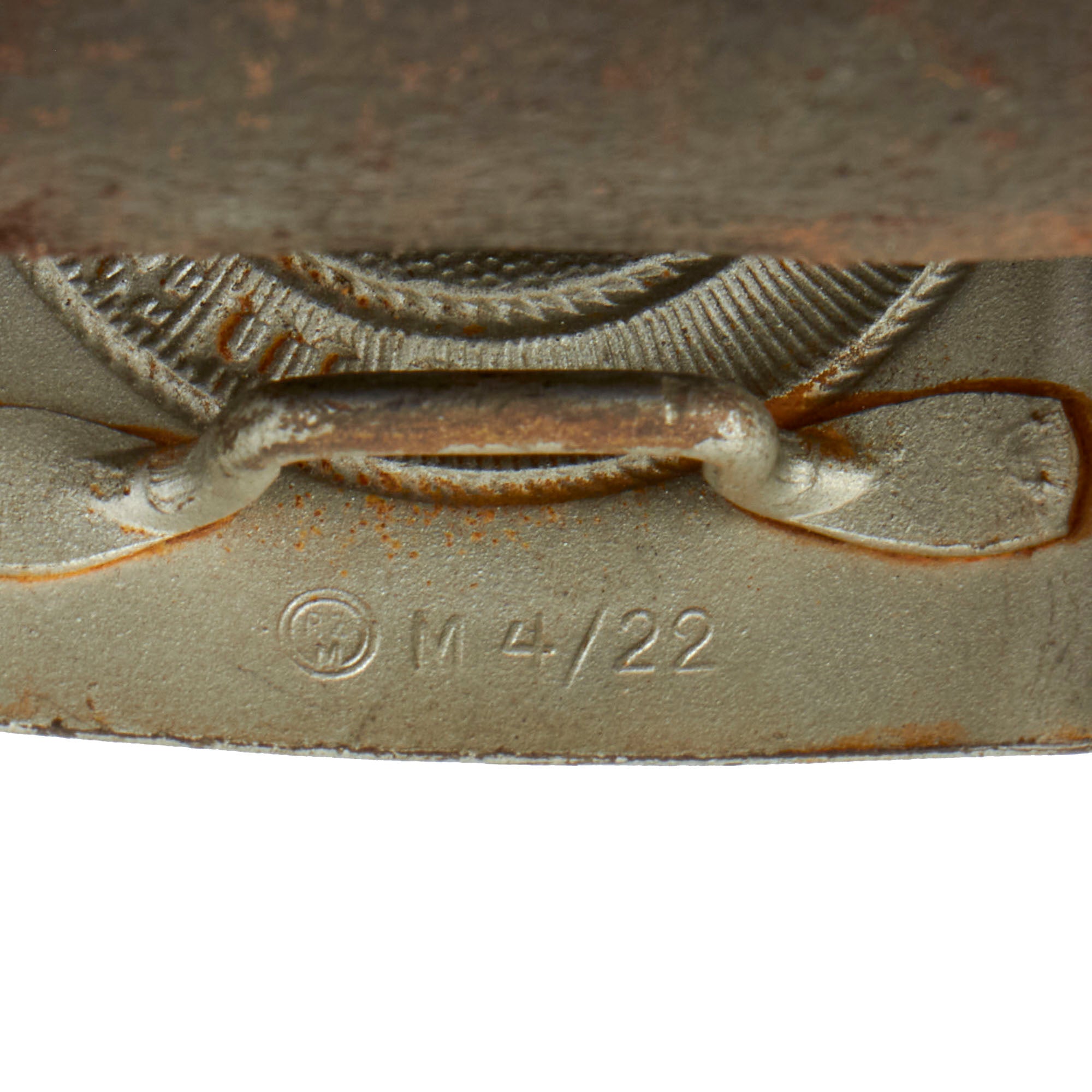 The Reichszeugmeisterei, or RZM, was was based at the Brown house in Munich and NSDAP party headquarters in Berlin. The RZM ensured that the manufacturers of military items were consistent in design, quality of materials and other characteristics of the items. It also defined standards of design, manufacturing and quality and published an authoritative color chart for textiles. The M4 in the code stands for belt buckles, contractor 22 stands for firm Christian Theodore Dicke.