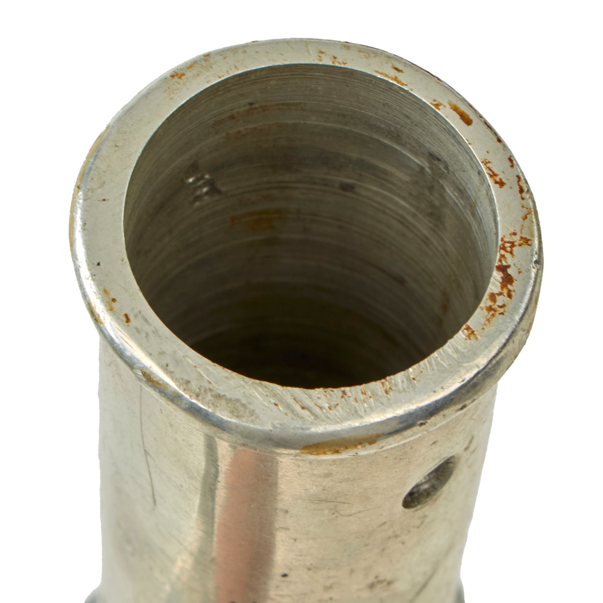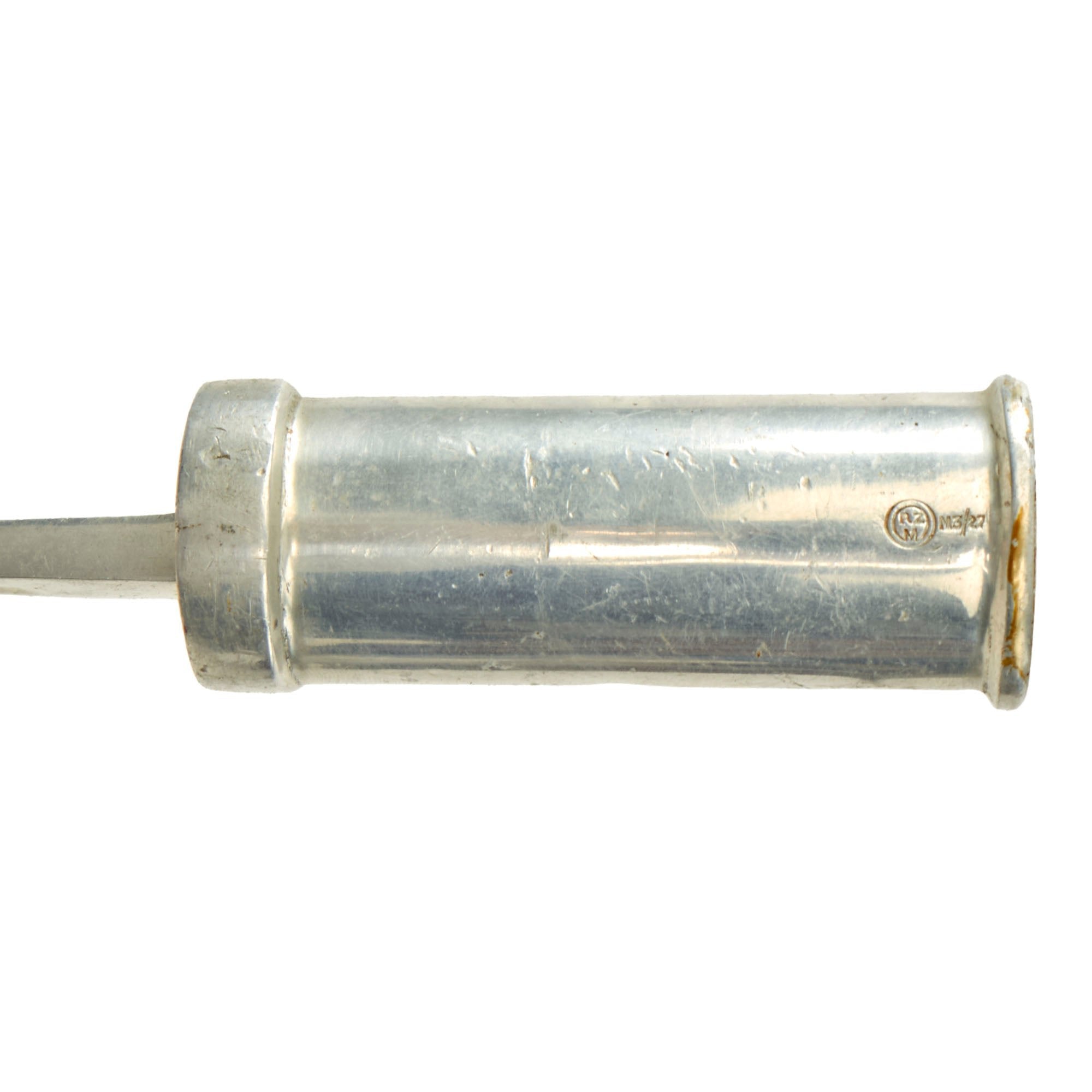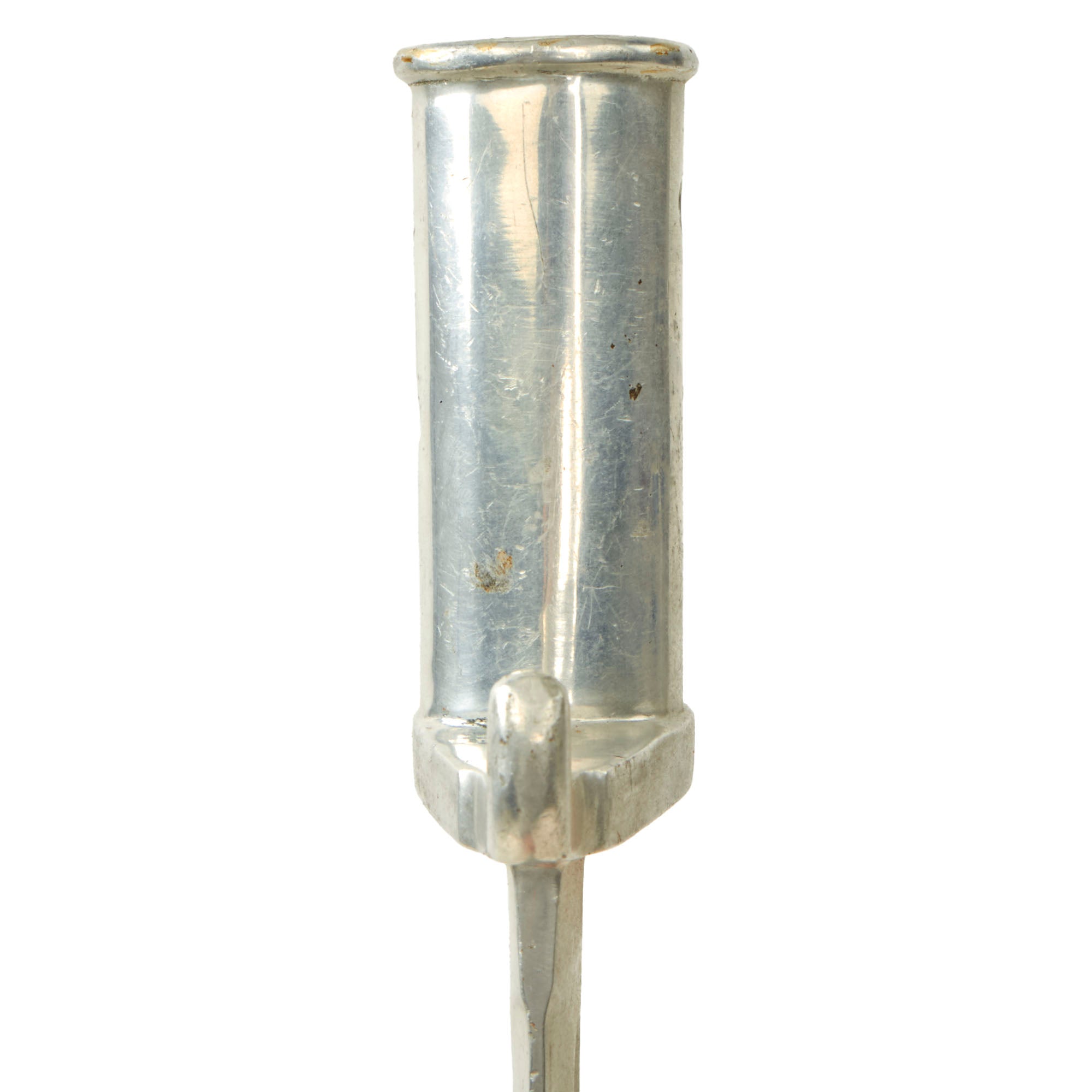 This is a very nice WWII German HJ Youth Flag Pole Finial or Topper (Fahnenstange Endstück). It is constructed of aluminum and is RZM Marked on the bottom, M3/27, indicating manufacture by I.H. Schmidt & Soehne of Iserlohn. The finial measures roughly 14¼” tall.