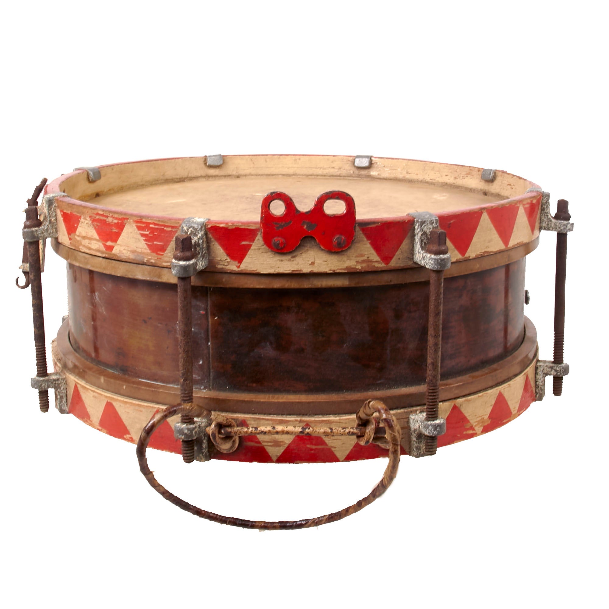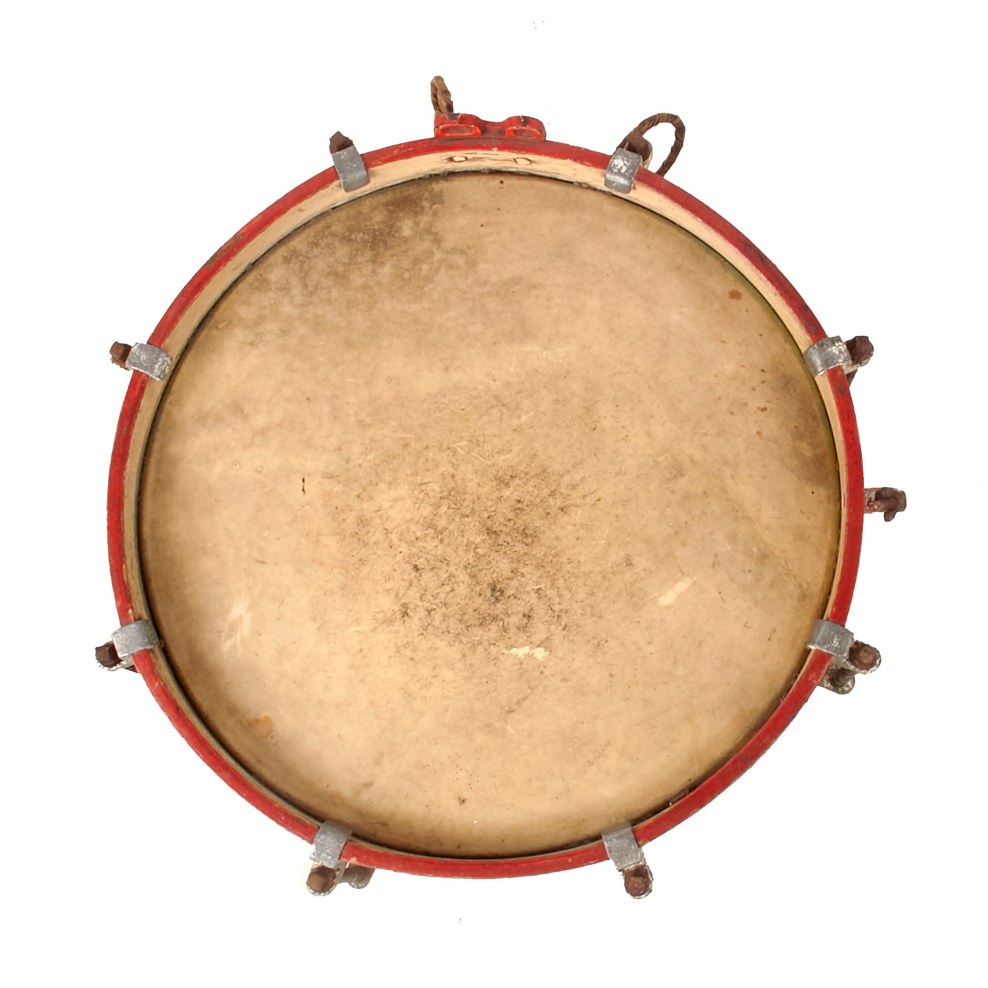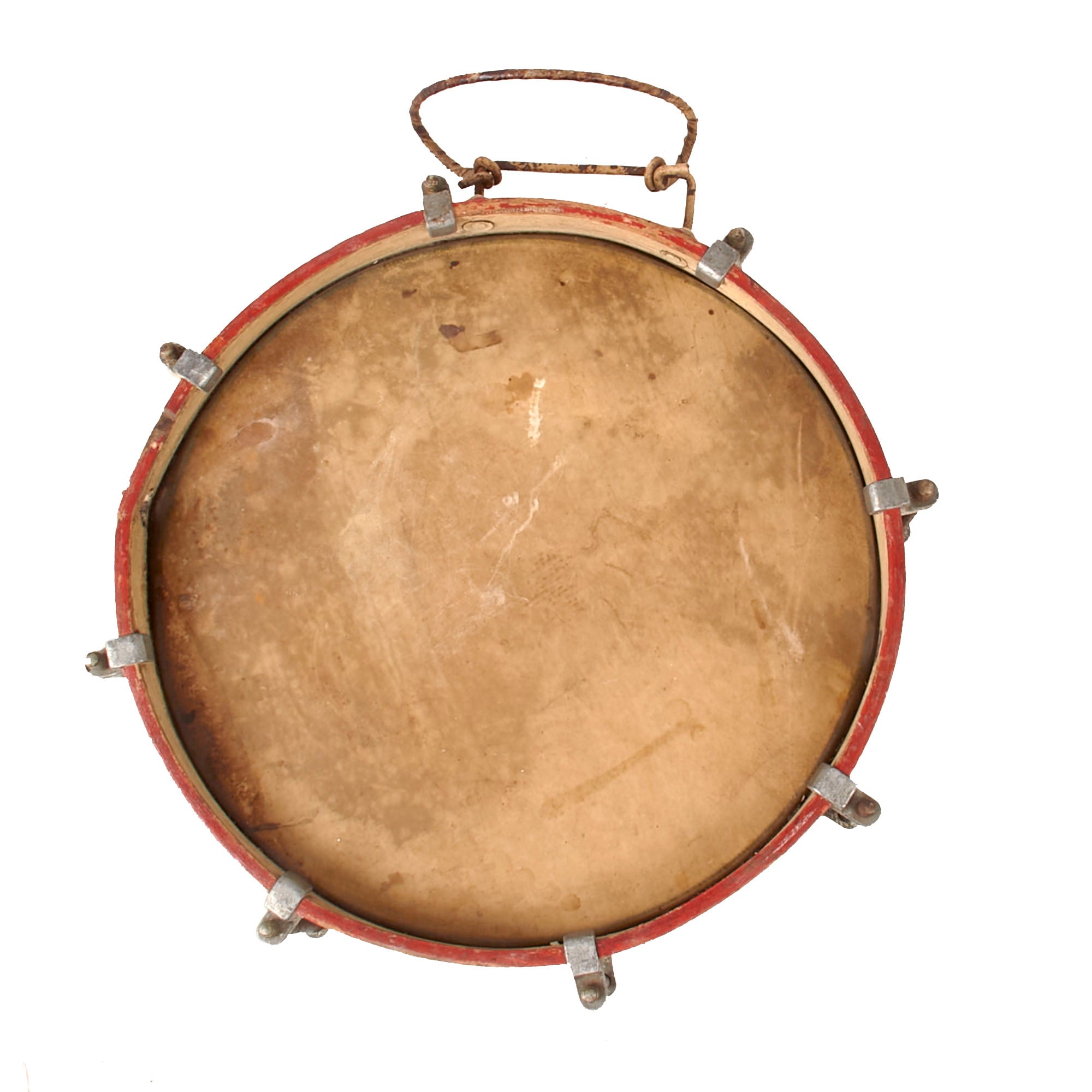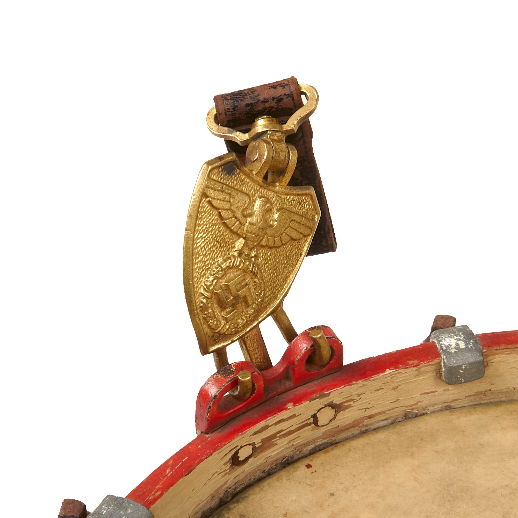 This original 3rd Reich Marschtrommel marching side drum was used in parades by the boys of the HJ National Youth Youth Organization. The drum body is of non-magnetic metal construction, measuring approximately 14"W x 4"D, and is fitted with sturdy 1 1/4" wooden rims, which are painted with the correct red and white diamond pattern. The lugs and tensioners are all steel, and feature large square heads on the ends. This example comes complete with the rare leather & brass hanger, which would be attached to the belt to hold the drum when not in use. It also comes with both original drumsticks.