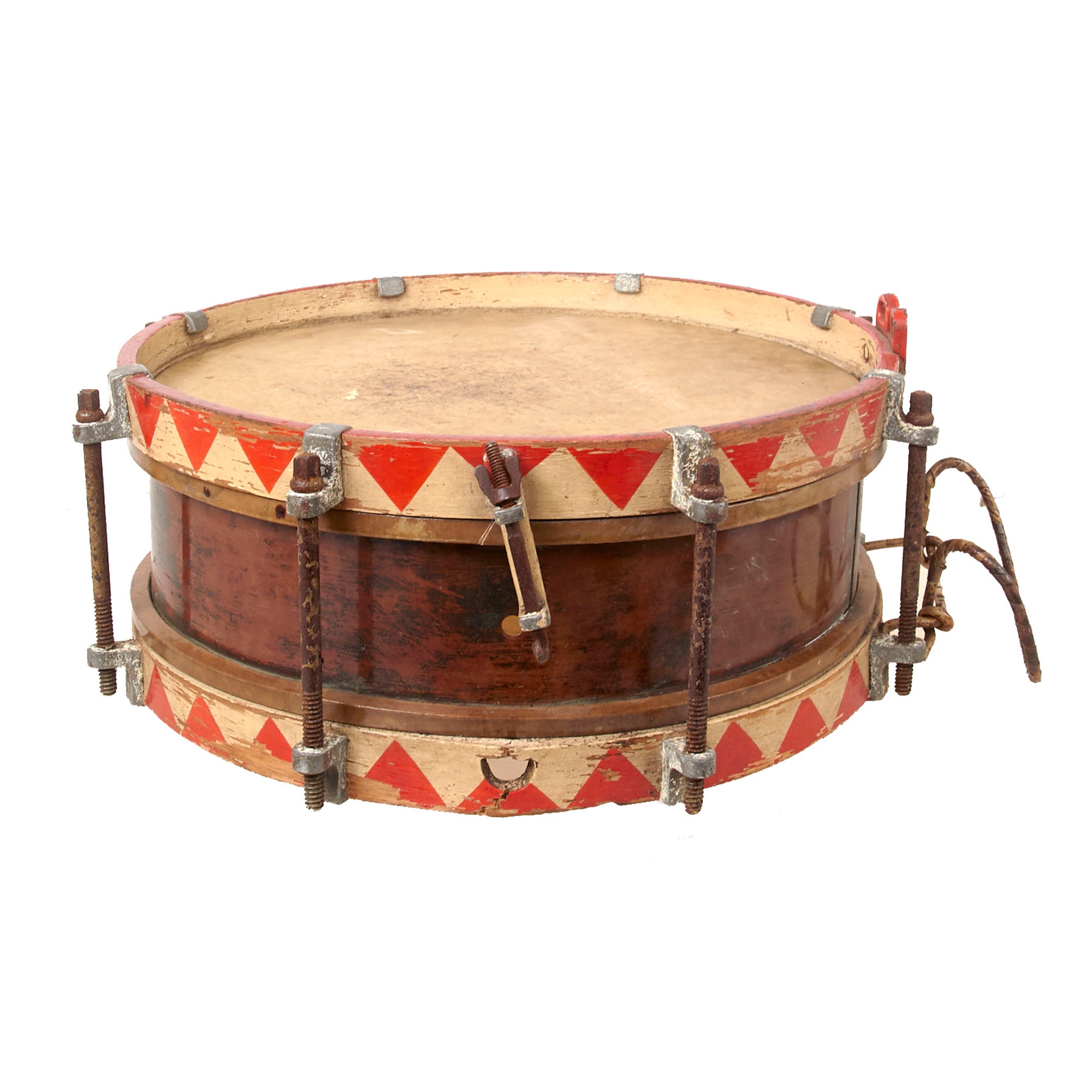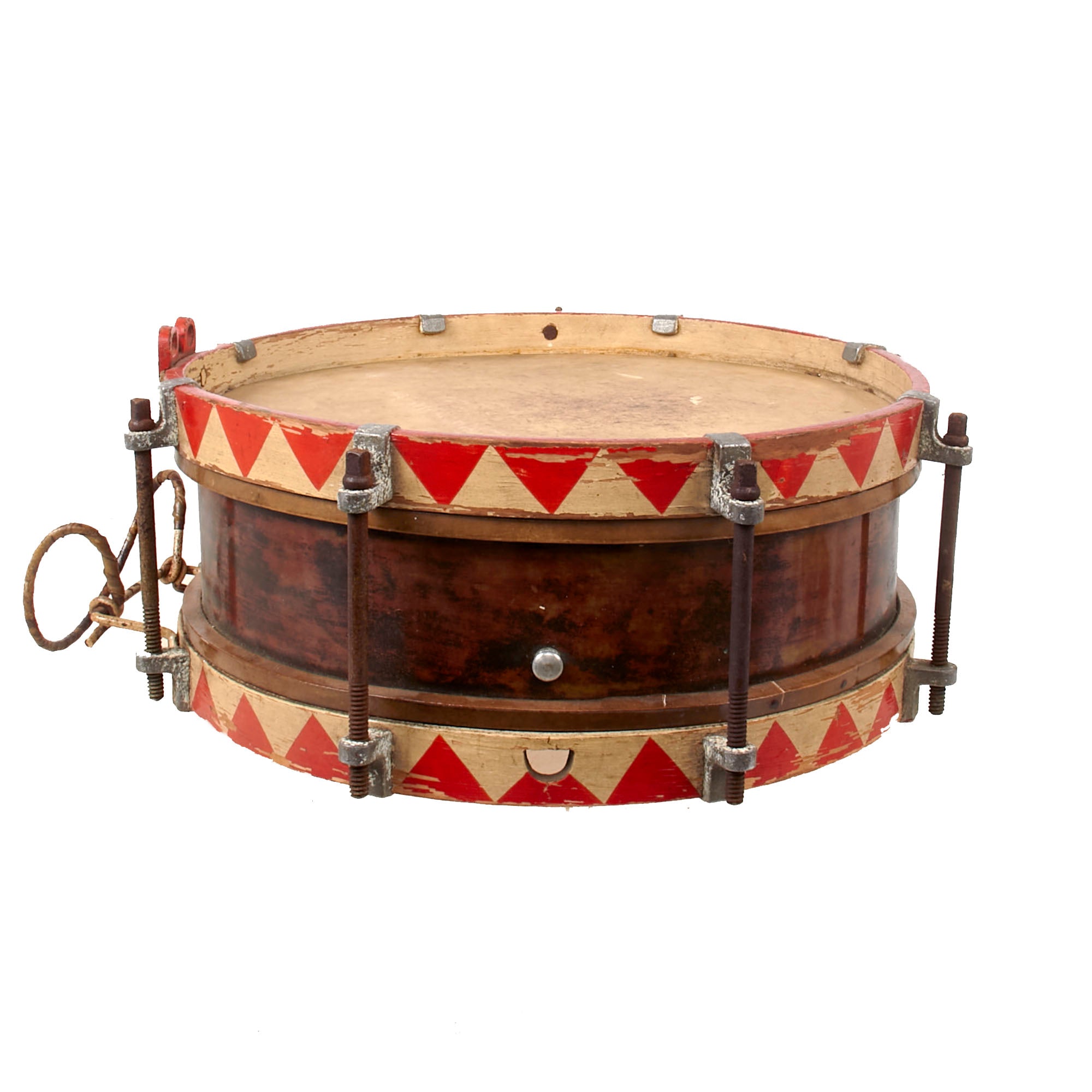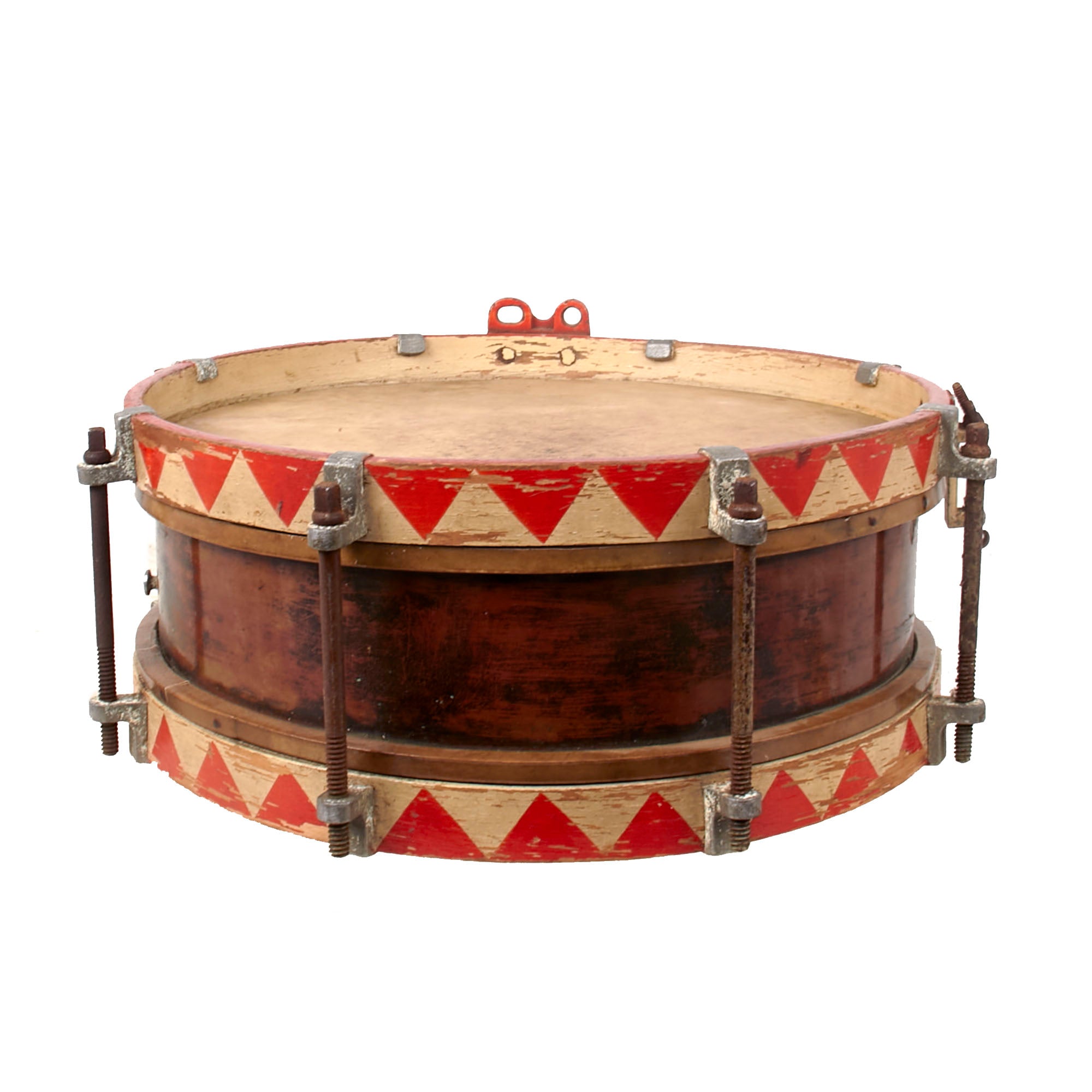 This original 3rd Reich Marschtrommel marching side drum was used in parades by the boys of the HJ National Youth Youth Organization. The drum body is of non-magnetic metal construction, measuring approximately 14"W x 4"D, and is fitted with sturdy 1 1/4" wooden rims, which are painted with the correct red and white diamond pattern. The lugs and tensioners are all steel, and feature large square heads on the ends. This example comes complete with the rare leather & brass hanger, which would be attached to the belt to hold the drum when not in use. It also comes with both original drumsticks.