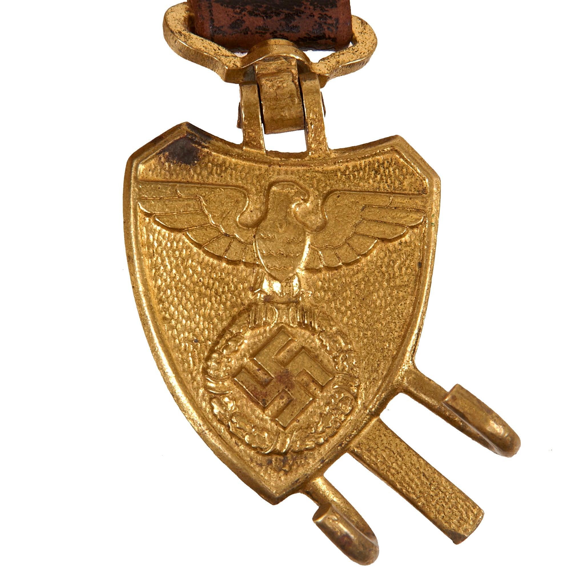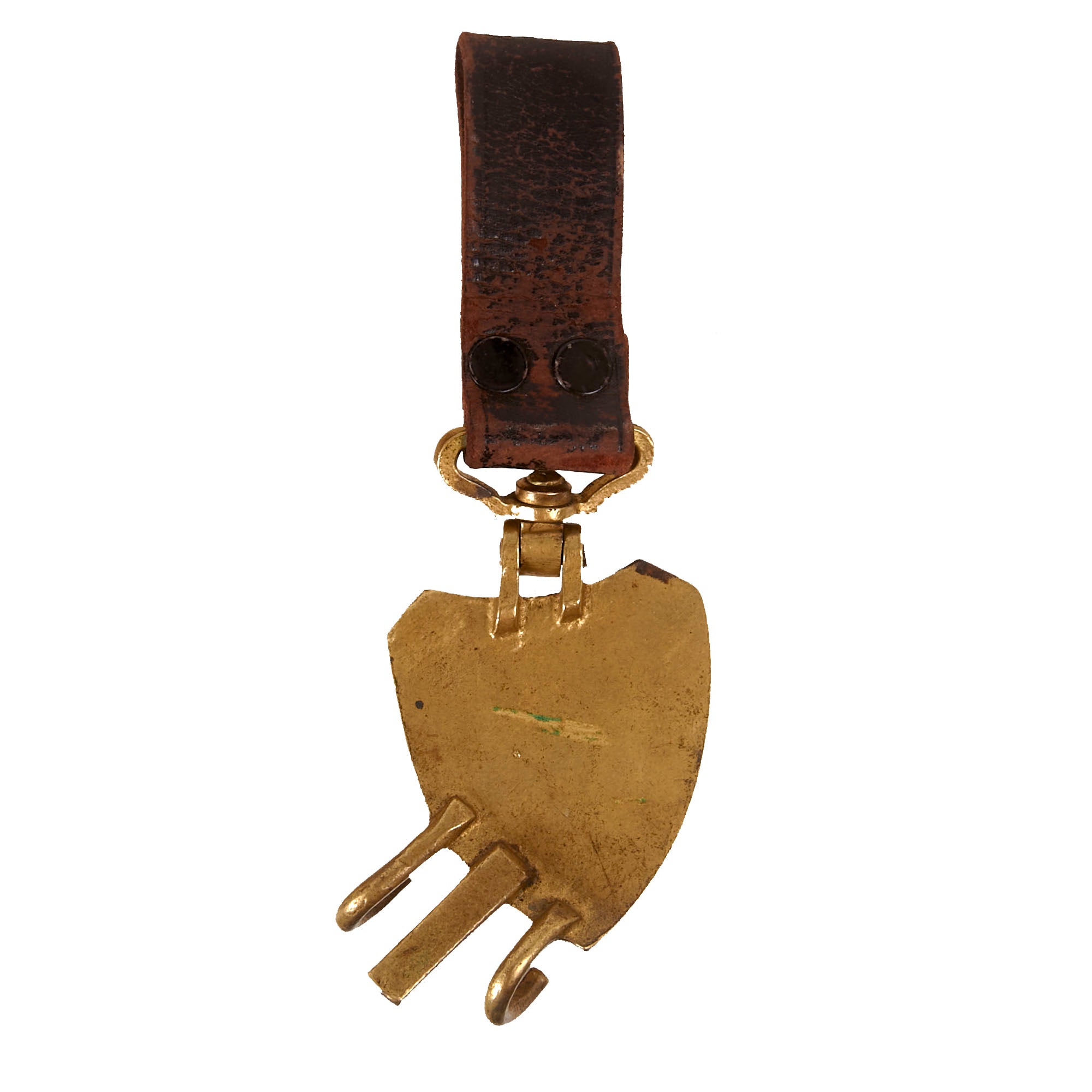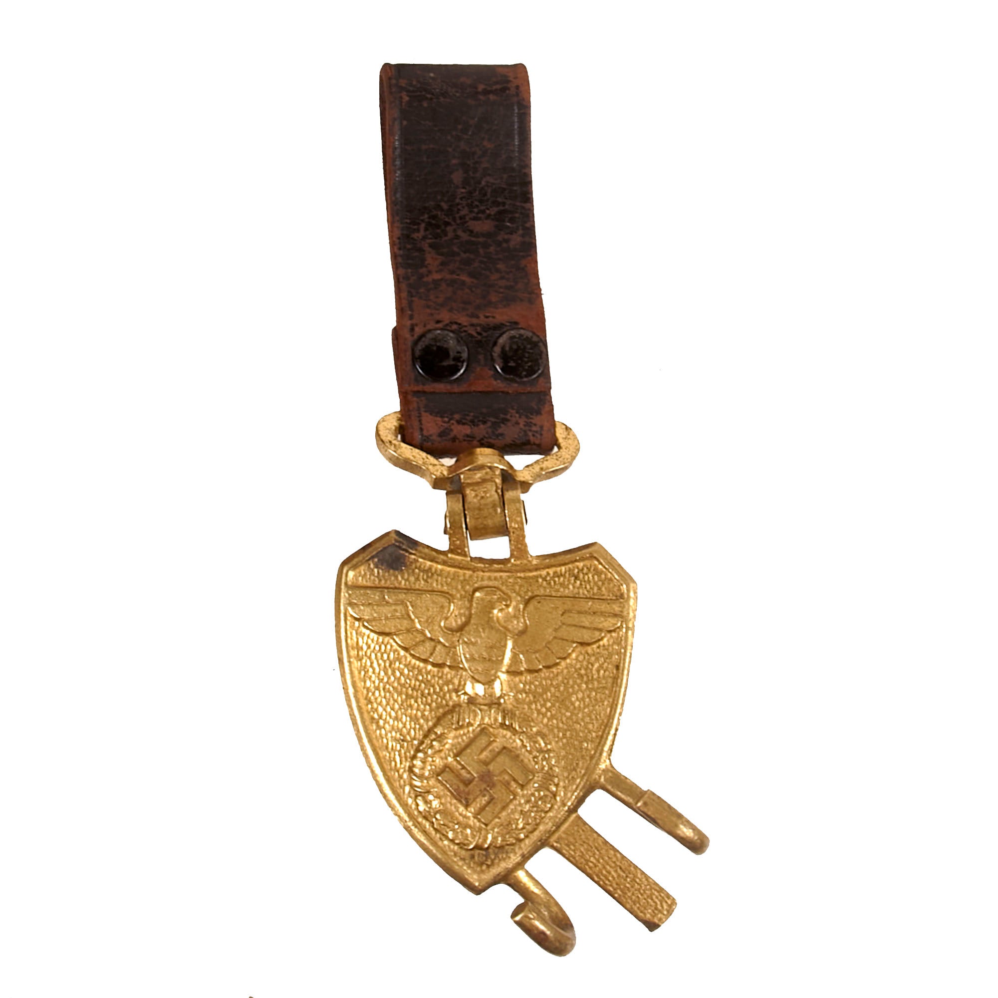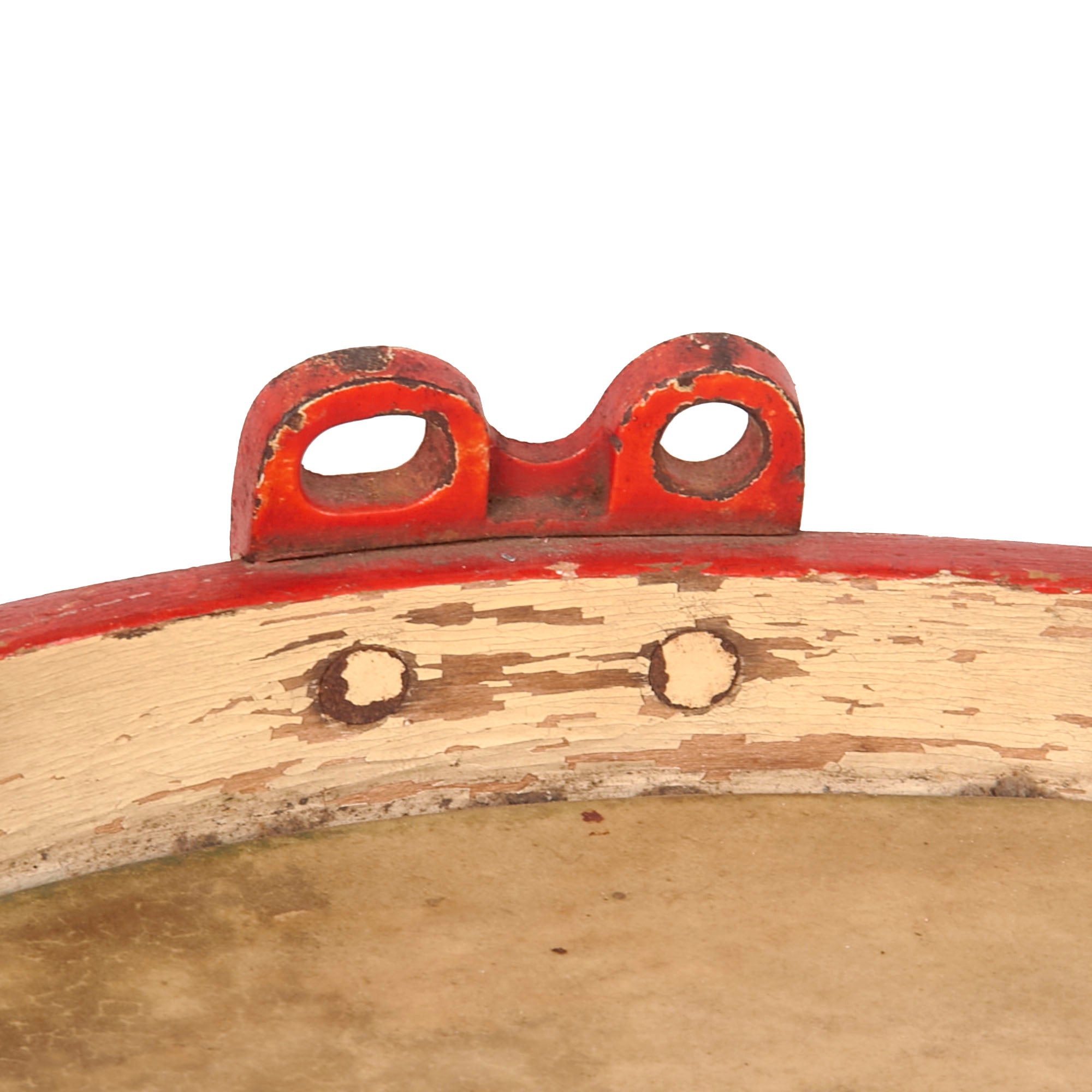 This original 3rd Reich Marschtrommel marching side drum was used in parades by the boys of the HJ National Youth Youth Organization. The drum body is of non-magnetic metal construction, measuring approximately 14"W x 4"D, and is fitted with sturdy 1 1/4" wooden rims, which are painted with the correct red and white diamond pattern. The lugs and tensioners are all steel, and feature large square heads on the ends. This example comes complete with the rare leather & brass hanger, which would be attached to the belt to hold the drum when not in use. It also comes with both original drumsticks.