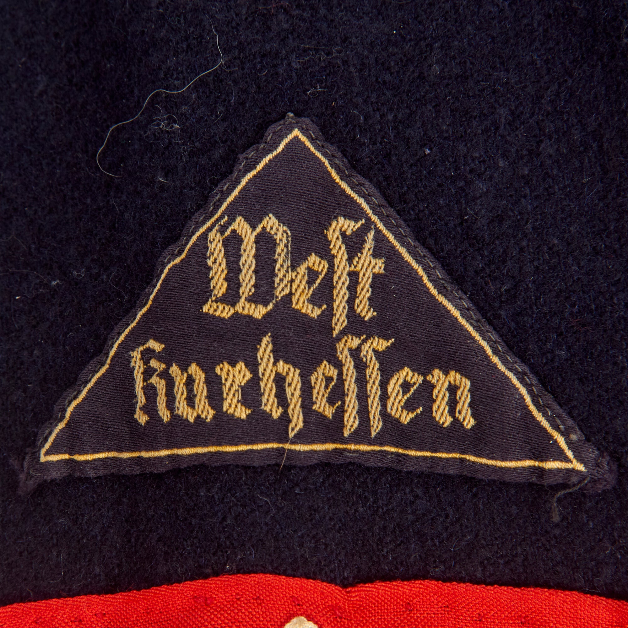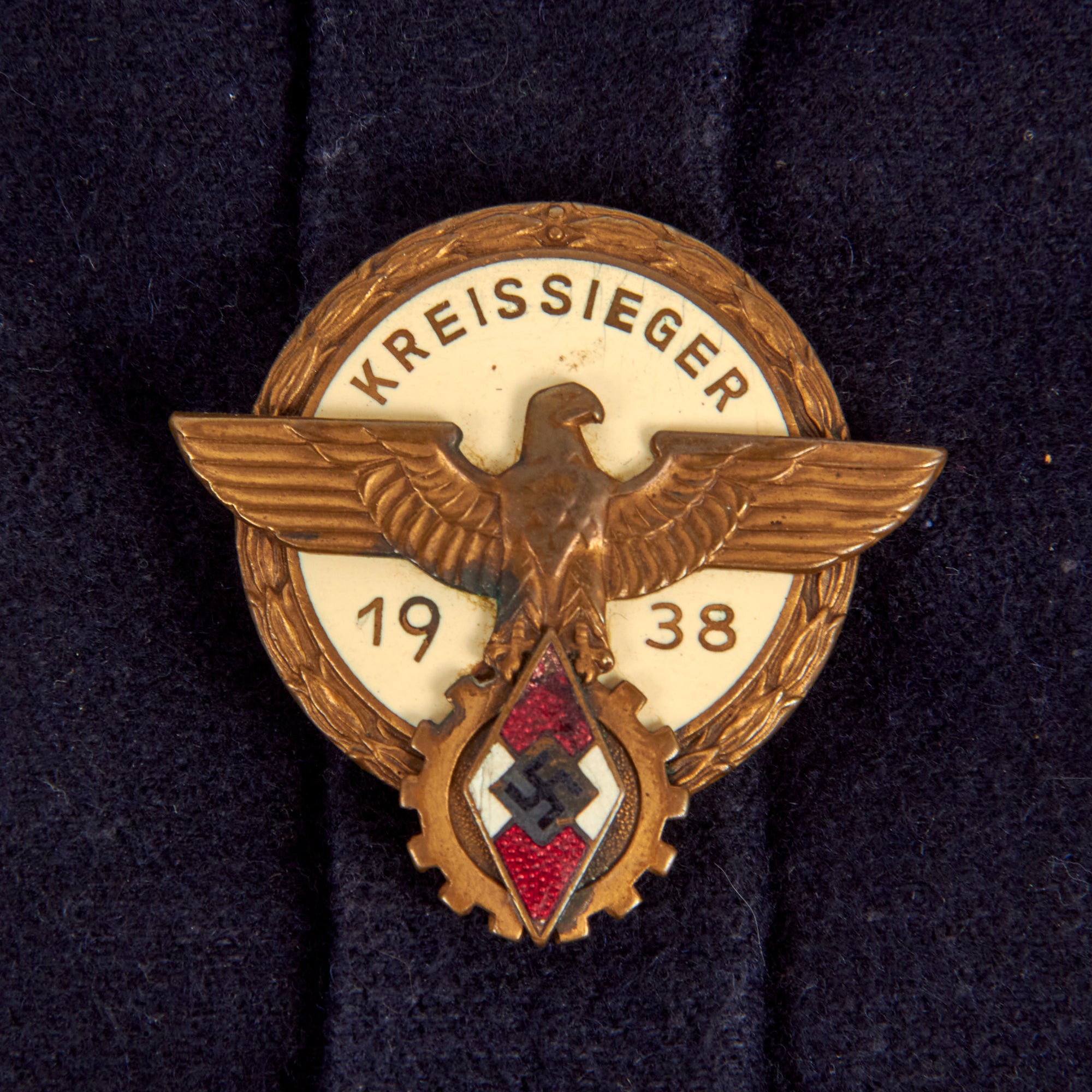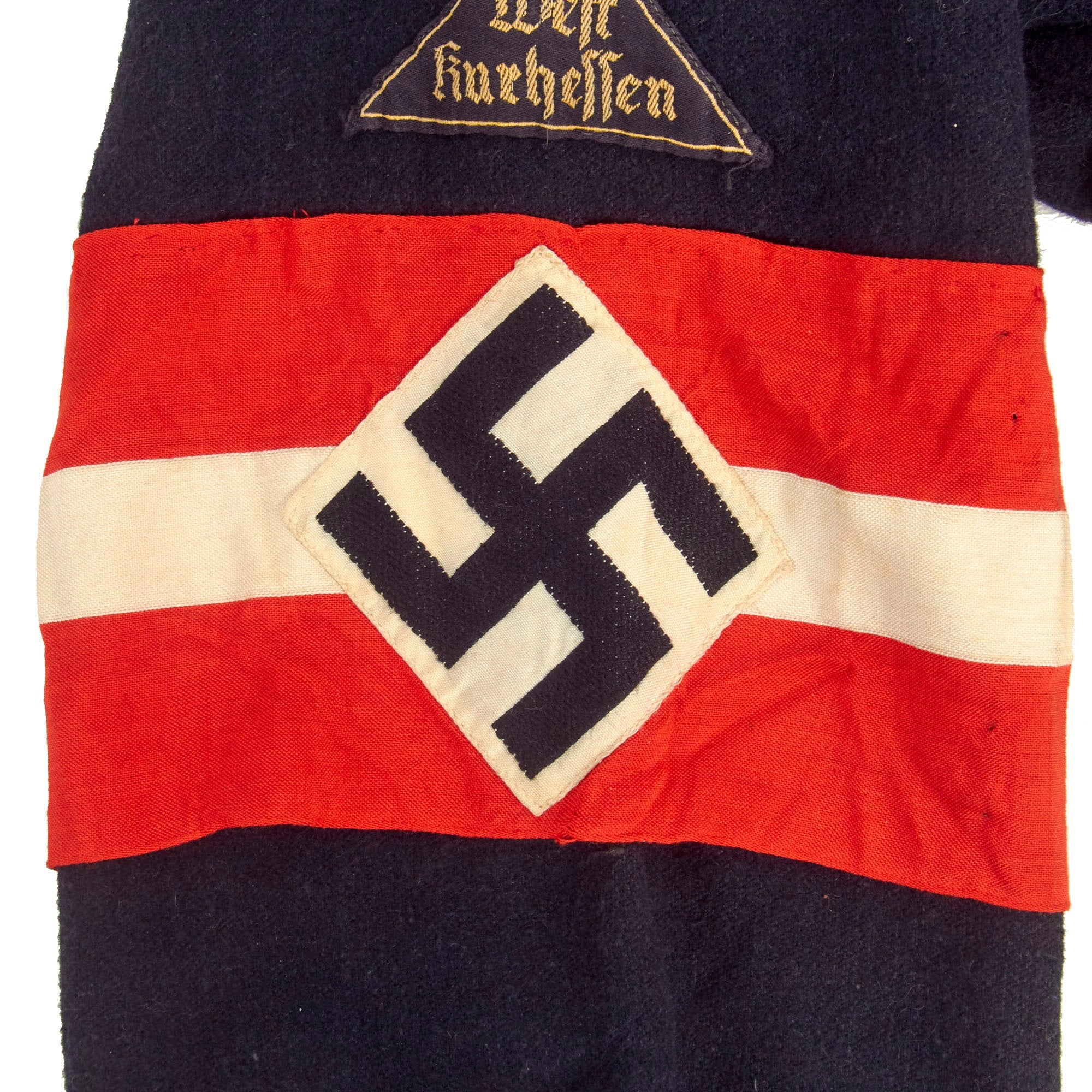 This very nice German WWII HJ National Youth organization complete uniform set from the district of West Kurhessen, complete with some youth organization related documents and pictures. There were several styles of uniforms utilized by the HJ, and this example has the cap, tunic, and breeches all a very nice dark navy blue color. The shoulder strap insignia have a single rank "Pip", indicating the rank of Kameradschaftsführer (Comrade Unit Leader), which is about the same as an Unteroffizier / Corporal. The strap is also marked with Bann number 945 and company number 11, with a Red & White leadership lanyard attached to the left shoulder. The uniform also has a 1938 dated KREISSIEGER "District Winner" HJ sports badge attached the front, and the correct West / Kurhessen district triangle on the left shoulder. Below this is the standard HJ National Youth Organization Armband Insignia.