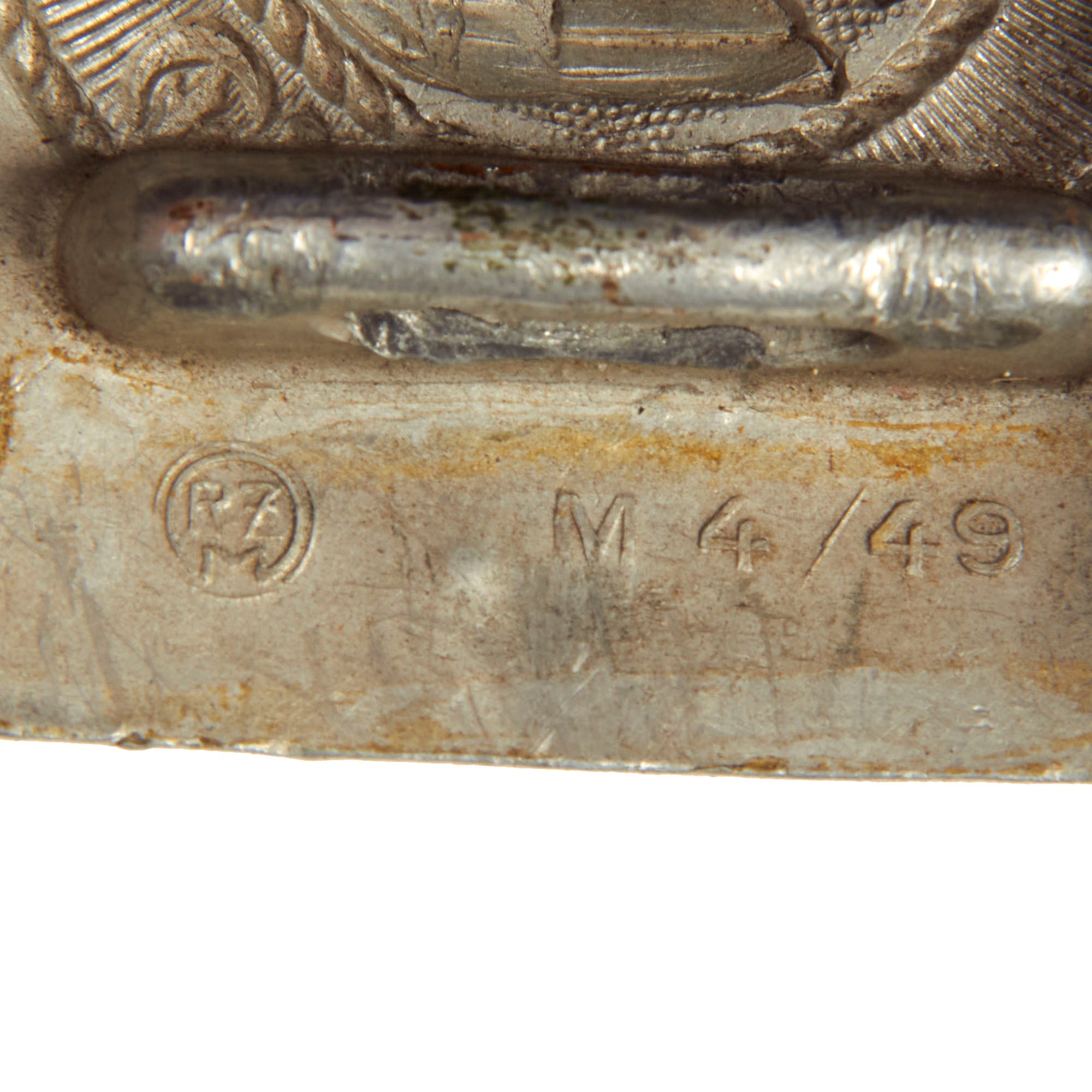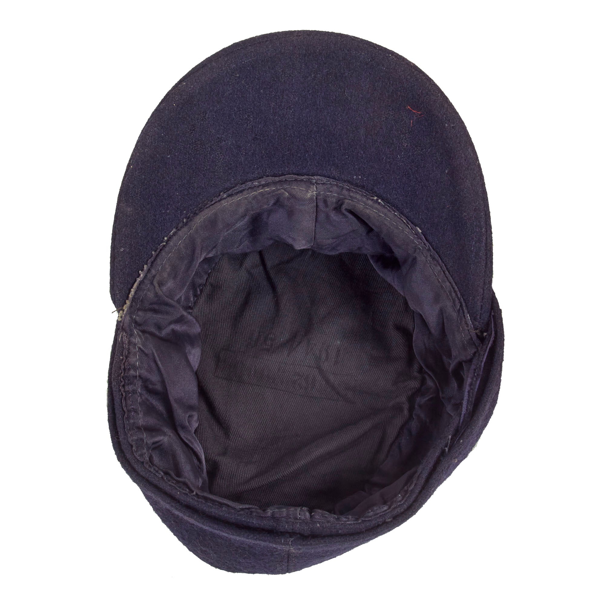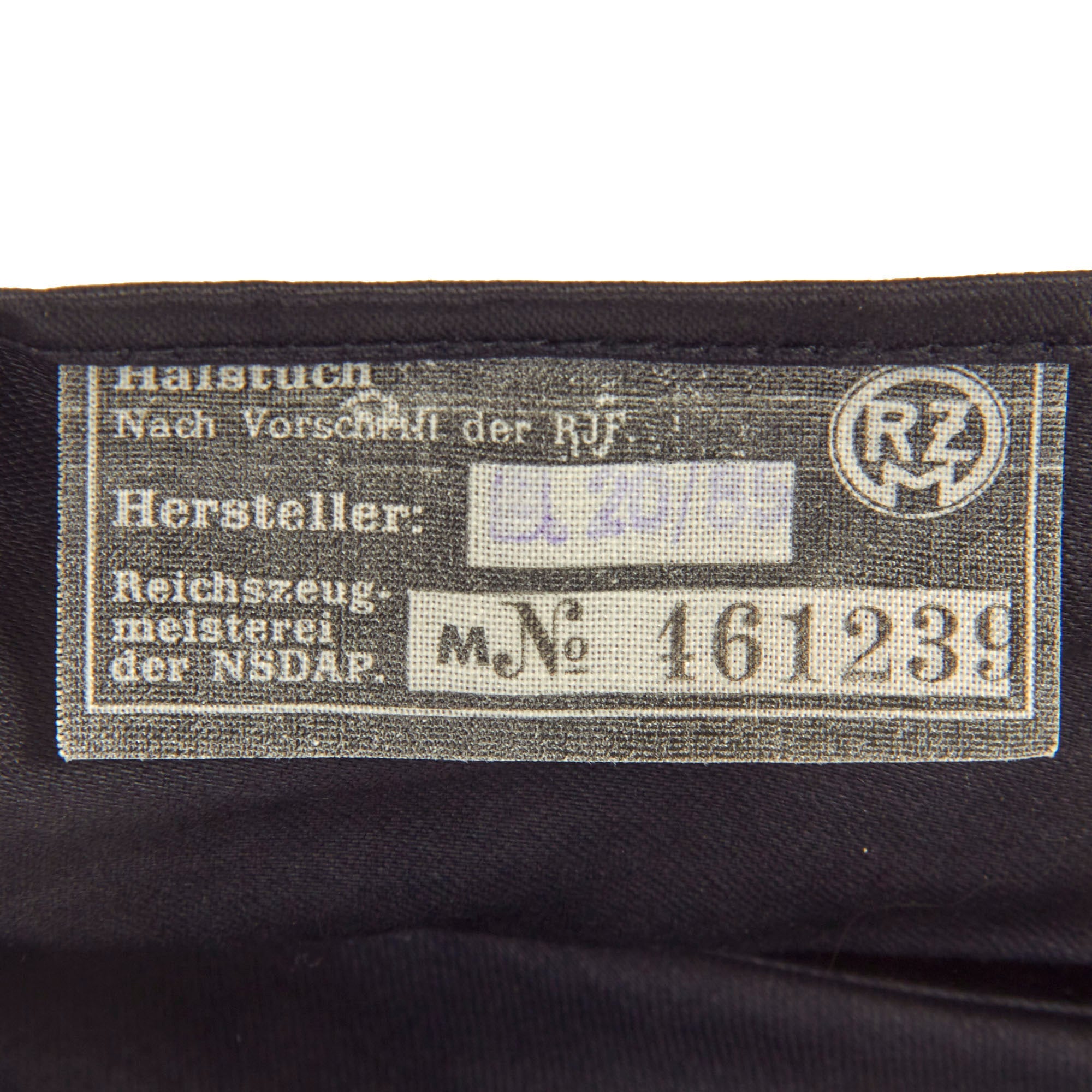The uniform set is outfitted with the correct leather knife belt and maker marked aluminum buckle, as well as a leather cross strap. Around the neck is the correct HJ Scarf / Kerchief, with a leather scarf knot, and the set is completed with a very nice black HJ Field cap with fold down sides. Many of the items still have their original labels and RZM tags, and as far as we can tell are totally correct.